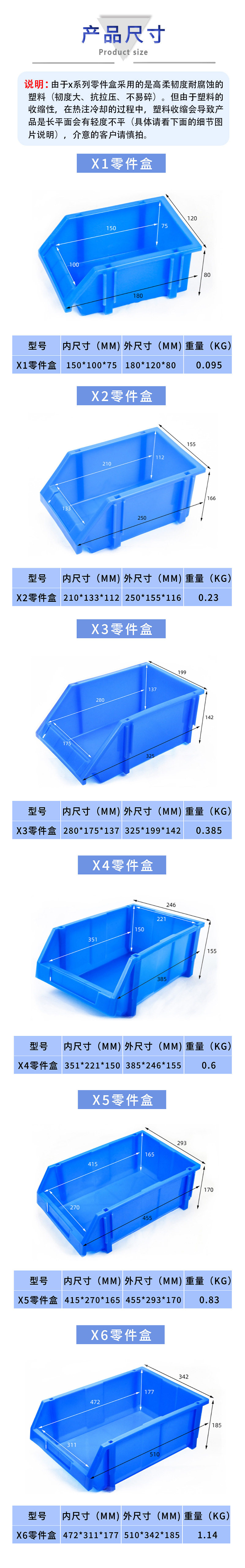 | Specification | X-1 parts box 180*120*80,X-6 parts box 510*345*190,X-2 parts box 250*155*116,X-3 parts box 325*199*142,X-4 parts box 385*246*155,X-5 parts box 455*293*170,R-7 parts box 600*400*220 |