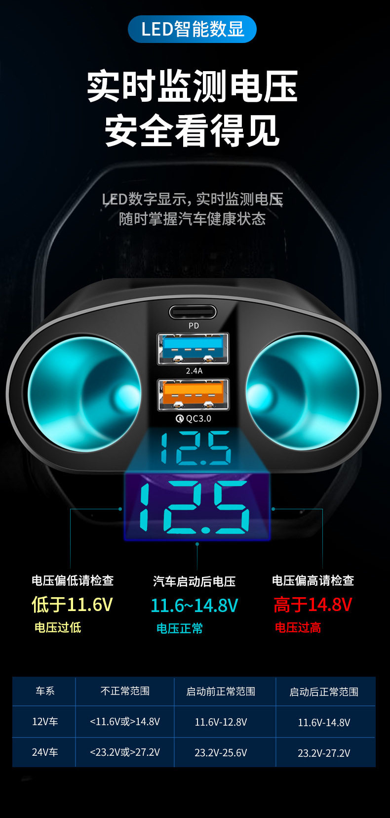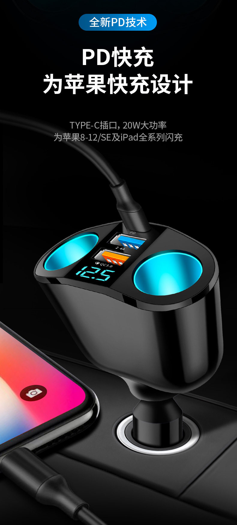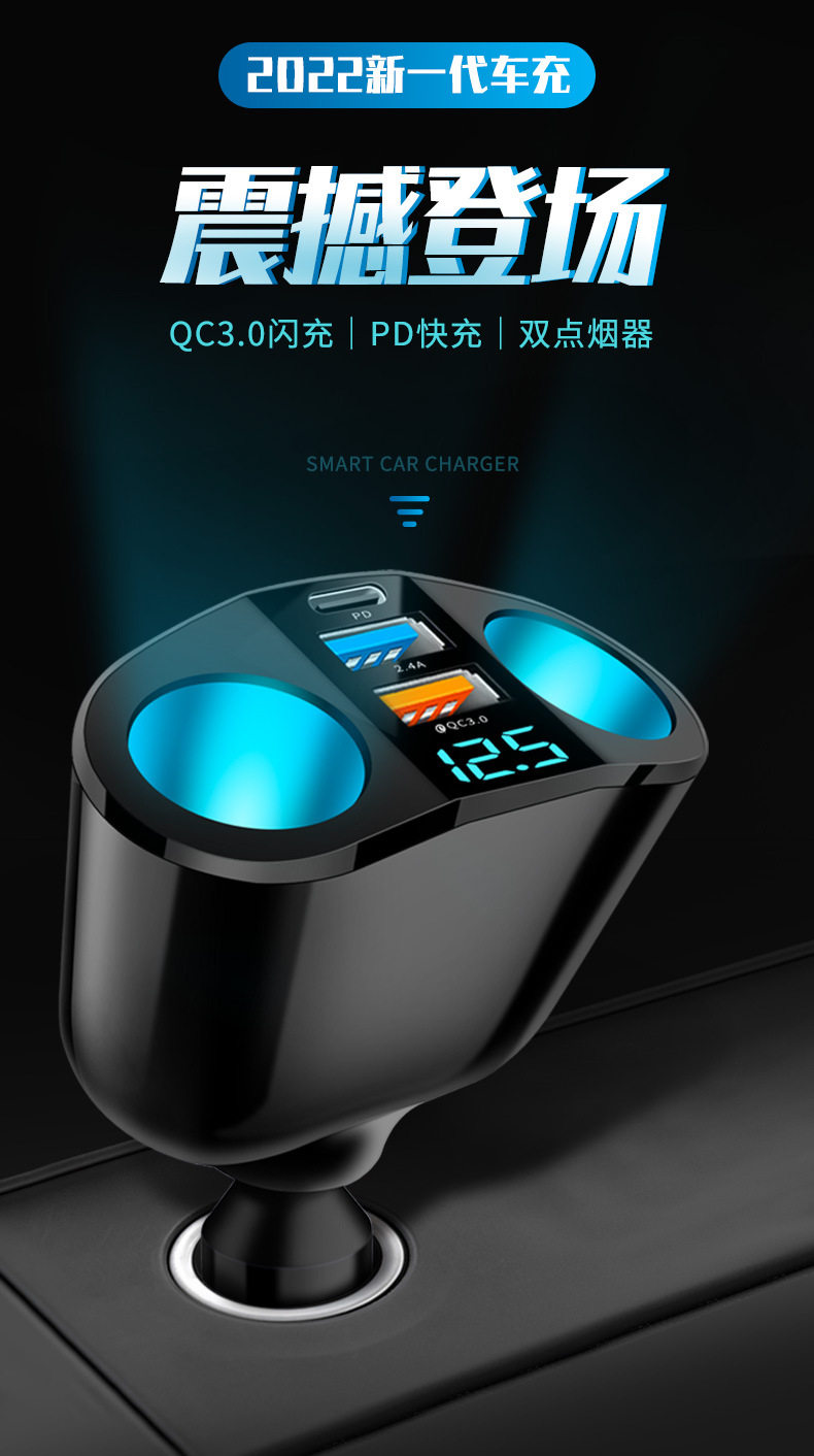 New Dual USB Type-C Car Charger Digital Display Qc3.0 Fast Charging Multi-Function Cigarette Lighter Expansion Car Charger