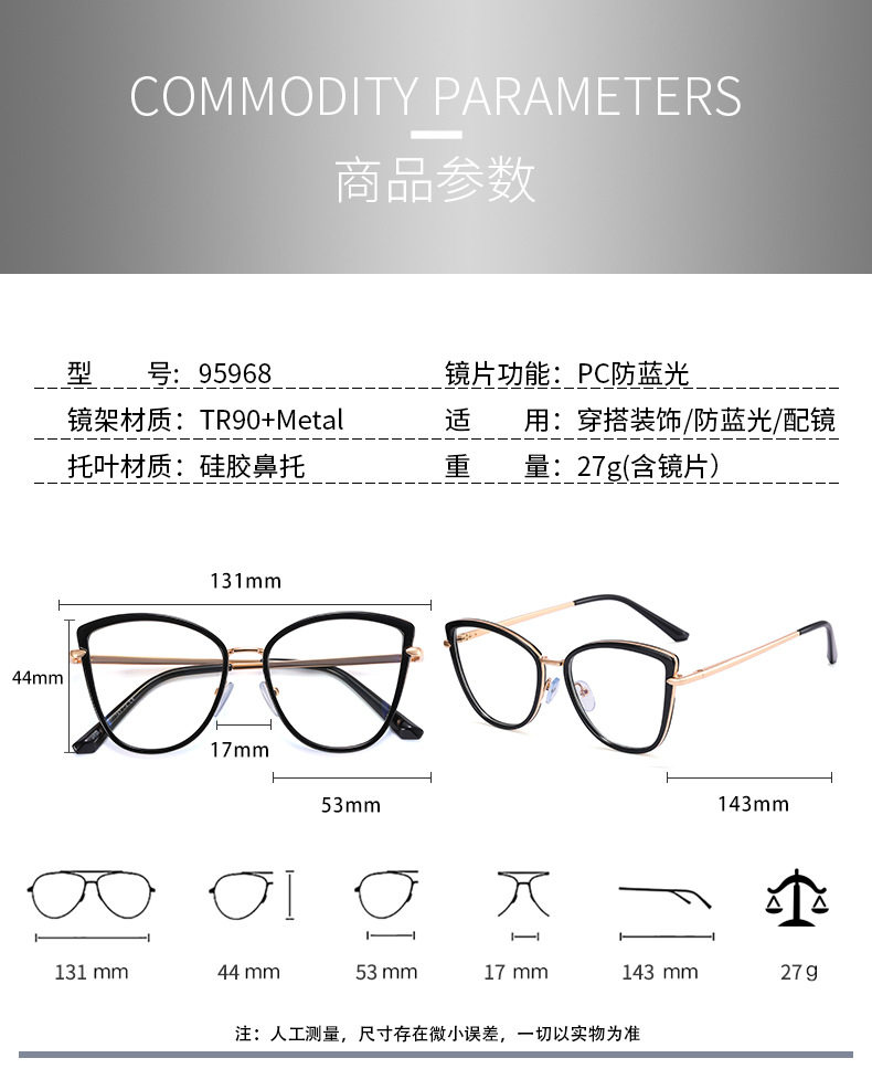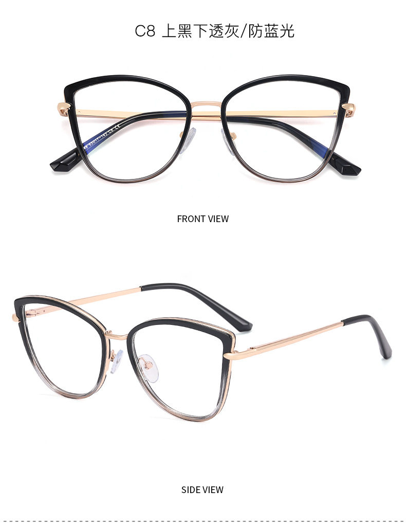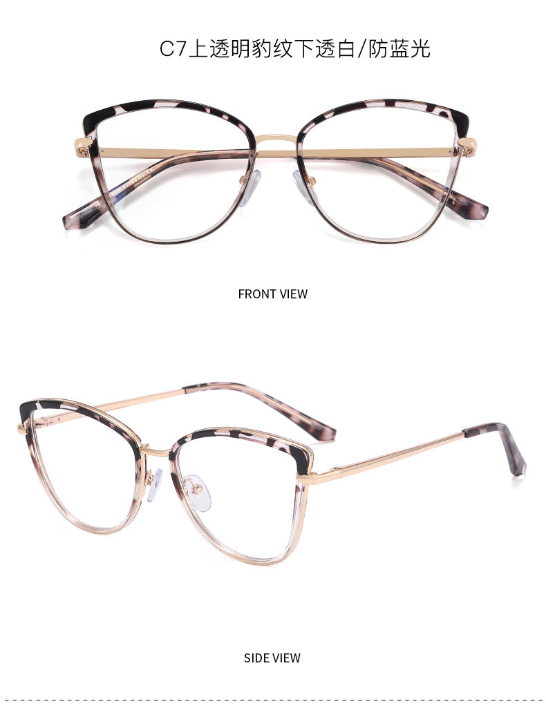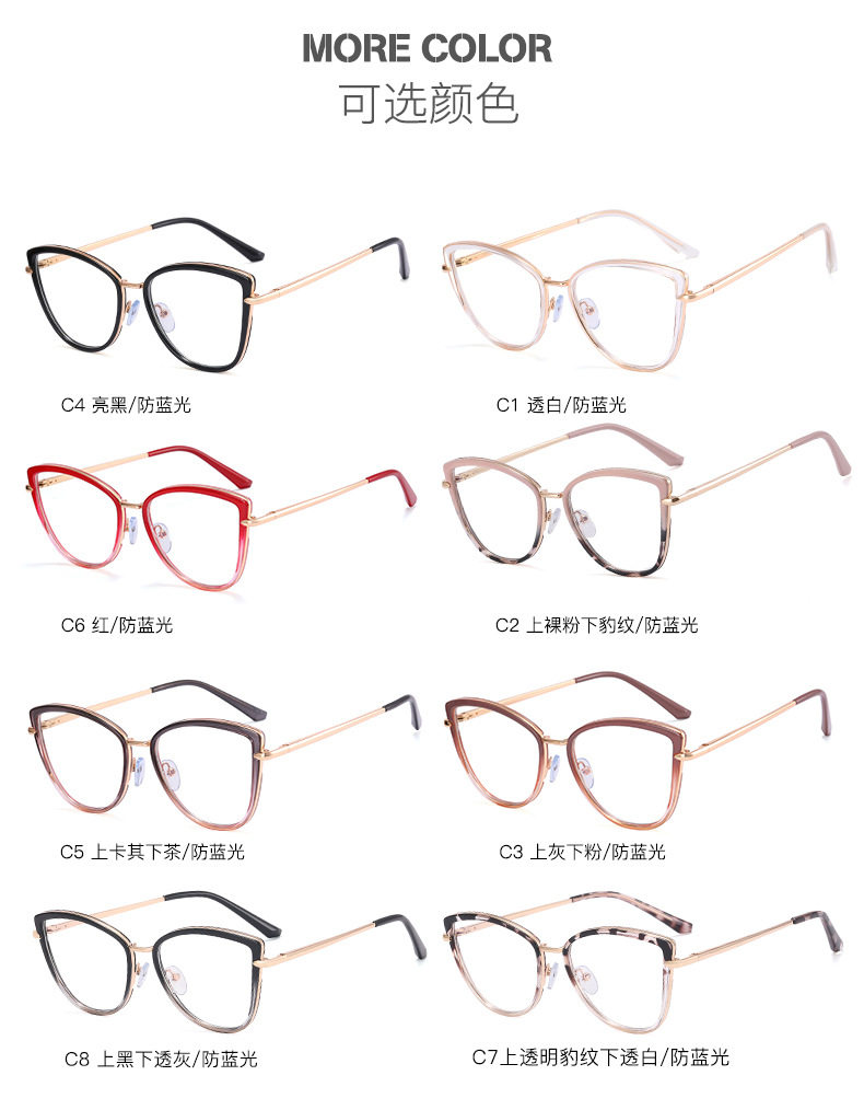 | Frame color | C1 transparent White/anti-blue light,C2 bare pink leopard print/anti-blue light,C3 dust and powder/anti-blue light,C4 bright black/anti-blue light,C5 khaki tea/anti-blue light,C6 red/anti-blue light,C7 transparent leopard print transparent White/anti-blue light,C8 Upper Black and lower transparent gray/anti-blue light |