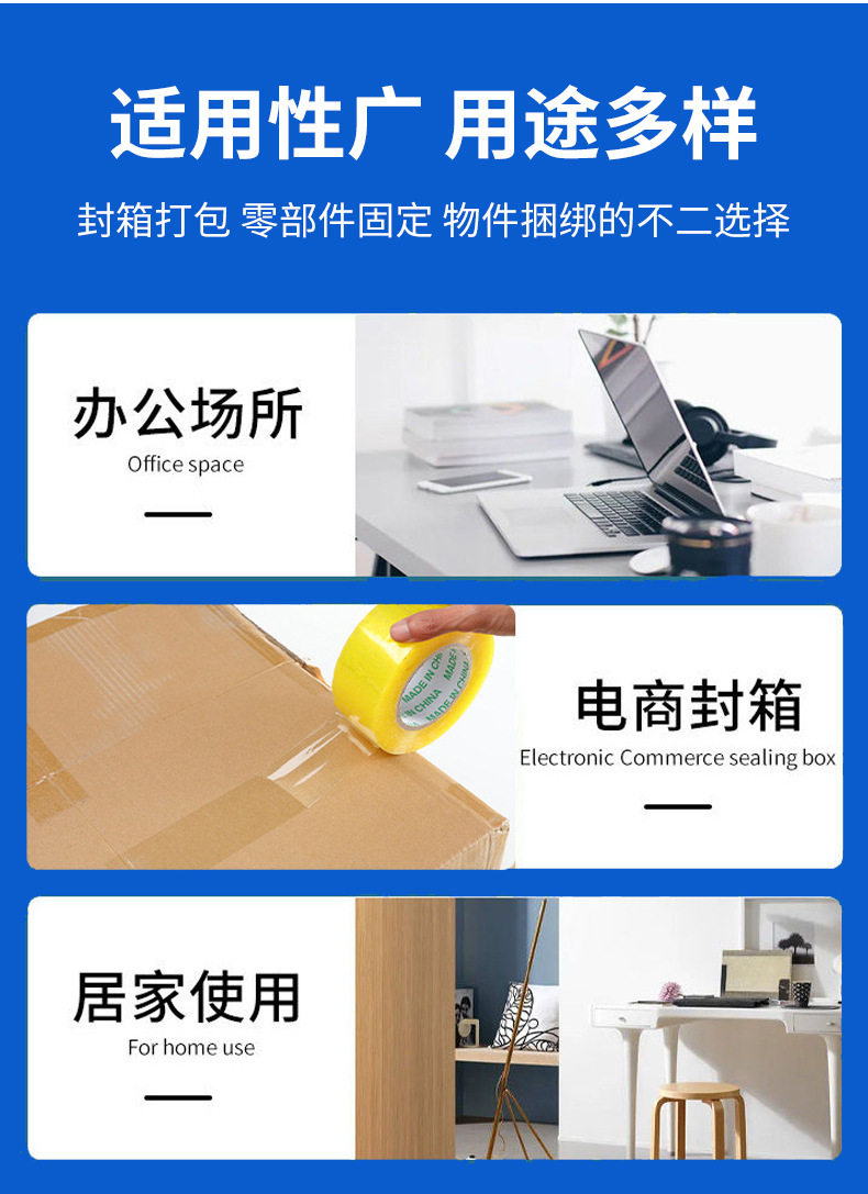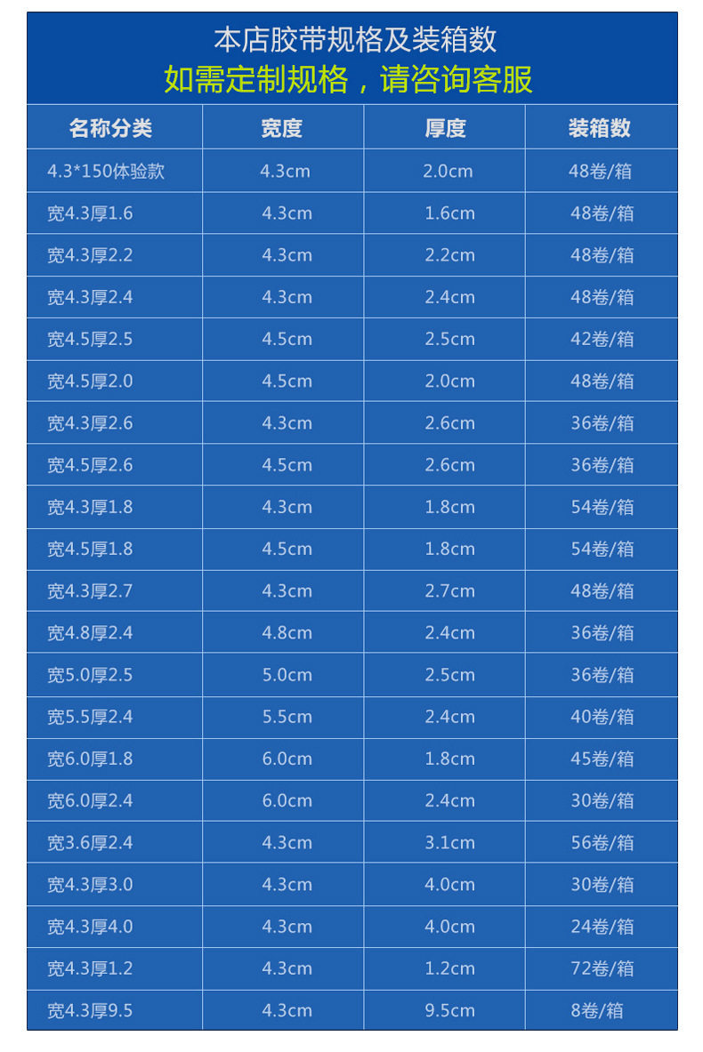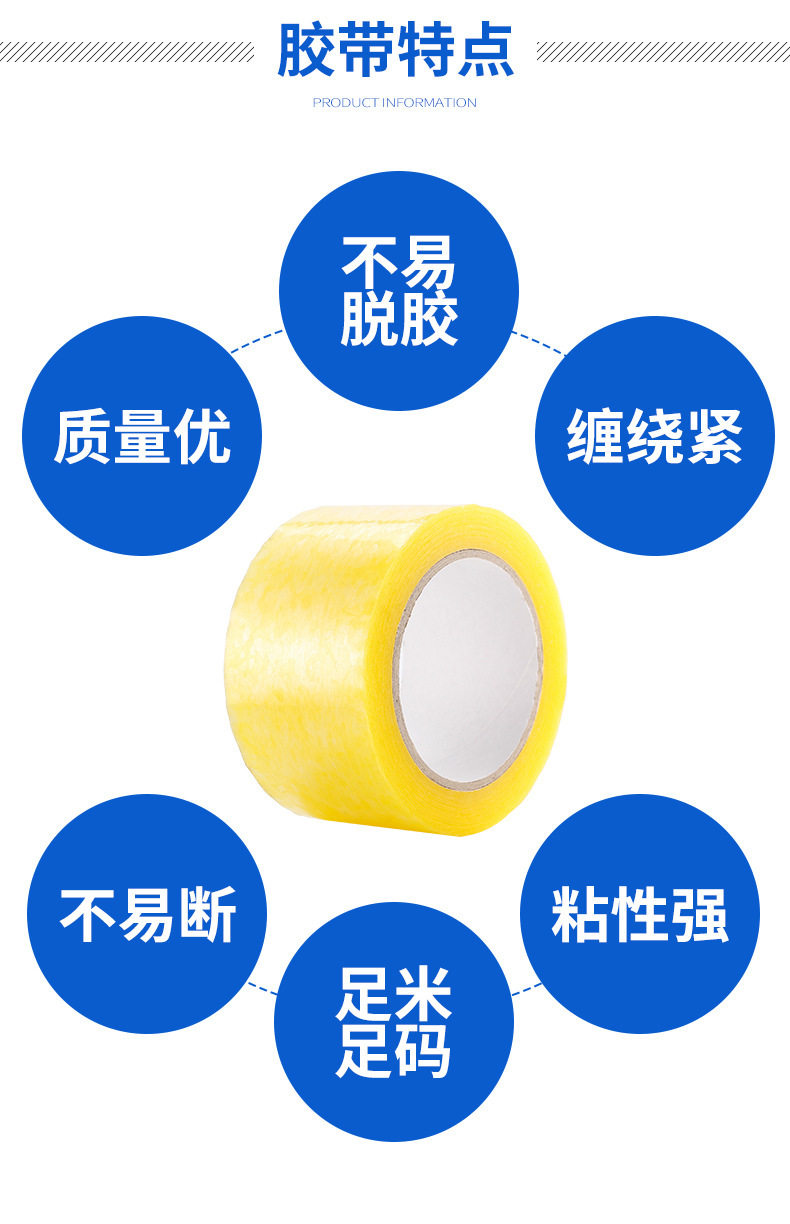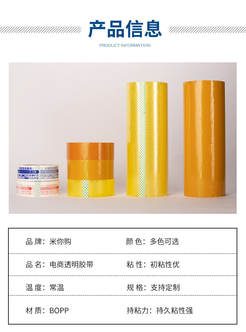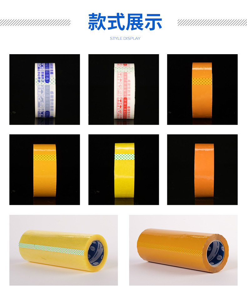 | Specifications and models | Transparent yellow; Wide 4.5/thick 2.5/long 150 (whole box 56 rolls),Transparent yellow; Wide 4.5/thick 2.0/long 110 (whole box 56 rolls),Transparent yellow; Wide 4.5/thick 3.0/long 200 (whole box 56 rolls),Transparent yellow; Wide 4.8/thick 2.0/long 110 (whole box 63 rolls),Transparent yellow; Wide 4.8/thick 2.5/long 150 (whole box 56 rolls),Transparent yellow; Wide 4.8/thick 3.0/long 200 (whole box 56 rolls),Transparent yellow; Wide 5.0/thick 2.0/long 110 (whole box 63 rolls),Transparent yellow; Wide 5.0/thick 2.5/long 150 (whole box 56 rolls),Transparent yellow; Wide 5.0/thick 3.0/long 200 (whole box 56 rolls),Transparent yellow; Wide 5.5/thick 2.0/long 110 (60 rolls in the whole box),Transparent yellow; Wide 5.5/thick 2.5/long 150 (whole box 54 rolls),Transparent yellow; wide 5.5/thick 3.0/long 200 (whole box 48 rolls),Transparent yellow; wide 6.0/thick 2.0/long 110 (whole box of 40 rolls),Transparent yellow; Wide 6.0/thick 2.5/long 150 (whole box 45 rolls),Transparent yellow; wide 6.0/thick 3.0/long 200 (whole box of 40 rolls),Transparent yellow; Width 4.5/Thickness 1.2/Length 60 (84 rolls in whole box),Beige (opaque); wide 4.5/thick 2.5/long 150 (56 rolls),Beige (opaque); wide 4.5/thick 2.0/long 110 (56 rolls),Beige (opaque); wide 4.5/thick 3.0/long 200 (56 rolls),Beige (opaque); wide 4.8/thick 2.0/long 110 (63 rolls),Beige (opaque); wide 4.8/thick 2.5/long 150 (56 rolls),Beige (opaque); wide 4.8/thick 3.0/long 200 (56 rolls),Beige (opaque); wide 5.0/thick 2.0/long 110 (63 rolls),Beige (opaque); wide 5.0/thick 2.5/long 150 (56 rolls),Beige (opaque); wide 5.0/thick 3.0/long 200 (56 rolls),Beige (opaque); wide 5.5/thick 2.0/long 110 (60 rolls),Beige (opaque); wide 5.5/thick 2.5/long 150 (whole box of 54 rolls),Beige (opaque); wide 5.5/thick 3.0/long 200 (whole box of 48 rolls),Beige (opaque); wide 6.0/thick 2.0/long 110 (whole box of 40 rolls),Beige (opaque); wide 6.0/thick 2.5/long 150 (whole box 45 rolls),Beige (opaque); wide 6.0/thick 3.0/long 200 (whole box of 40 rolls),Beige (opaque); Width 4.5/thickness 1.2/length 60 (whole box 84 rolls),It is clear; Wide 4.5/thick 2.5/long 150 (56 rolls in whole box),It is clear; Wide 4.5/thick 2.0/long 110 (56 rolls in whole box),It is clear; Wide 4.5/thick 3.0/long 200 (56 rolls in whole box),Transparent; Wide 4.8/thick 2.0/long 110 (63 rolls in whole box),It is clear; Wide 4.8/thick 2.5/long 150 (56 rolls in whole box),It is clear; Wide 4.8/thick 3.0/long 200 (56 rolls in whole box),It is clear; Wide 5.0/thick 2.0/long 110 (63 rolls in whole box),It is clear; Wide 5.0/thick 2.5/long 150 (56 rolls in whole box),It is clear; Wide 5.0/thick 3.0/long 200 (56 rolls in whole box),It is clear; Wide 5.5/thick 2.0/long 110 (60 rolls in the whole box),It is clear; Wide 5.5/thick 2.5/long 150 (whole box 54 rolls),It is clear; Wide 5.5/thick 3.0/long 200 (48 rolls in whole box),It is clear; Wide 6.0/thick 2.0/long 110 (40 rolls in the whole box),It is clear; Wide 6.0/thick 2.5/long 150 (whole box 45 rolls),It is clear; Wide 6.0/thick 3.0/long 200 (40 rolls in the whole box),It is clear; Width 4.5/Thickness 1.2/Length 60 (whole box 84 rolls) |