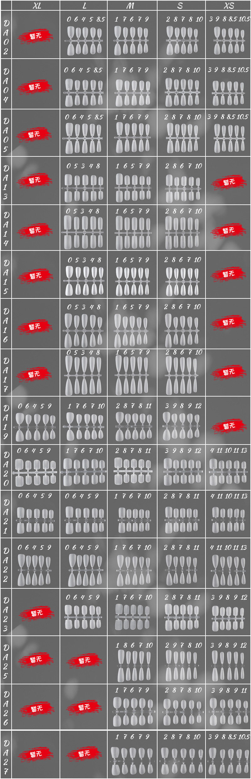 | Color | DA02-short almond LSXS,DA04-short ladder LSXS,DA05-Middle ladder LSXS,DA15-LMS,DA02-MMS,DA04-MMS,DA05-MMS,DA16-LMS,DA13-LMS,DA14-LMS,DA17-LMS,DA23-LSXS,DA23-MMS |