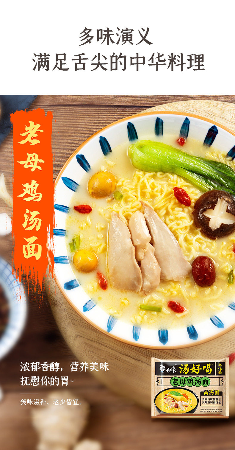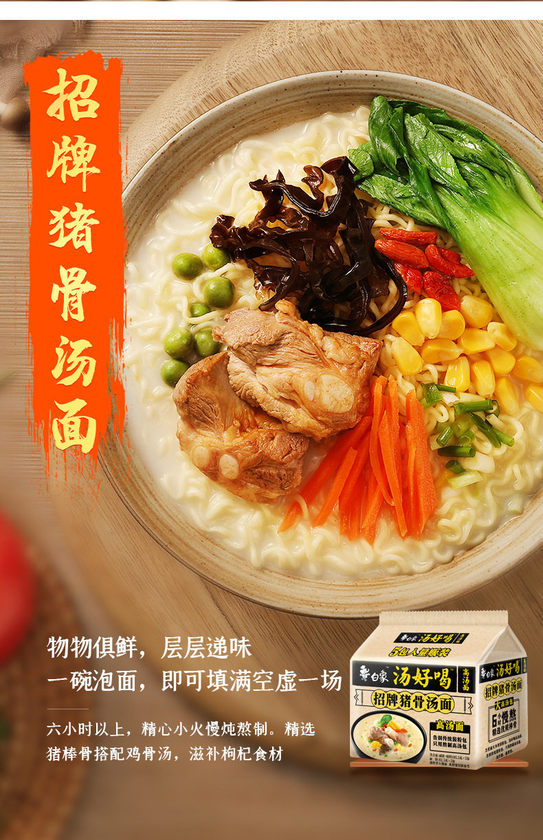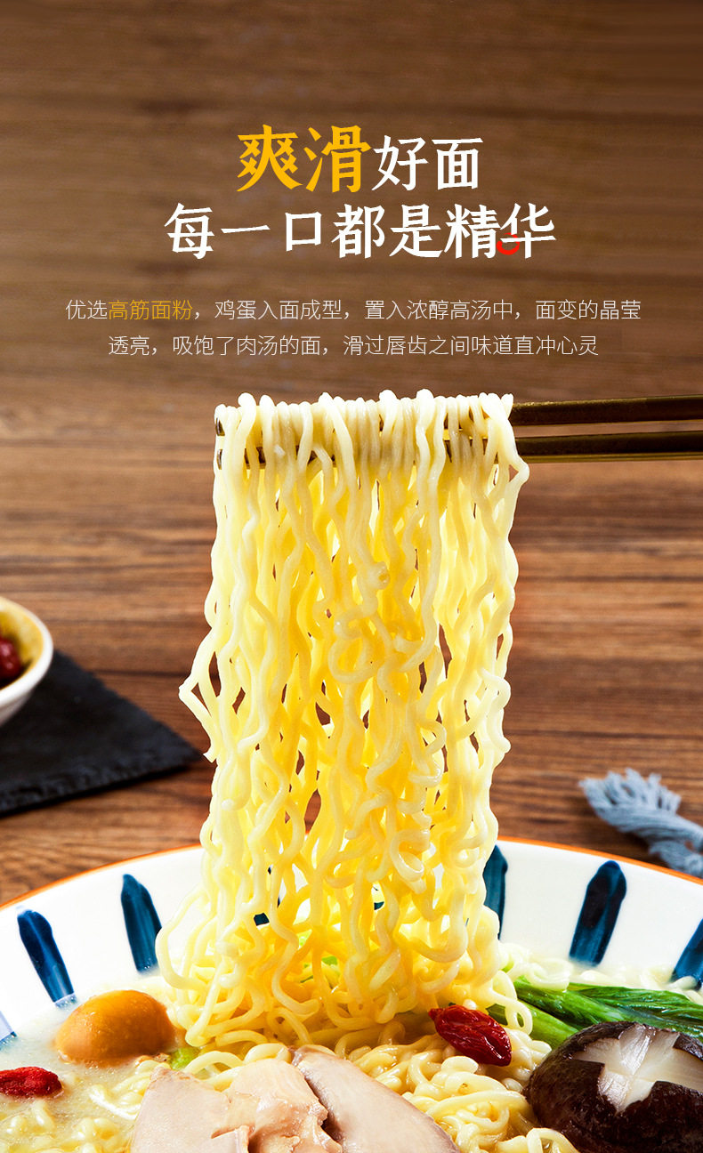 | Packaging specifications | Tasty chicken soup noodles 517.5g,Tasty soup signature big bone soup noodles 527.5g,Tasty spicy beef noodle soup 517.5g,Turkey noodles 595g (five packs),Crayfish noodles 575g (pack of five),Tasty chicken soup noodles 109g,Tasty soup signature big bone soup noodles 108g,Super fragrant coriander noodles 115g,Tasty spicy beef noodle soup 113g,Tasty mutton noodle soup 108g,Tasty seafood noodle soup 113g |