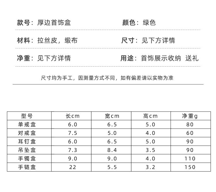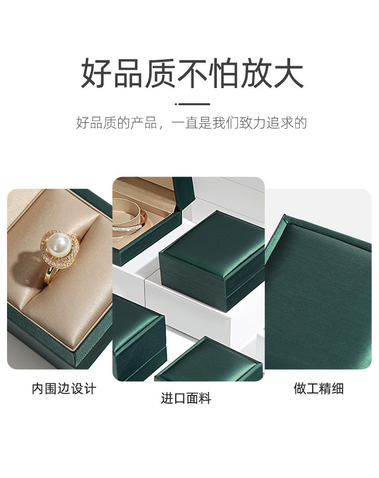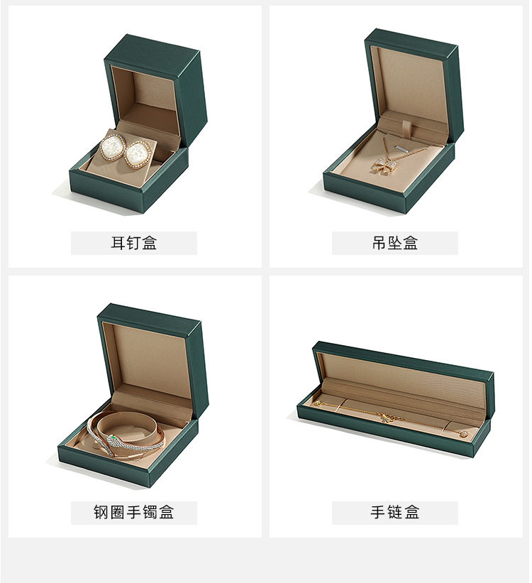 | Specifications and models | Dark green single ring box; pu leather material [can be customized],Dark green earring box (small size); pu leather material [can be customized],Dark green earring box (large size); pu leather material [can be customized],Dark green ring box; pu leather material [can be customized],Dark green pendant box; pu leather material [can be customized],Dark green bracelet box; pu leather material [can be customized],Dark green bracelet box; pu leather material [can be customized],Gold single ring box; pu leather material [can be customized],Gold ring box; pu leather material [can be customized],Gold earring box; pu leather material [can be customized],Gold pendant box; pu leather material [can be customized],Gold bracelet box; pu leather material [can be customized],Gold bracelet box; pu leather material [can be customized],Gold suit box; pu leather material [can be customized],Light gold handbag; pu leather material [can be customized],Dark green handbag; pu leather material [can be customized] |