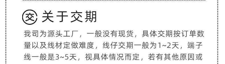 | Specifications | Dupont line,Colored dupont line,Fc16p cable extension cable,Usb charging terminal cable,Three-position connecting cable,4*0.75 square flat wire vde,Led sheath flat wire,Lvds lcd screen cable,Xh 2.54 terminal wire,Led sheath flat wire,Colored silicone cable,Motorcycle ignition line,Silicone electronic wire processing,Stroller charging port with cable,4pin2.54mm color cable,Camry connecting cable,Yellow and green ground wire rv 1mm2,03T-JWPF-VSLE-S,1.25-6p double-ended terminal cable,8pin module led,PH2.0-2P,Power new energy battery cable,Dupont head to crocodile clip line,Cigarette lighter refrigerator plug cord,9pin extension cable,Type-c male terminal wire,4p2.54 pitch black cable,Jst 3p plug terminal wire,Led light strip dupont cable,Led aviation power cord,Led waterproof docking line,Led neon line,Rgbw light strip cable,Dc male socket line,Ec5 connecting cable,Toyota power cord,Volkswagen control wiring harness,Anderson one-to-two connecting cable,Pasero high-end power cord,Graphics card power cord,Car horn line,Painted electronic wire,Welding wire,Power connected to wires,Double-ended sae cable,Car h1 two to one connecting cable,Computer neon line,Silicone parallel,Model aircraft adapter cable,Aviation head plug,Boat type switch line,High temperature wire,0.8 puncture terminal wire,1.0mm terminal wire,1007 electronic line,1015 electronic line,20 core flat sheathed wire,4-pin fan terminal wire,5521 switch usb cable,2p terminal wire,5521 wire,Etc charging cable,Gx20 aviation headline,Led rgb 4pin connecting cable,Led large screen power cord,Five-core flat line,Side wall line,Solderless connection cable,Male and female connector cable,5557 4p double cable harness,Awg28 2-core charging cable,DJ7031-1.2-21,Gx16-10 core with line,Led display plug-in,Led display aging line,Mc4 head to dc5521 cable,Phd2.0 terminal wire,Phd double row connecting cable,Pvc tinned black and red wire,Rgb led 6 pin wiring harness,Volkswagen car cd machine wiring,Balanced charging extension cord,Symphony light wire,Colorful silicone parallel lines,Two cores of sheath,Car start power cord,Washing machine wiring harness processing,Lamp terminal wire,Electric vehicle elbow cable 6 square meters,Electric vehicle positive and negative power cord,Battery shrapnel terminal wire,Battery cable,Double-ended sae cable,Colored cable 5p cable processing,Cruze power cord,Wiring harness processing,Aviation head power cord,Battery pack cable,Touch welding wire,Car light power cord,Transparent wire,Lithium battery capture cable,Waterproof light strip cable,Panel light tail card line,Mazda 6 wiring harness,Waterproof type-c 2p female base welding wire,1.25mm connecting cable 4p,1007#22awg electronic line,100722Electronic line,1007 wire harness,1015-12awg,1394 wire no. 22,16pin to 16pin extension cable,2*0.75 flat line,2.0 transparent terminal wire,2.54 buckle terminal wire,2.54 terminal wire,2651 gray cable,1007-22AWG,2p horn terminal wire,2p motor terminal wire,Terminal wire for welding nickel sheets,25 square meters grounding terminal wire,Double-head anderson plug cord,Energy storage battery cable,Luminous module line,Ring terminal wire,Enameled wire,Induction valve pneumatic terminal wire,Servo extension cord,High temperature braided terminal wire,Soft light strip terminal wire,High temperature silicone braided terminal wire,1.25 terminal wire,Dupont lock terminal wire,Dupont terminal wire with lock aircraft head,Positive and negative wires,Dupont terminal wire,Electric vehicle waterproof cable 8 cores,25 square terminal wire,Twist charging cable,Battery cable,Copper baotou terminal wire,Aircraft head line,O-type connecting cable,Sm terminal wire,4-core aviation connector terminal wire,Cigarette lighter cable,Teflon high temperature wire,Crocodile clip line,New energy vehicle high voltage wiring harness,Cabinet light terminal wire,Gray cable,Electric scooter motor cable,Electric vehicle safety cable,Crocodile clip with line,10 square tube type terminal wire,4p male and female sheathed cable,Jr servo extension cable,M8 6-core male and female extension cable,Rgb plug-in cable,Syp terminal wire 3p,Argb line,Rgb light strip extension cable,Sae to mc4 cable,Terminal cable with led light,Dc35135 plug waterproof cable,Df14 terminal wire,Led car wire,M10 mini waterproof cable,Ot terminal wire,Phd terminal wire,Three-core signal line flexible wire,Round head terminal line,Terminal wire one point and two wire,Servo line female to female,Nickel sheet with line,5559 terminal wire,Led light strip wire,1015 insulated flexible wire awg18,Square 4p terminal wire,Lamp dc connection cable,3pin ph2.0 red,DJ7021-1.5-21,DJ7028Y-2.8-21,RNB5.5,2468,Usb extension cable 0.3 square meters with two cores,One point two to 3.5 audio wiring,Three core parallel line,Anderson connecting cable,Cabinet terminal line,String lights,Electric vehicle lithium battery charging adapter cable,Electronic igniter cable,Digital equipment internal wiring plug-in board connection terminal wire,Wire extension socket head without wires,Terminal one to four power cord,Red and black lines,Aviation headline |