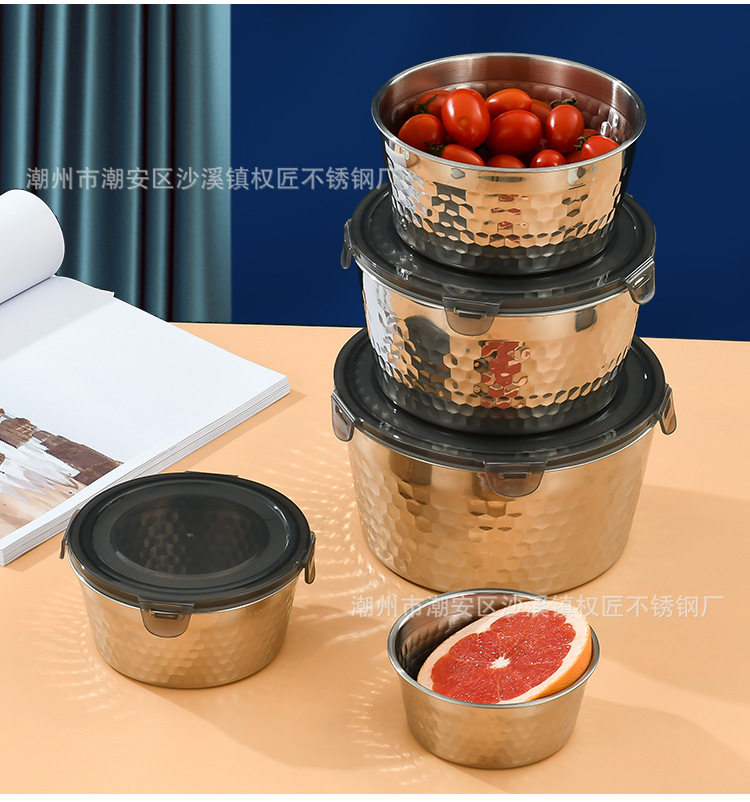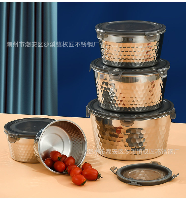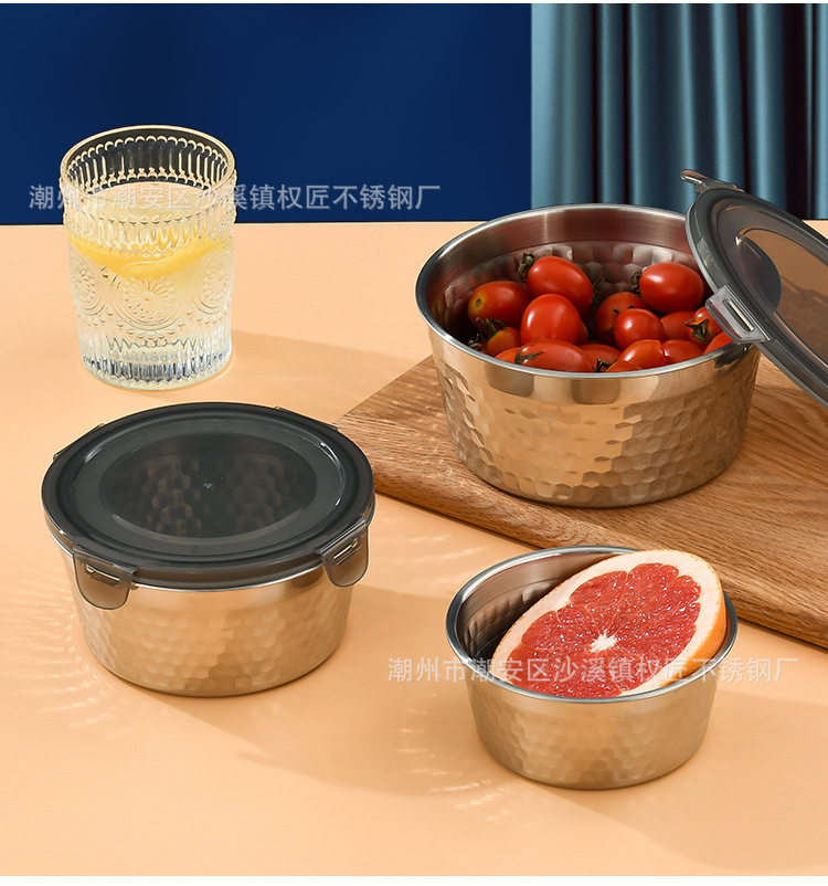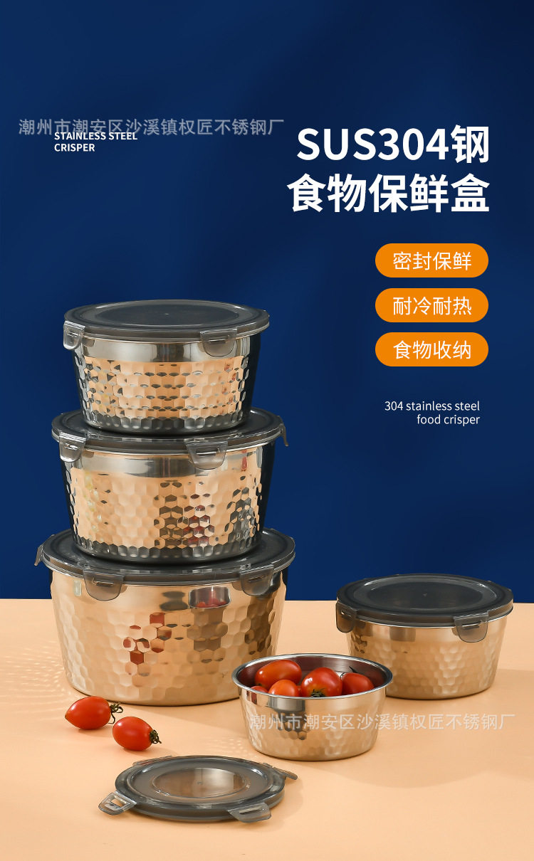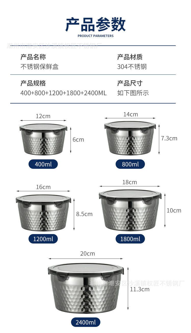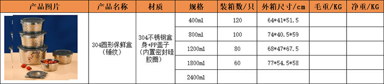 | Specifications | 304 hammered crisper [400ml] 12cm,304 hammered crisper [800ml] 14cm,304 hammered crisper [1200ml] 16cm,304 hammered crisper [1800ml] 18cm,304 hammered crisper [2400ml] 20cm |