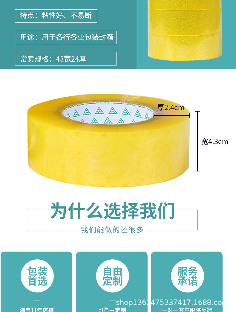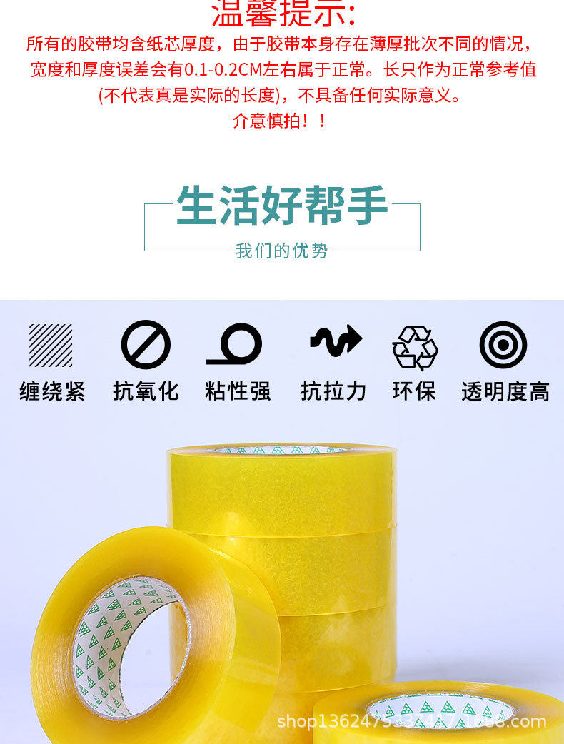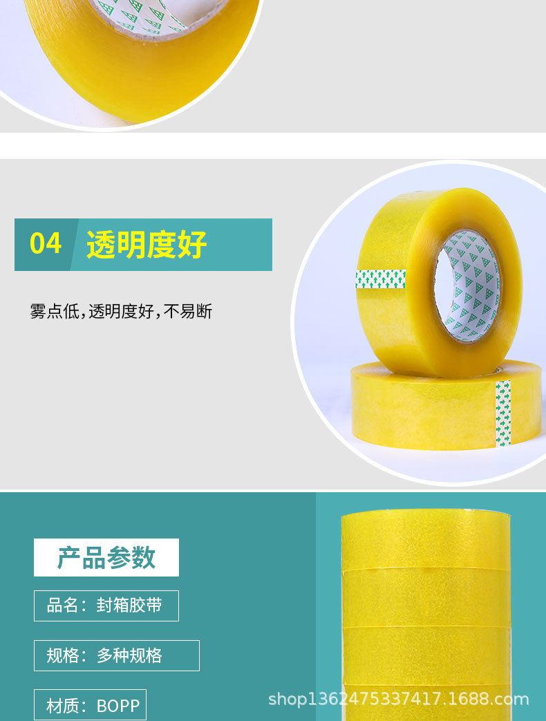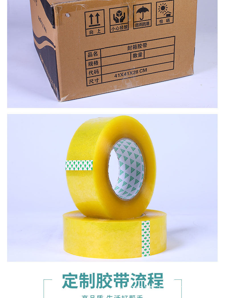 | Specification model | Transparent yellow 43mm*1.8*110 (48 rolls/carton); single layer 52mic; 48,Transparent yellow 43mm*2.0*130 (48 rolls/carton); single layer 52mic; 48,Transparent yellow 43mm*2.4*150 (48 rolls/carton); single layer 52mic; 48,Transparent yellow 43mm*2.7*180 (48 rolls/carton); single layer 52mic; 48,Transparent yellow 43mm*3.0*200 (48 rolls/carton); single layer 52mic; 48,Transparent yellow 43mm*3.5*260 (48 rolls/carton); single layer 52mic; 48,Transparent yellow 47mm*2.3*140 (48 rolls/carton); single layer 52mic; 48,Transparent yellow 55mm*2.3*140 (48 rolls/carton); single layer 52mic; 48,Transparent yellow 60mm*2.3*140 (48 rolls/carton); single layer 52mic; 48,Beige 43mm*1.8*110 (48 rolls/carton); single layer 52mic; 48,Beige 43mm*2.0*130 (48 rolls/carton); single layer 52mic; 48,Beige 43mm*2.4*150 (48 rolls/carton); single layer 52mic; 48,Beige 43mm*2.7*180 (48 rolls/carton); single layer 52mic; 48,Beige 43mm*3.0*200 (48 rolls/carton); single layer 52mic; 48,Beige 43mm*3.5*260 (48 rolls/carton); single layer 52mic; 48,Beige 47mm*2.3*140 (48 rolls/carton); single layer 52mic; 48,Beige 55mm*2.3*140 (48 rolls/carton); single layer 52mic; 48,Beige 60mm*2.3*140 (48 rolls/carton); single layer 52mic; 48 |