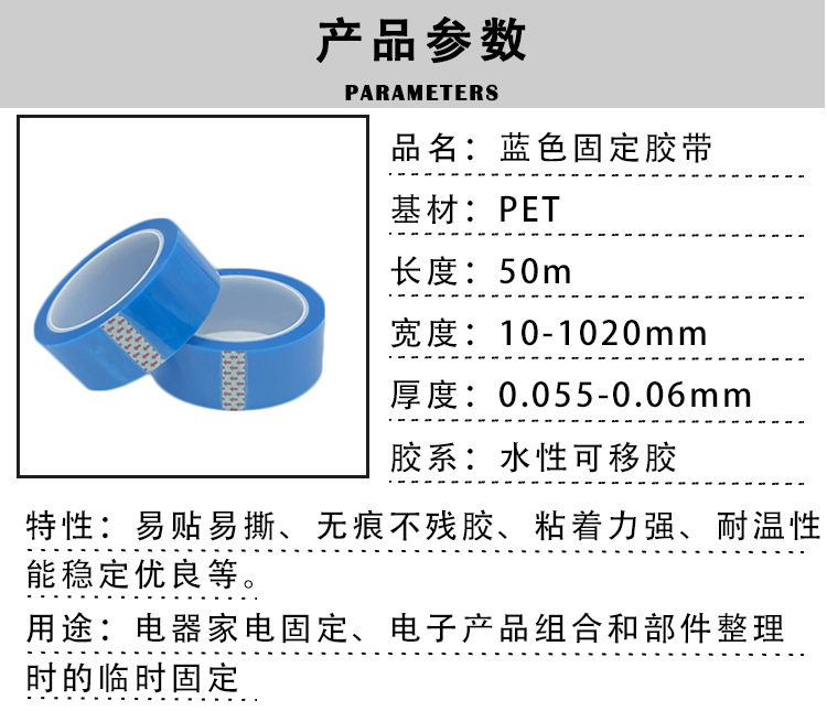 Manufacturer Wholesale Pet Blue Fixing Tape for Refrigerators and Home Appliances, Traceless, Temperature-Resistant, Waterproof, Non-Residue Adhesive, High Temperature Resistance