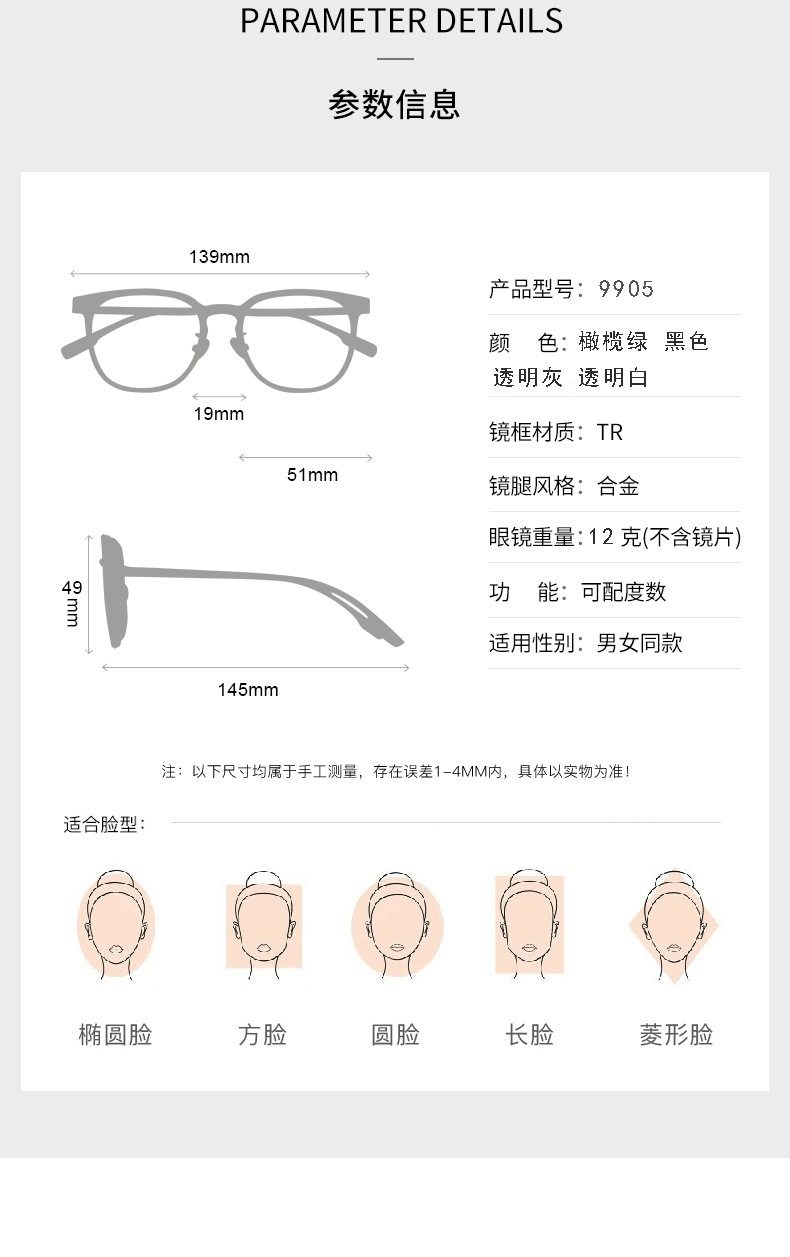 | Frame Color | COLD TAN,Clear,Transparent Gray,Bright Black,Contact customer service with myopia lenses |