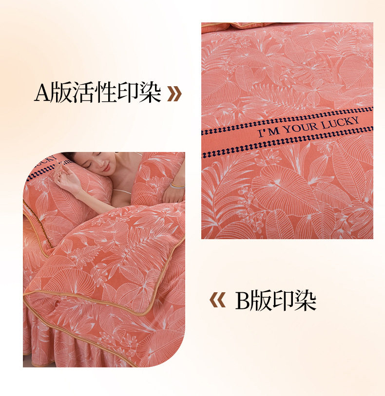 | Size specifications | 1.5m bed skirt four-piece set [quilt cover 200*230],1.8m bed skirt four-piece set [quilt cover 200*230],2.0m bed skirt four-piece set [quilt cover 220*240],1.2m bed skirt three-piece set [quilt cover 150*200] |