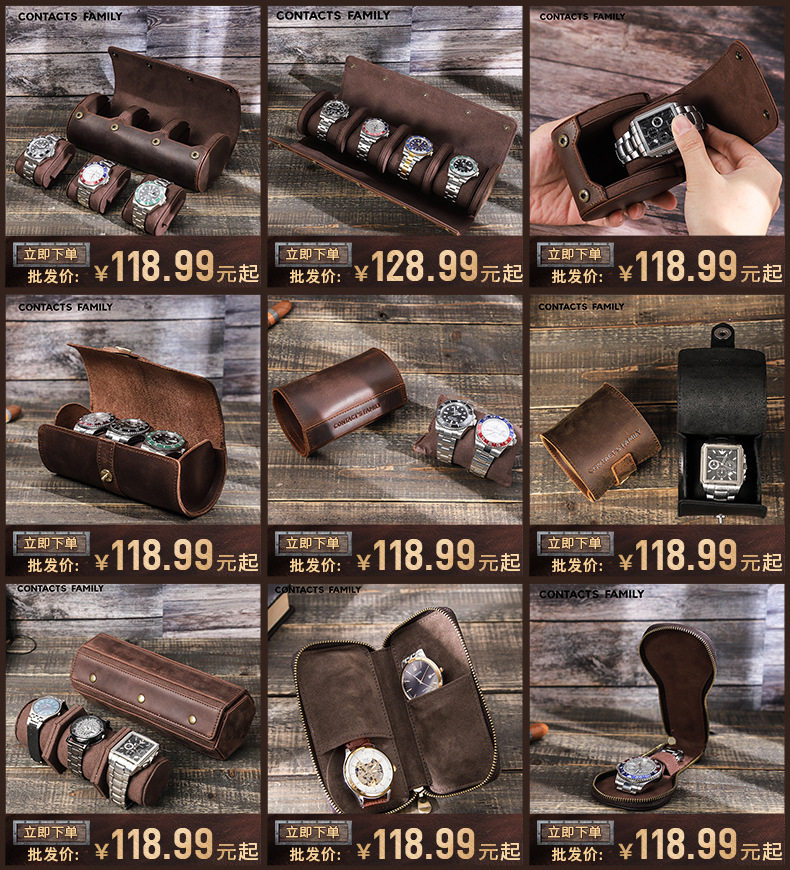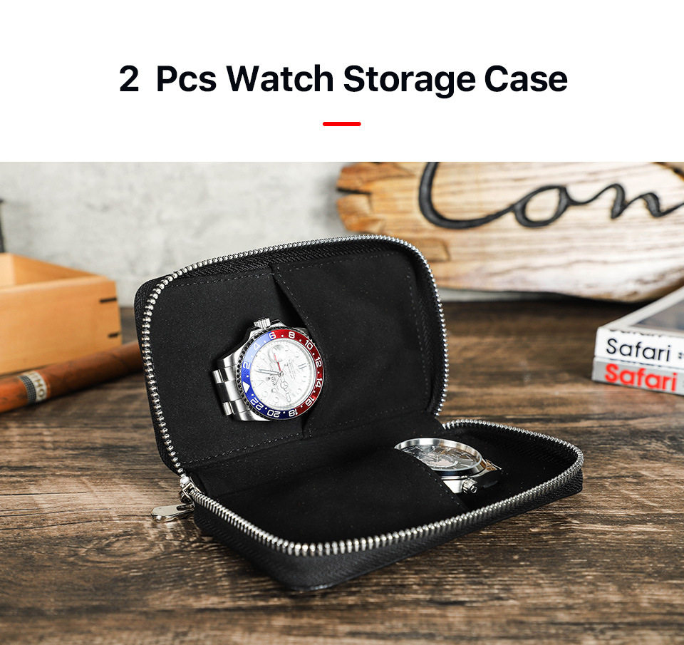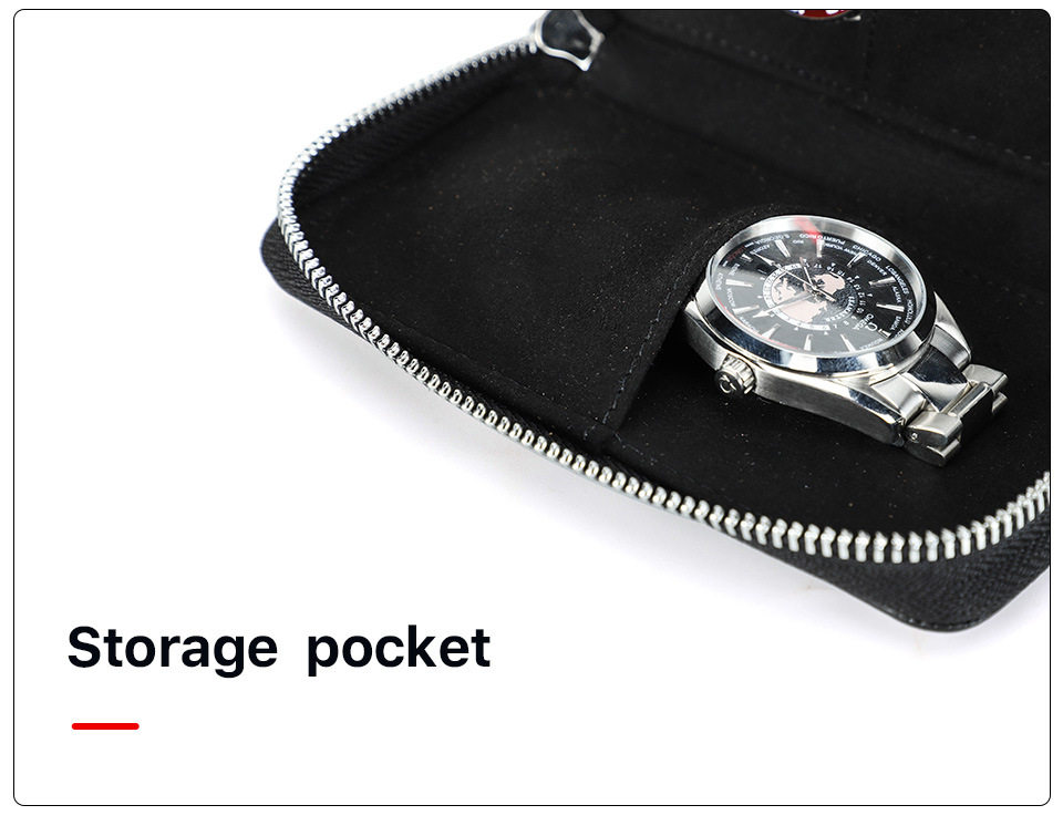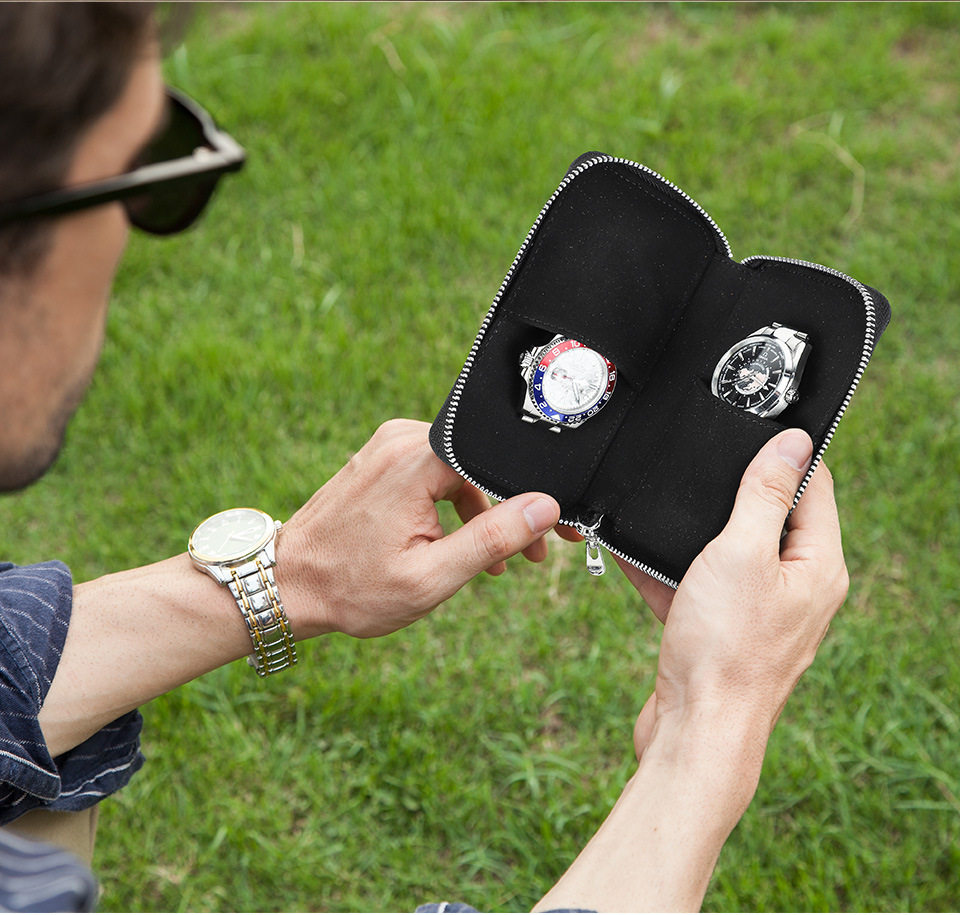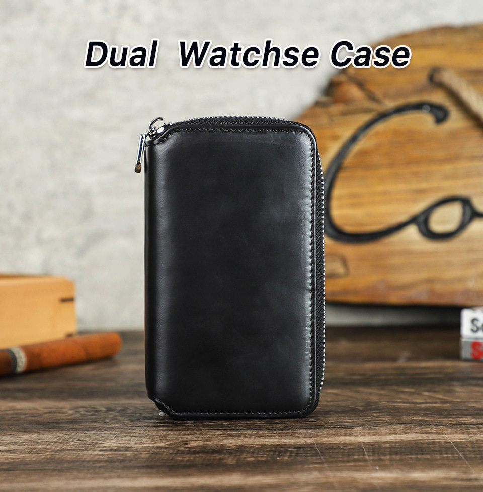 Black Waxed Cowhide Watch Case Two-Position Outdoor Travel Zipper Portable Genuine Leather Couple Watch Storage Bag