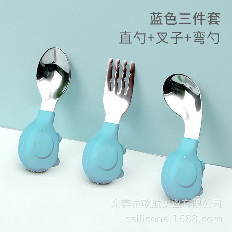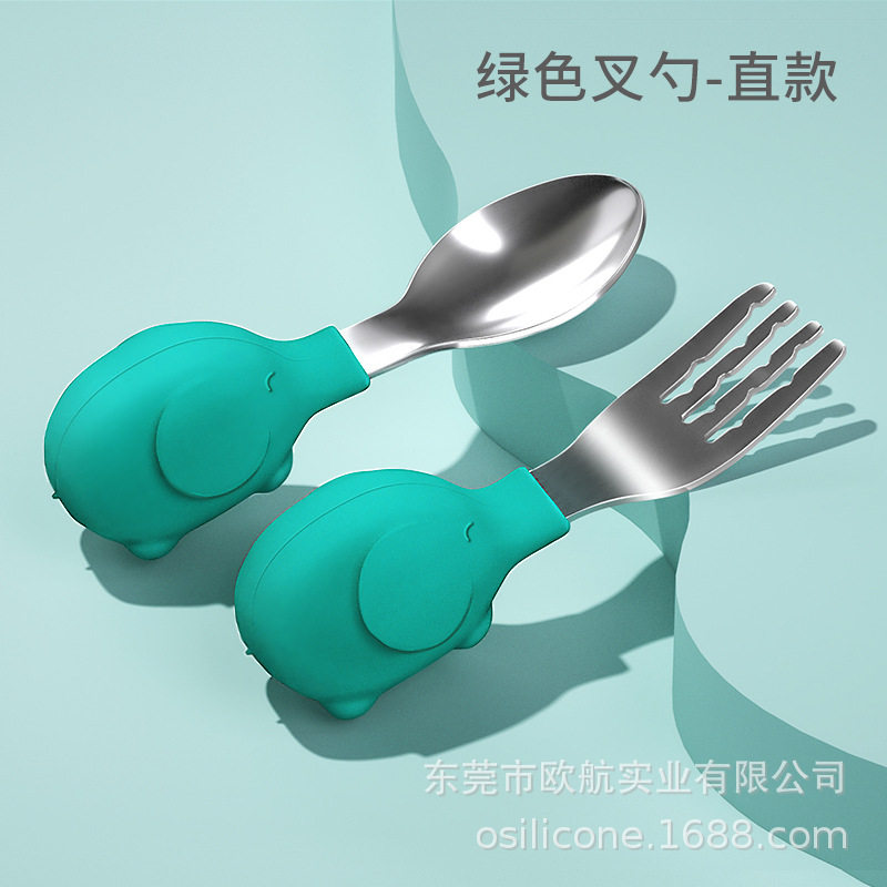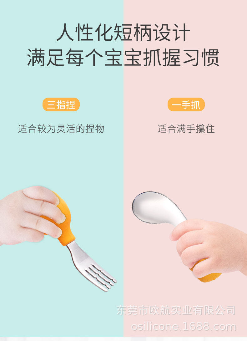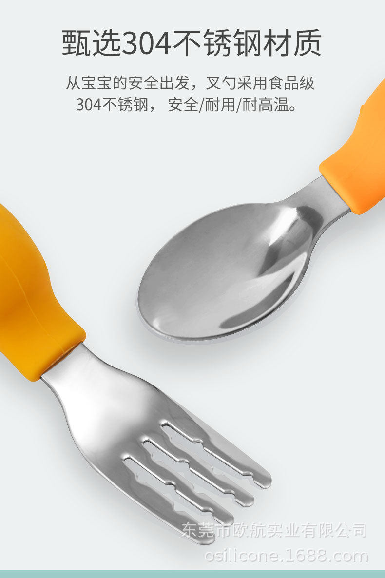 In stock wholesale baby silicone short handle training fork spoon learn to eat stainless steel food supplement spoon children portable tableware