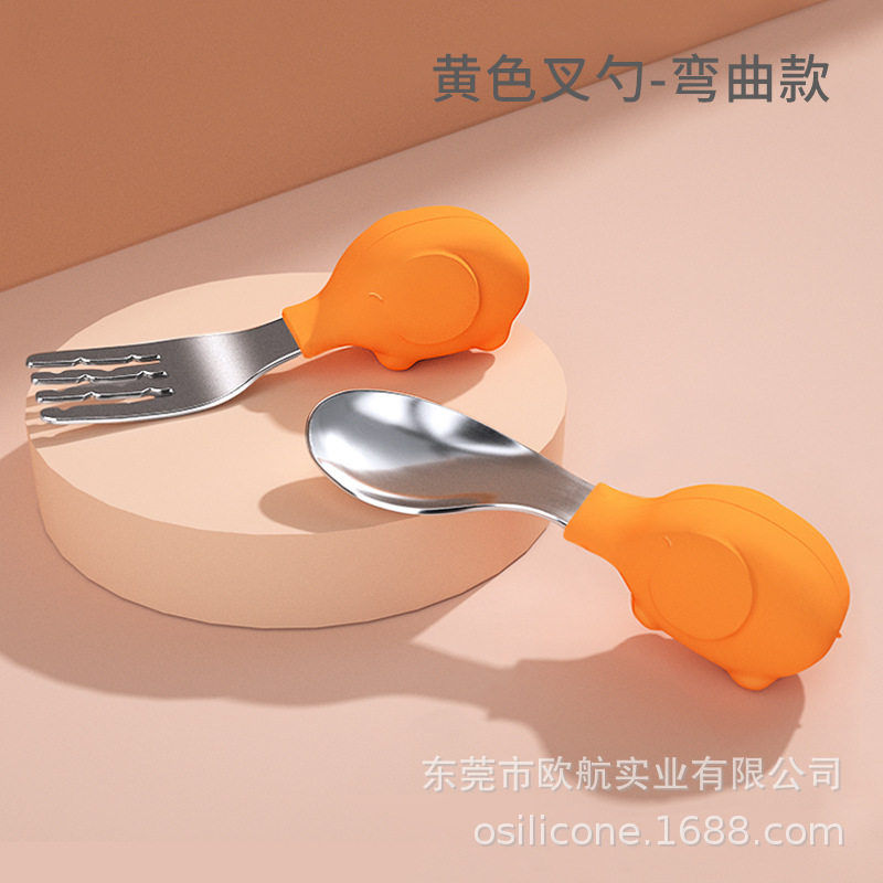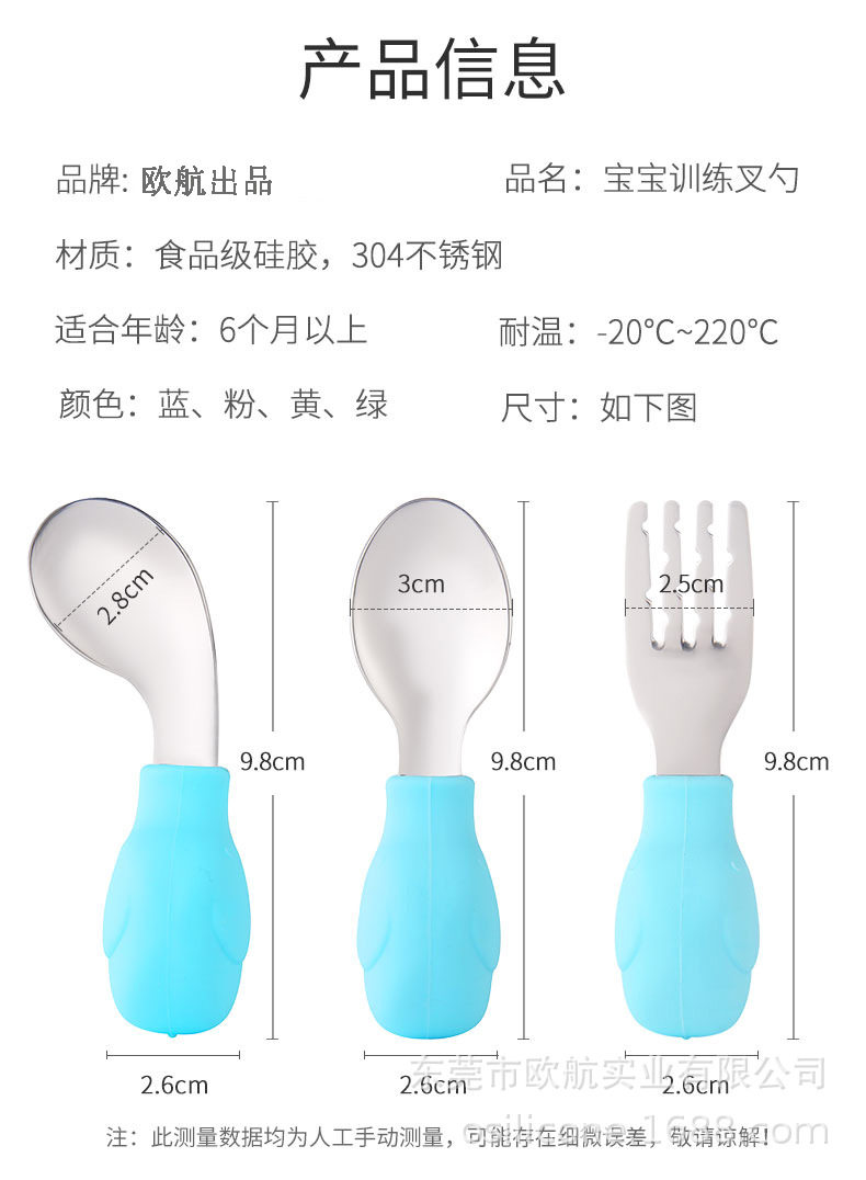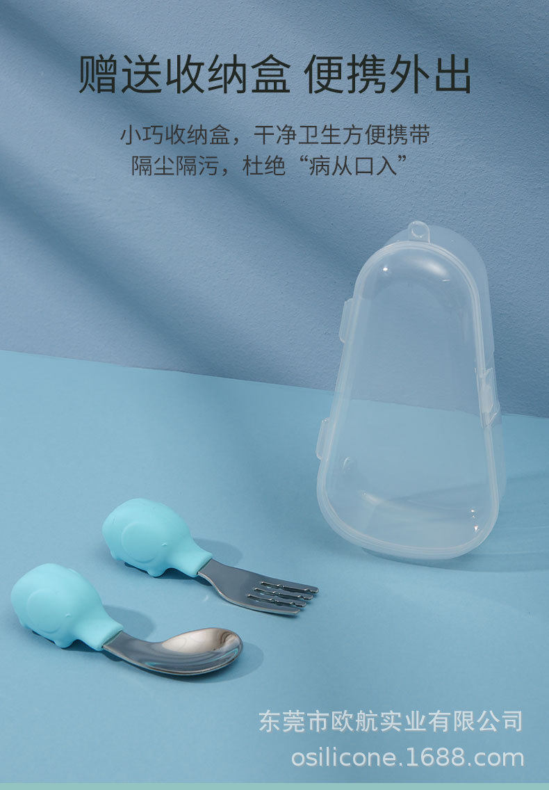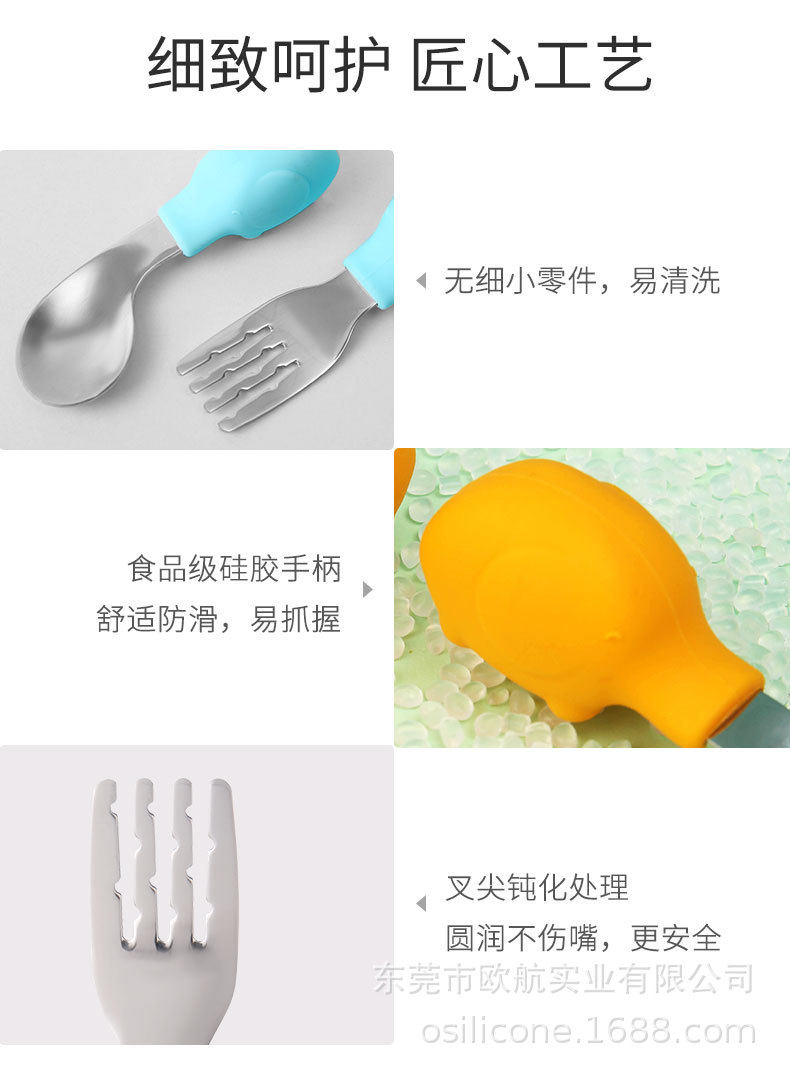 In stock wholesale baby silicone short handle training fork spoon learn to eat stainless steel food supplement spoon children portable tableware
