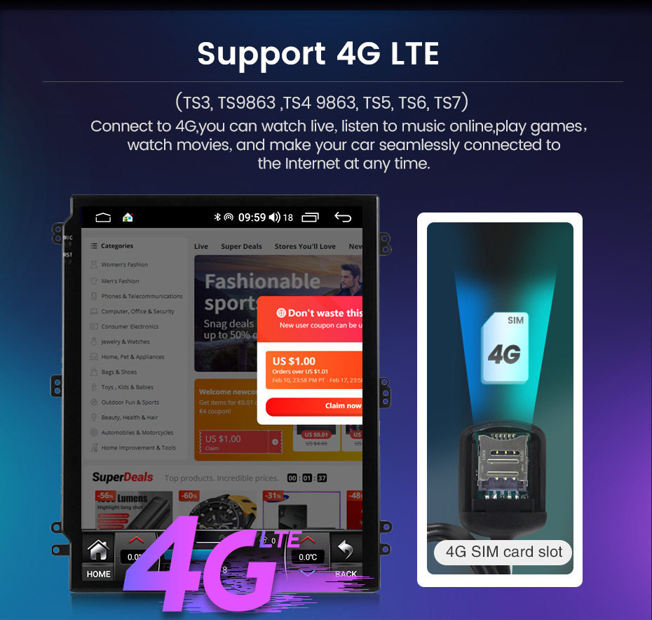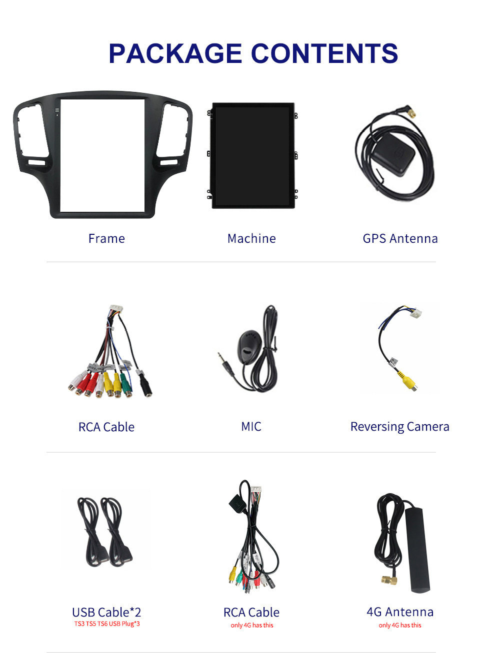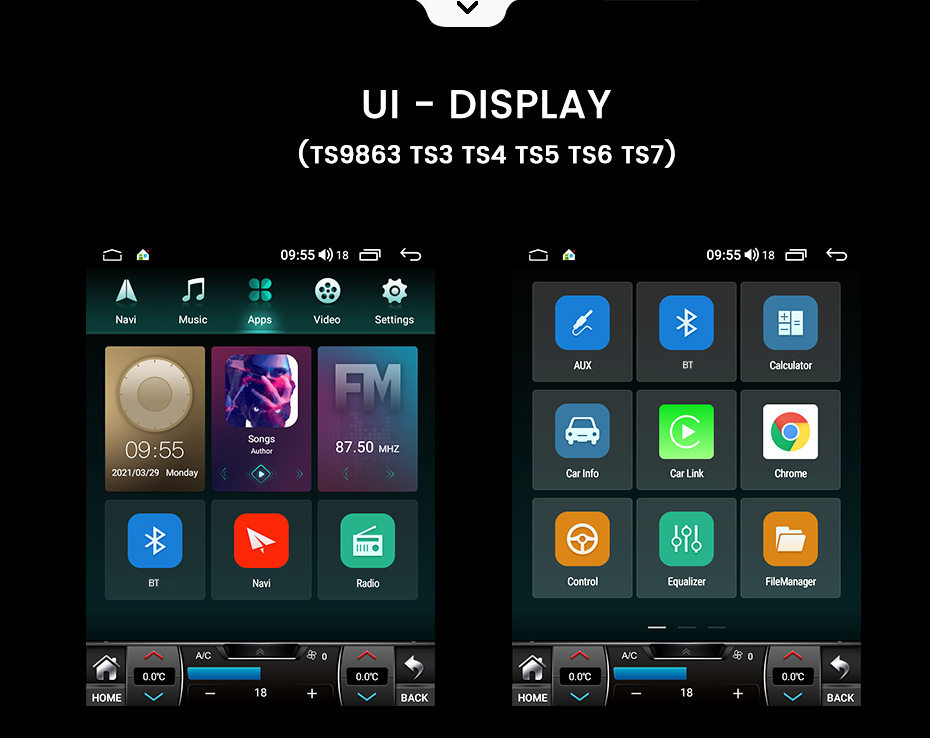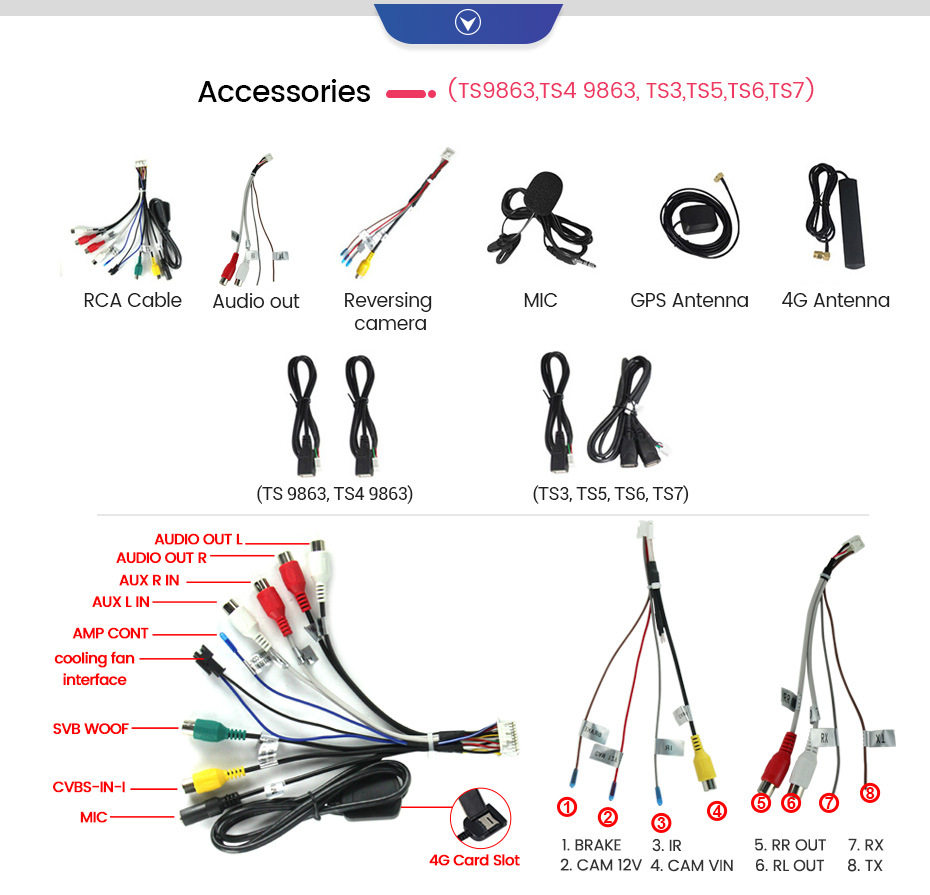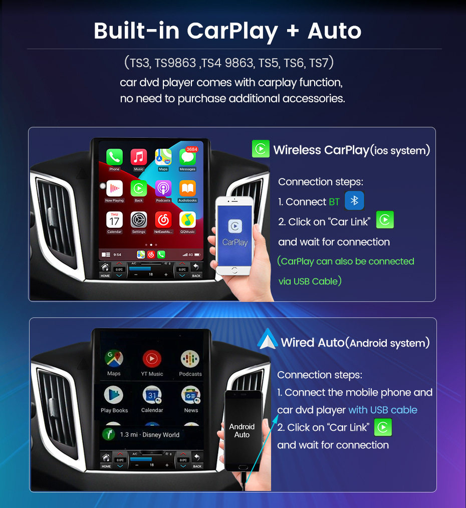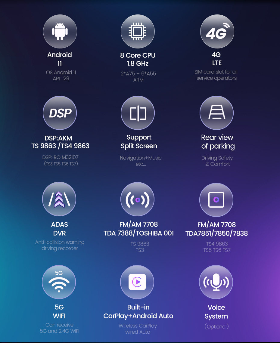 | Specifications | TS1 4 core 1+16g,TS2 4 Core 2+32g,TS3 8 core 3+32G carplay + auto 4G,TS5 8 core 4+64G carplay + auto 4G,TS6 8 Core 6+128G carplay + auto 4G,TS7 8 core 8+128G carplay + auto 4G,TS9863 8 Core 2+32G carplay + auto 4G,TS9863 8 core 4+64G carplay + auto 4G |
