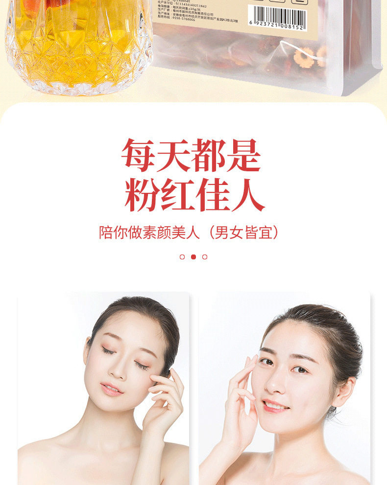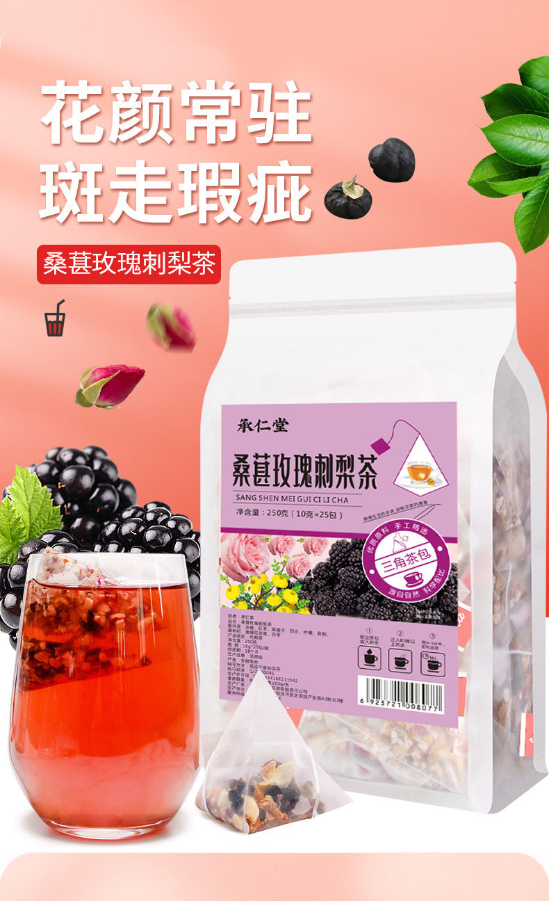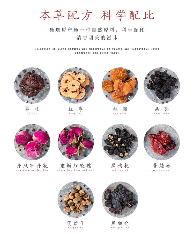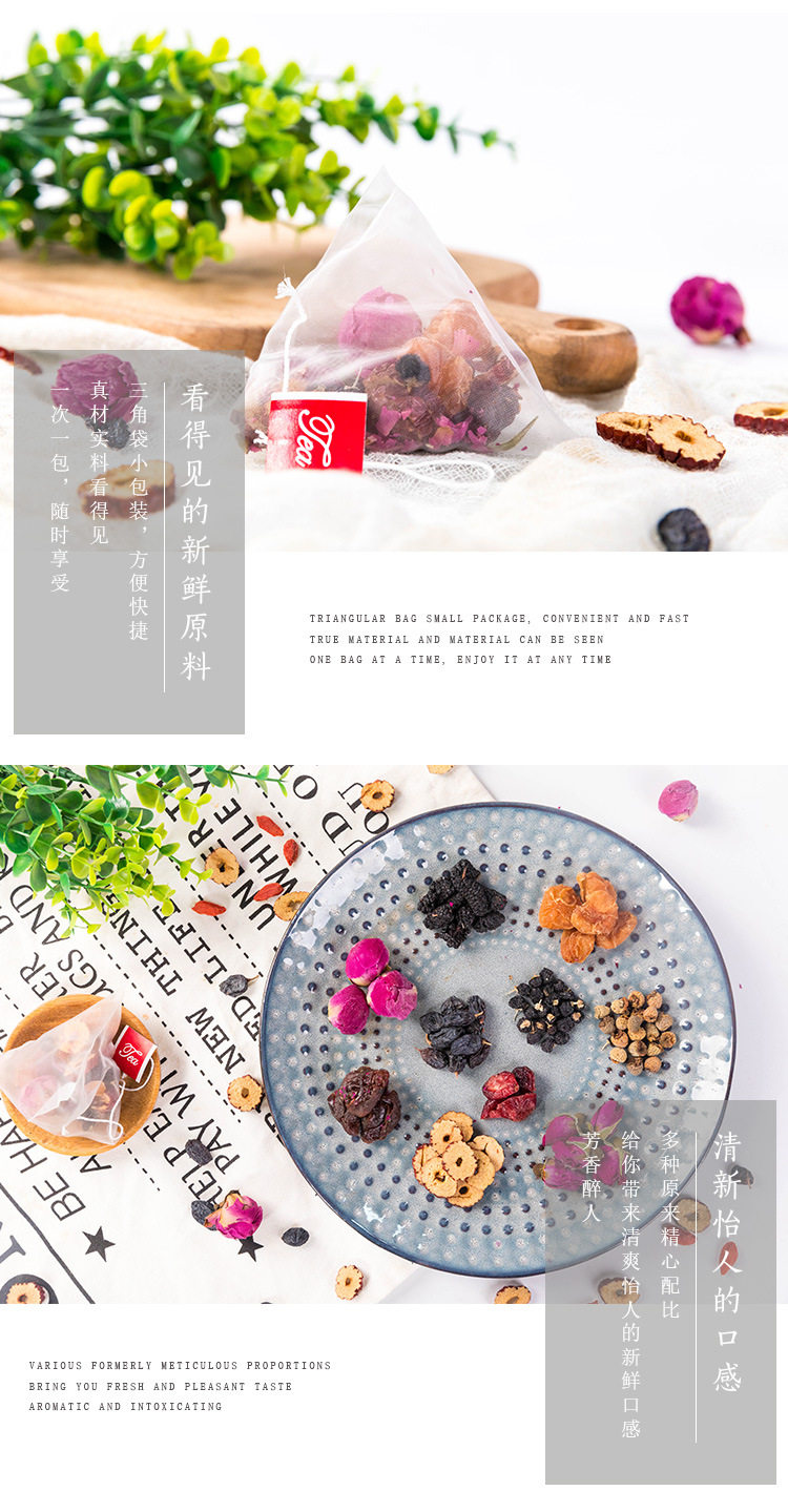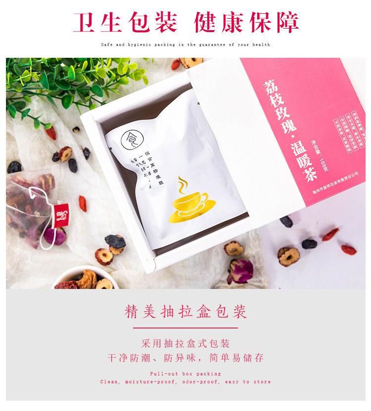 | Packing specification | Lychee rose warm tea pouch 14g,Mulberry rose roxburghii tea 10g * 25 packs/bag,Black sugar rose ginger jujube tea 16g * 12 packs/box,Litchi Rose Warm Tea 14g * 12 Pack/Box,Longan, medlar and red jujube tea 6g * 50 packs,brown sugar ginger jujube tea 20g * 10 packs/box,Black sugar red date ginger tea 10g * 25 packs/bag |