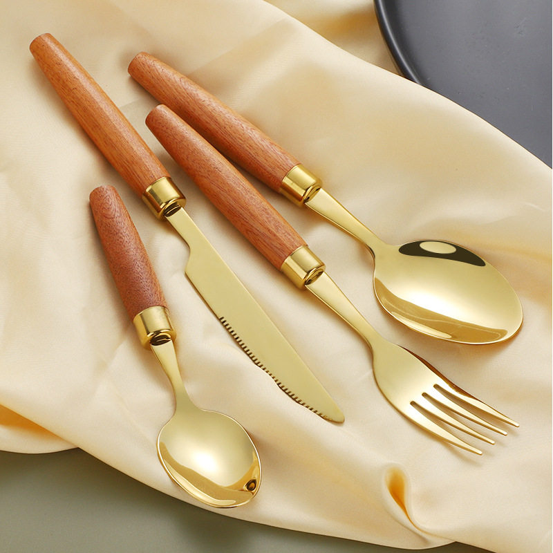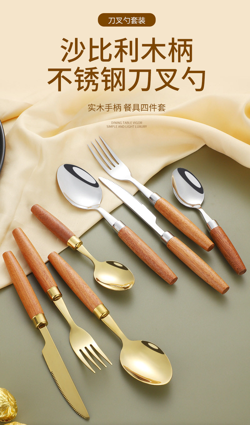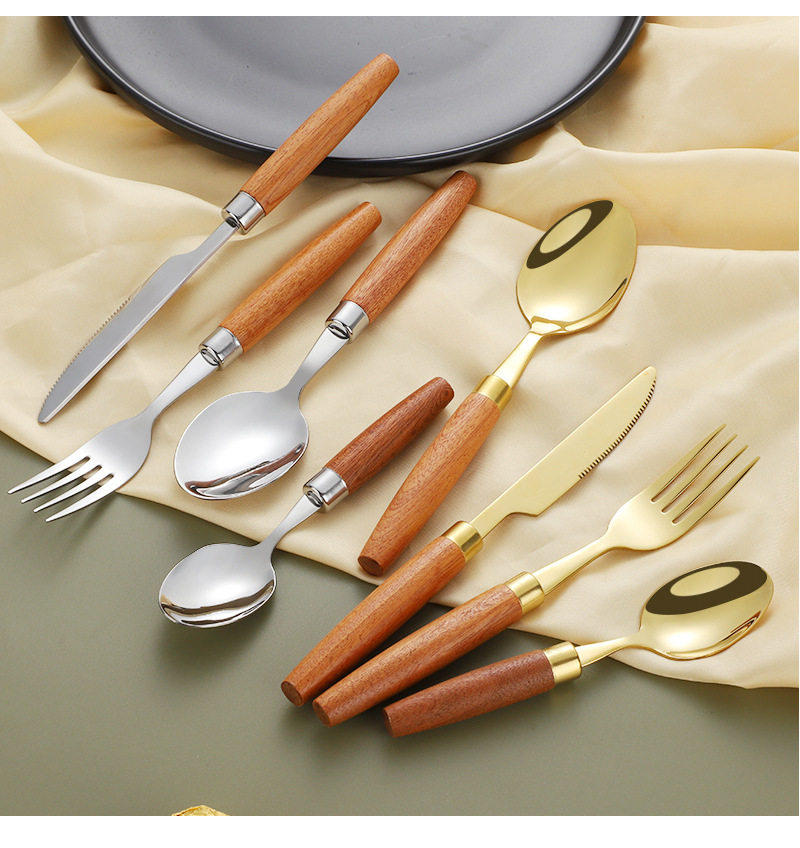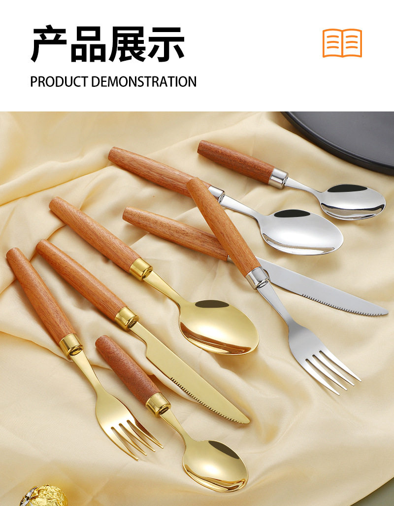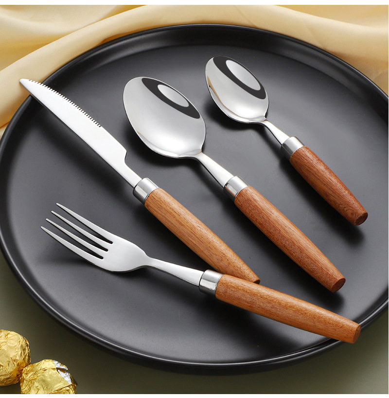 Cross-border 304 stainless steel knife, fork and spoon Japanese style ins wooden handle tableware Western food tableware set retro style logo
