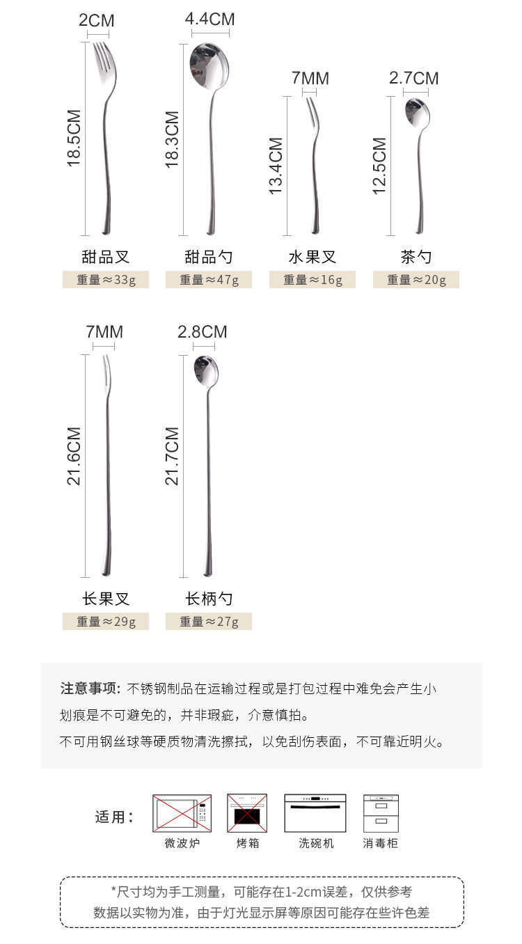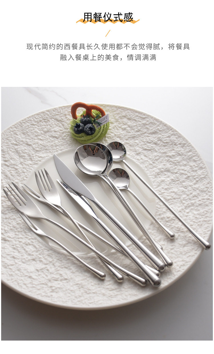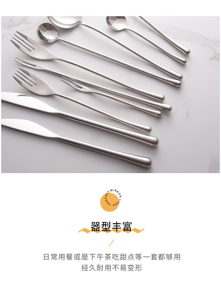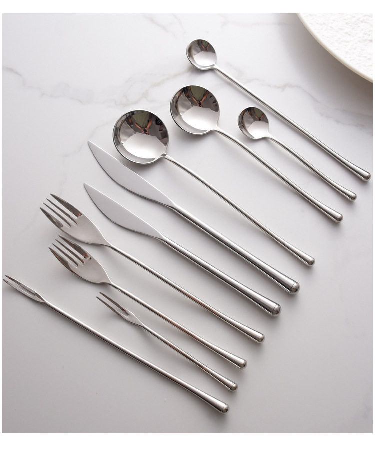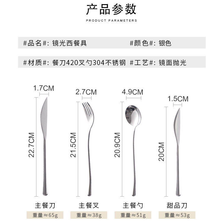 | Color | Main knife,Main Fork,Main meal spoon,Dessert knife,Dessert fork,Dessert spoon,Fruit fork,Teaspoon,Long fruit fork,Long handle spoon,Main meal knife and fork two,Three pieces of knife, fork and spoon for main meal,The main meal knife fork spoon tea spoon four pieces,Chopsticks |