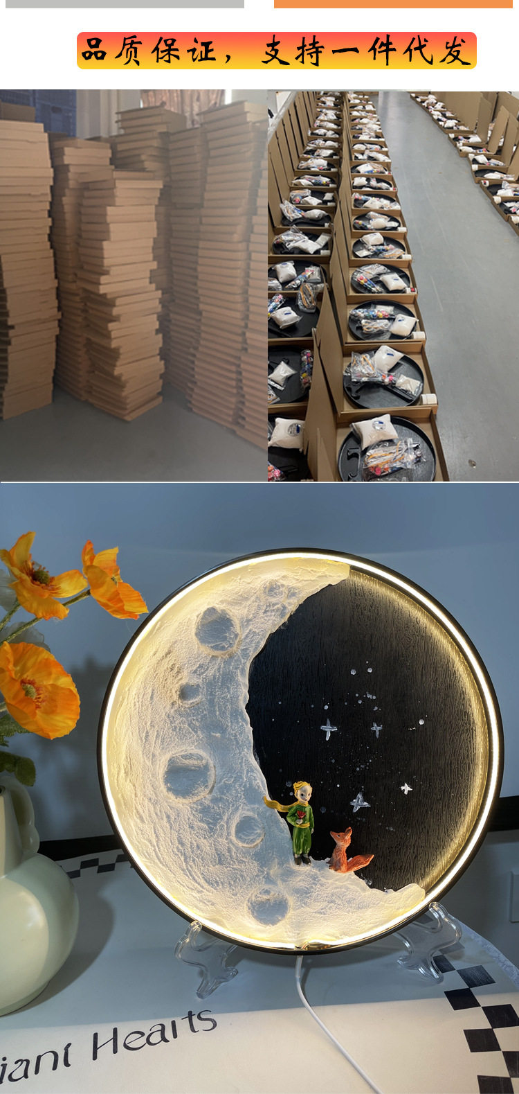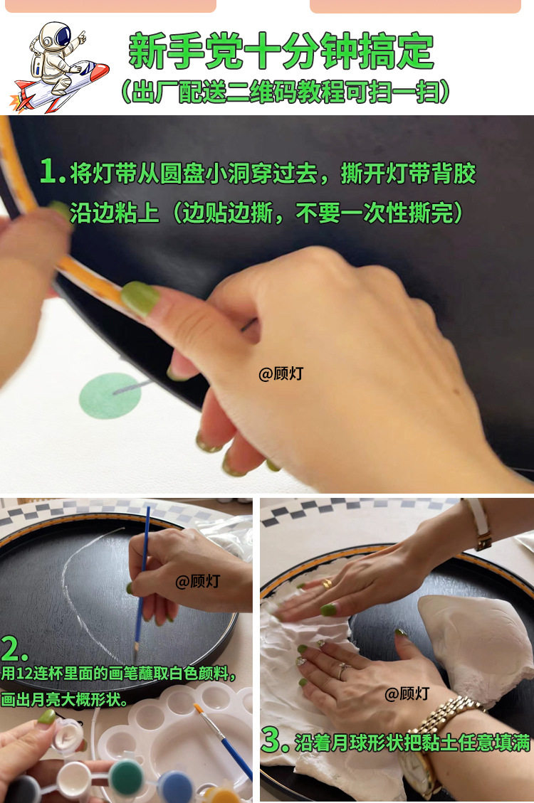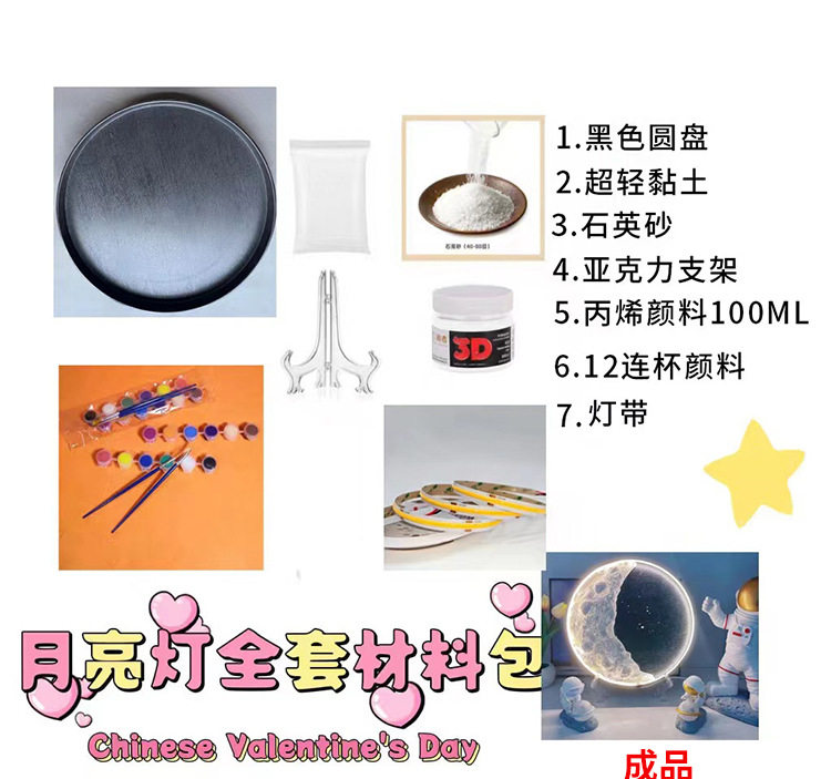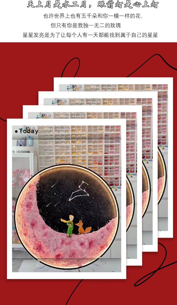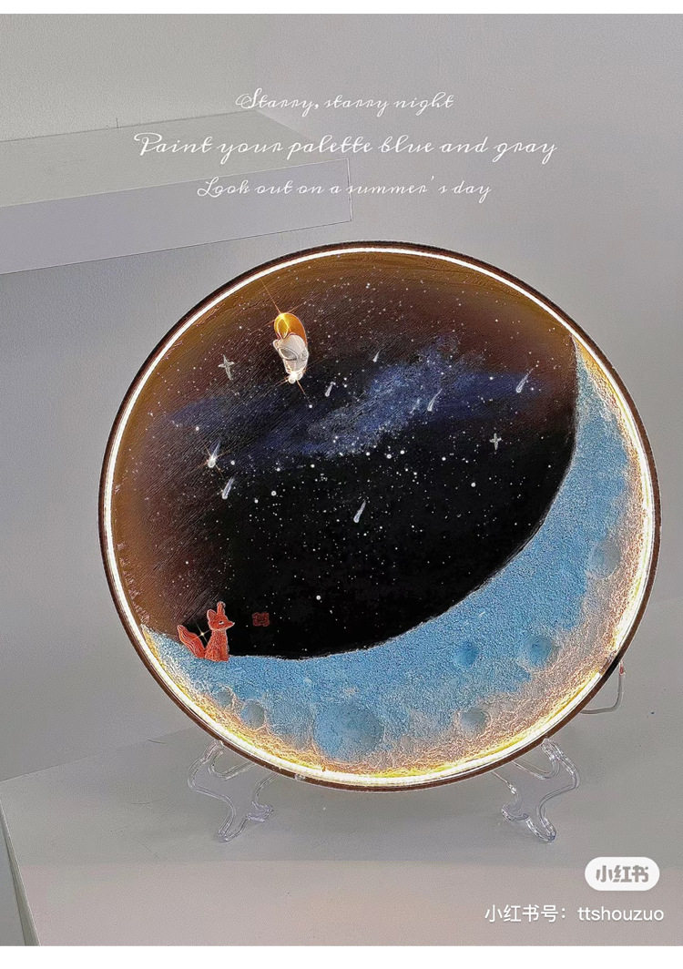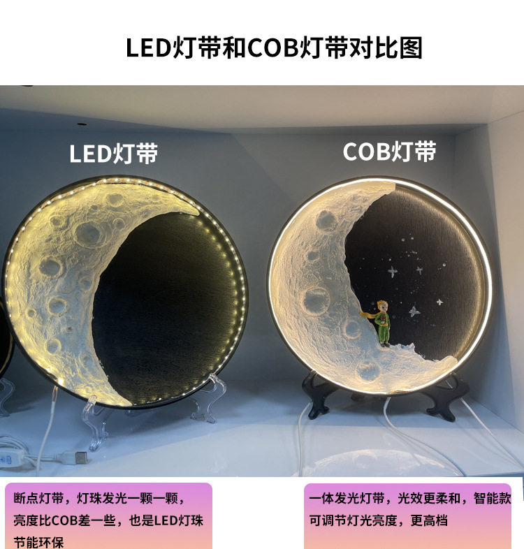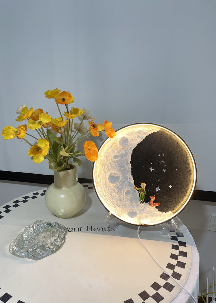 | Light Color | Moon light material package [LED]],Moon lamp material package [COB lamp ordinary]],Moon lamp material package [COB lamp Smart]],Ultra-light clay 100g,LED lights with wire,COB ordinary light strip wire,COB intelligent light strip wire,Quartz sand,Bracket,12 cups.,100ml acrylic paint,Black disc,The little Prince stood holding flowers,The little Prince sat on a tree stump and held flowers.,Little Fox,The little Prince squatting,Astronaut Moon Ornament |