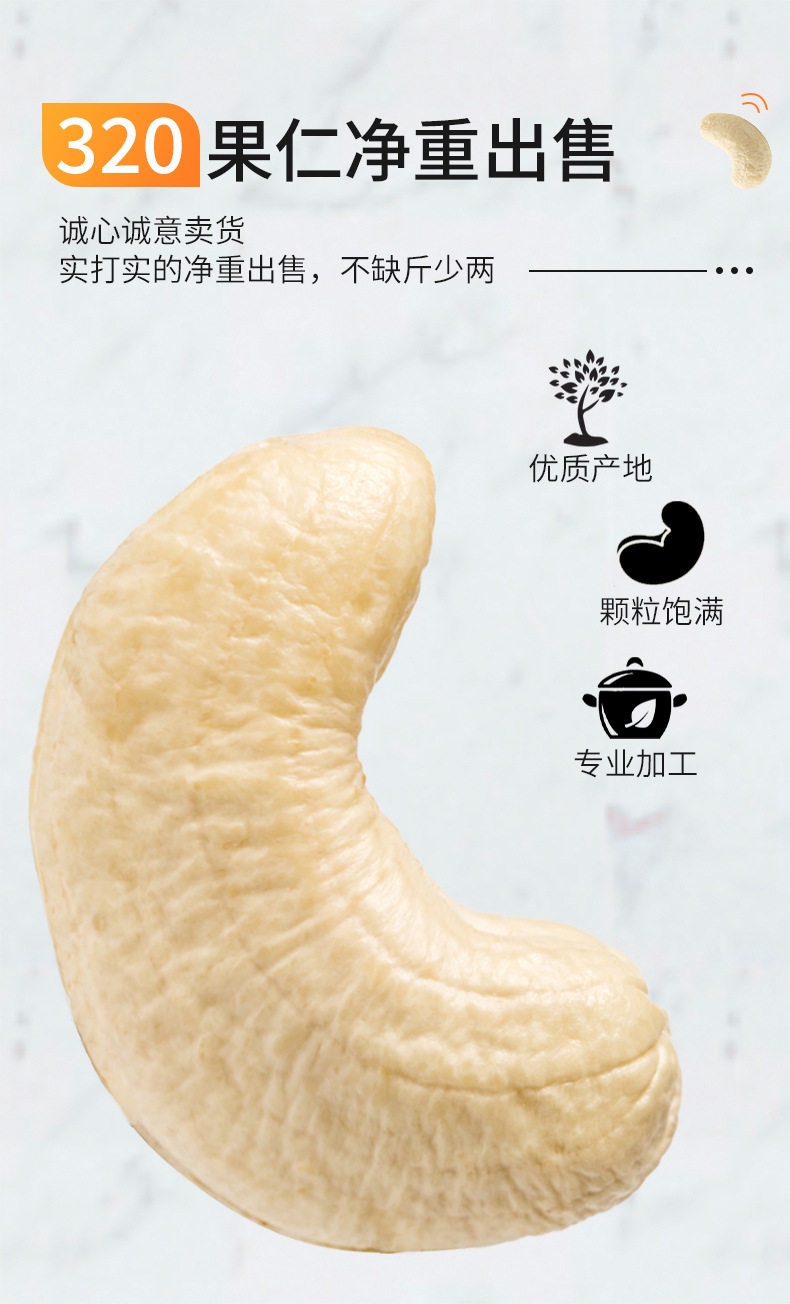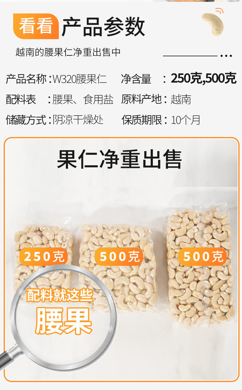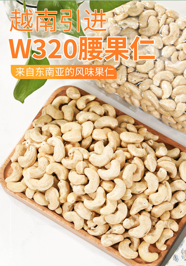 | Packaging specifications | W320 peeled original raw cashew nuts net weight 500g/pack,W320 peeled original raw cashew nuts net weight 250g/pack |