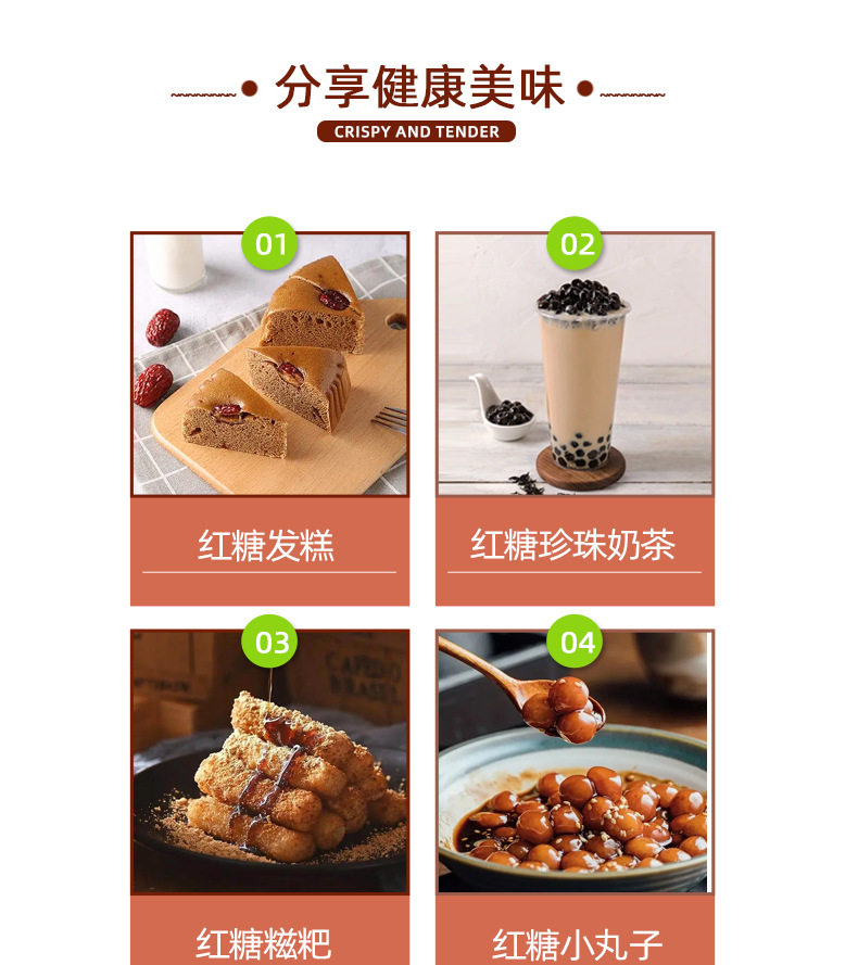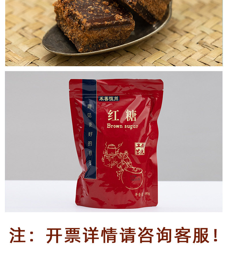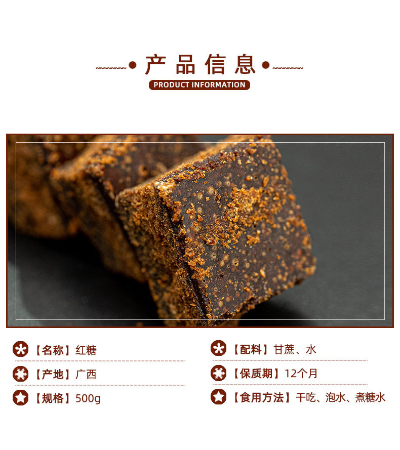 | Packing specification | Original brown sugar 250 g/bag,Original black sugar 250g/bottle,Old ginger black sugar 250g/bottle,Raw juice brown sugar 250g/bottle |