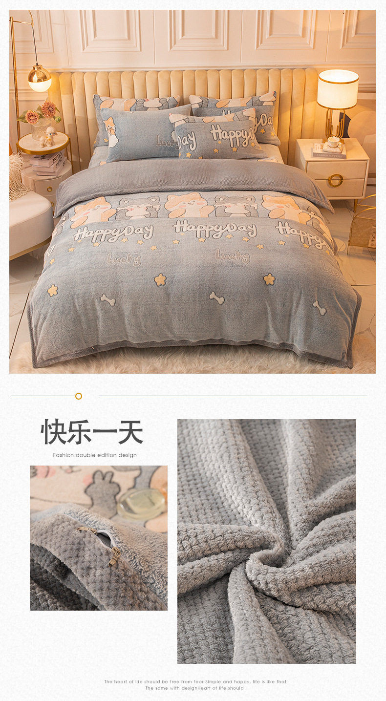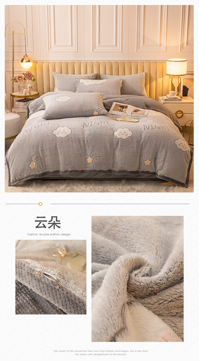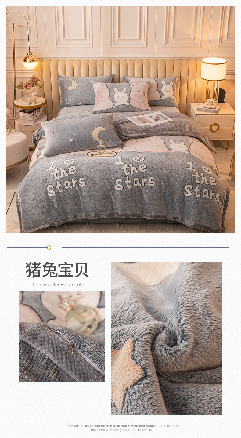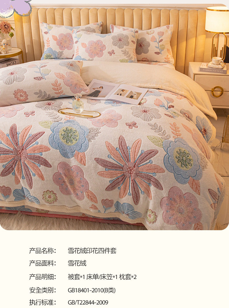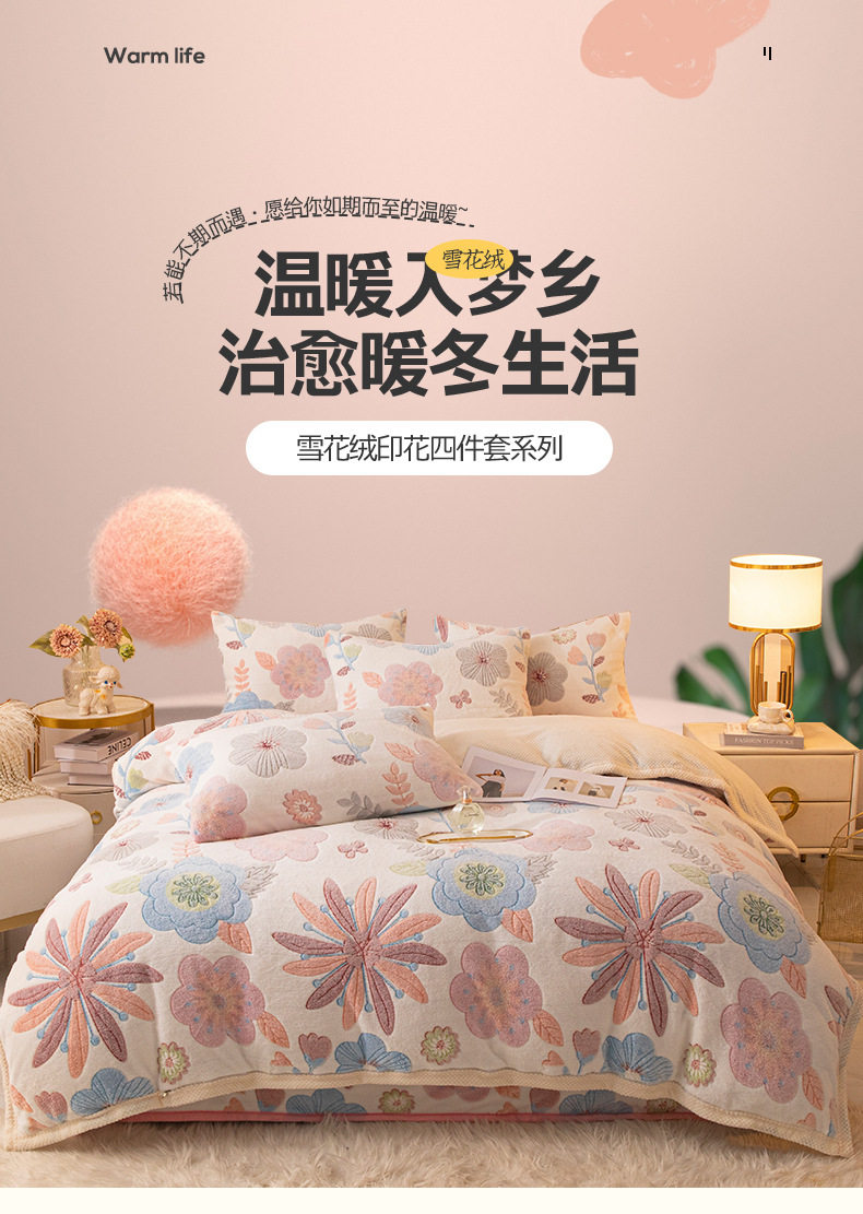Cartoon Snowflake Fleece Four-piece Set Cute Thickened Coral Fleece Season Warm Double-sided Fleece Bed Sheet Quilt Cover Flannel Bedding