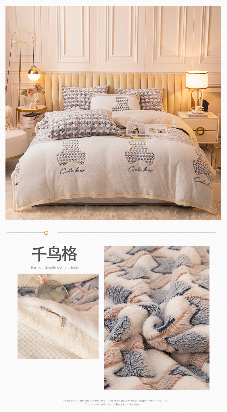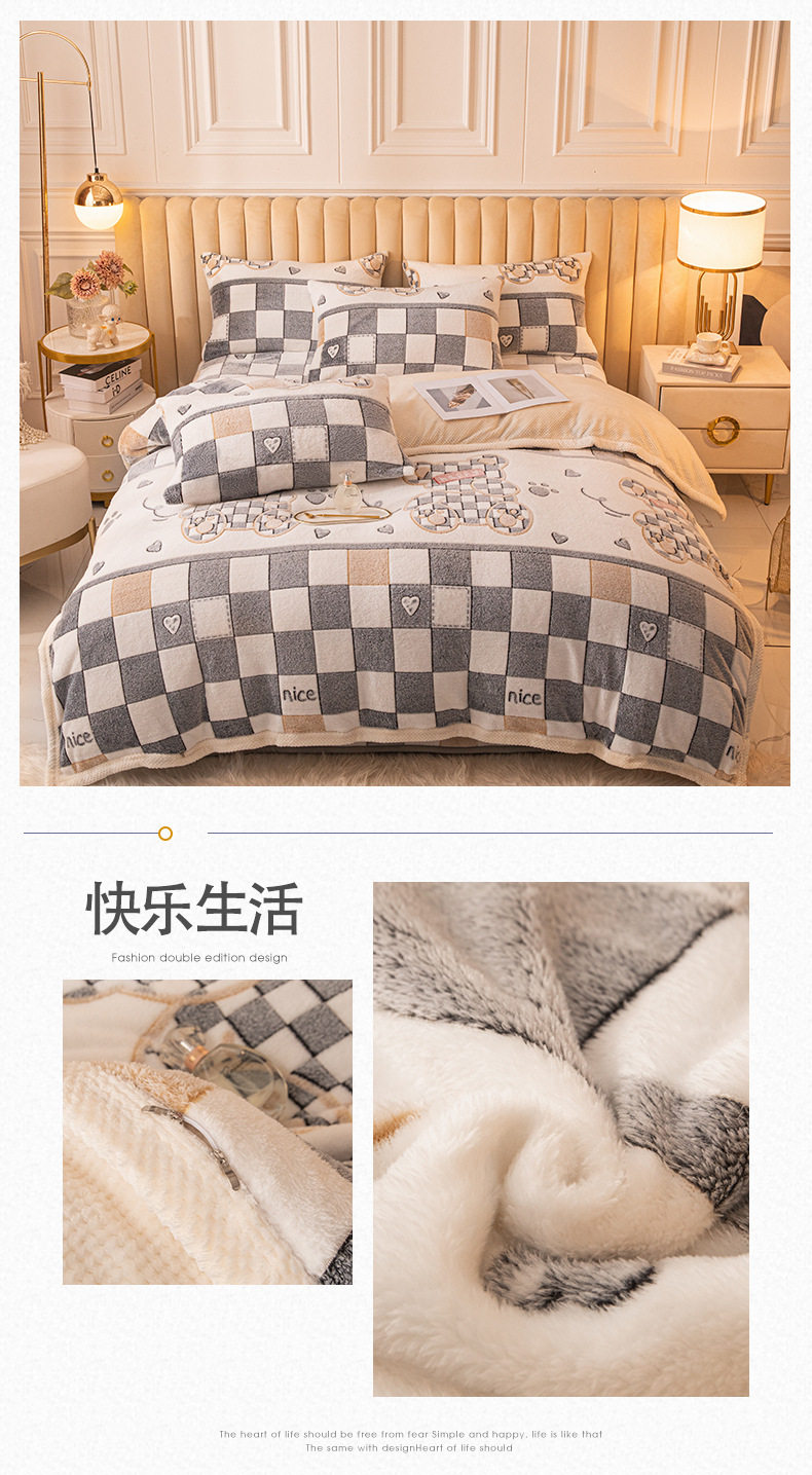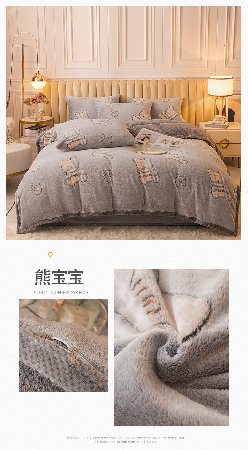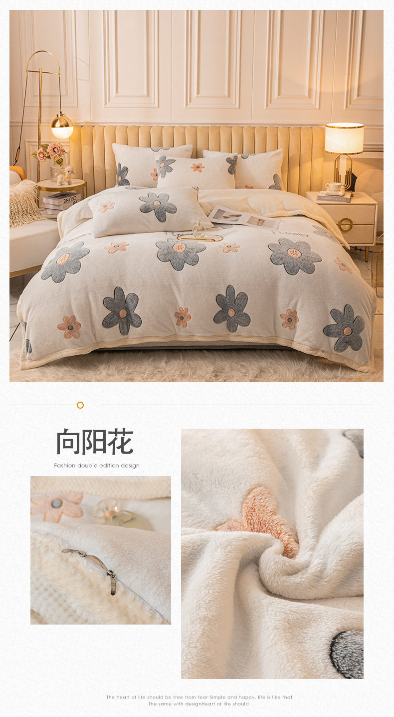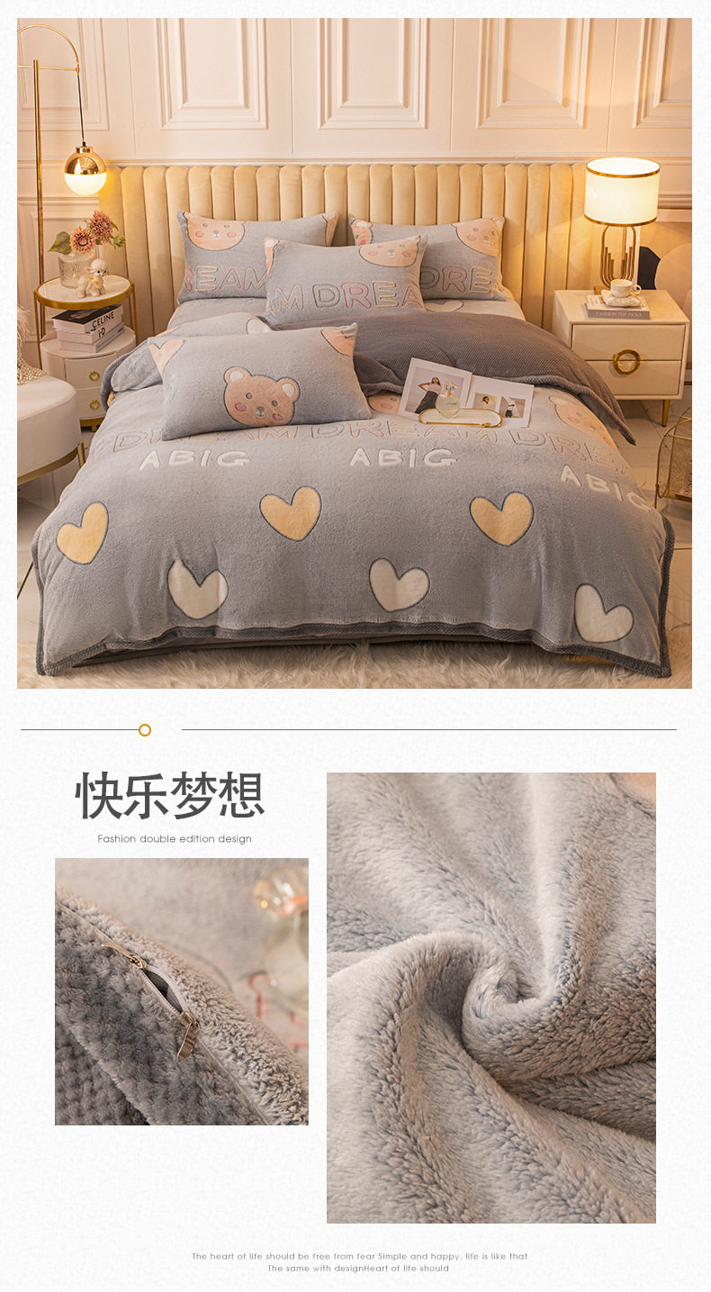 Cartoon Snowflake Fleece Four-piece Set Cute Thickened Coral Fleece Season Warm Double-sided Fleece Bed Sheet Quilt Cover Flannel Bedding
