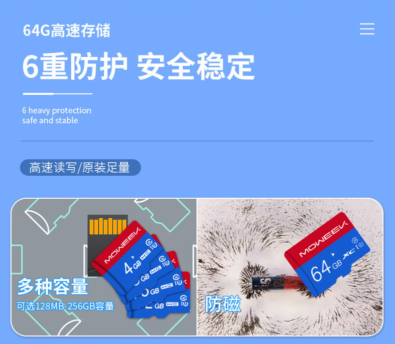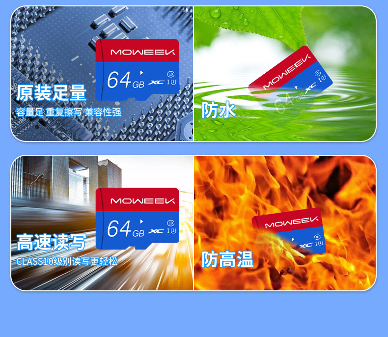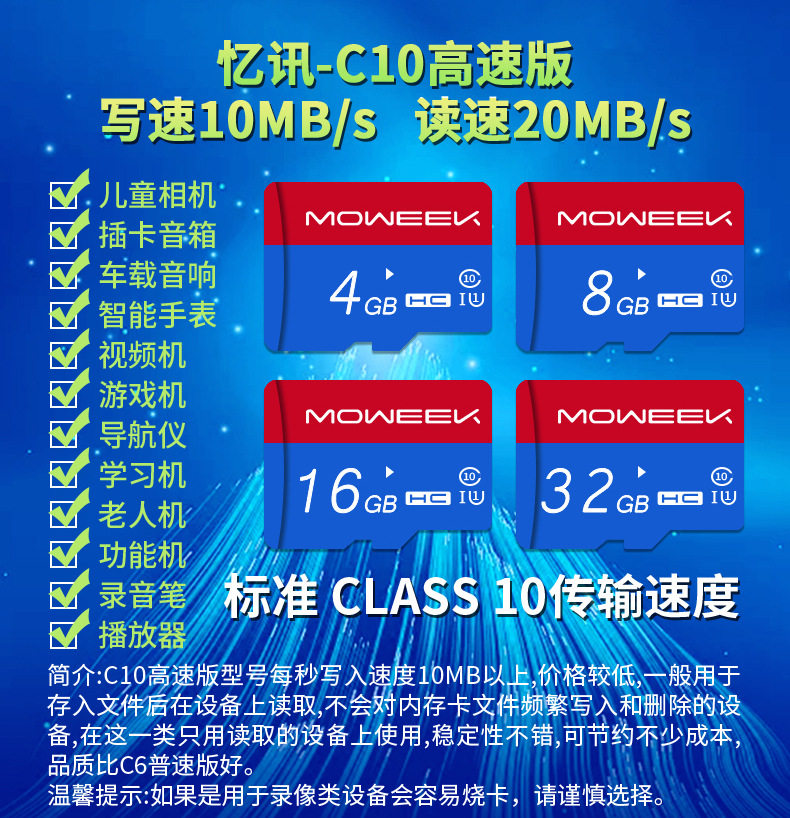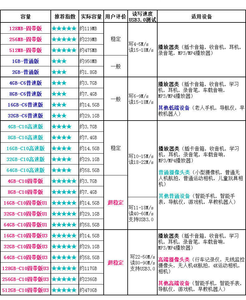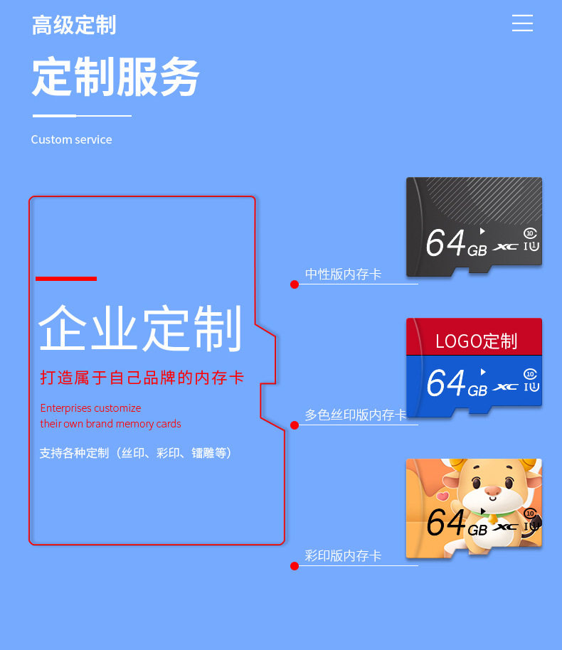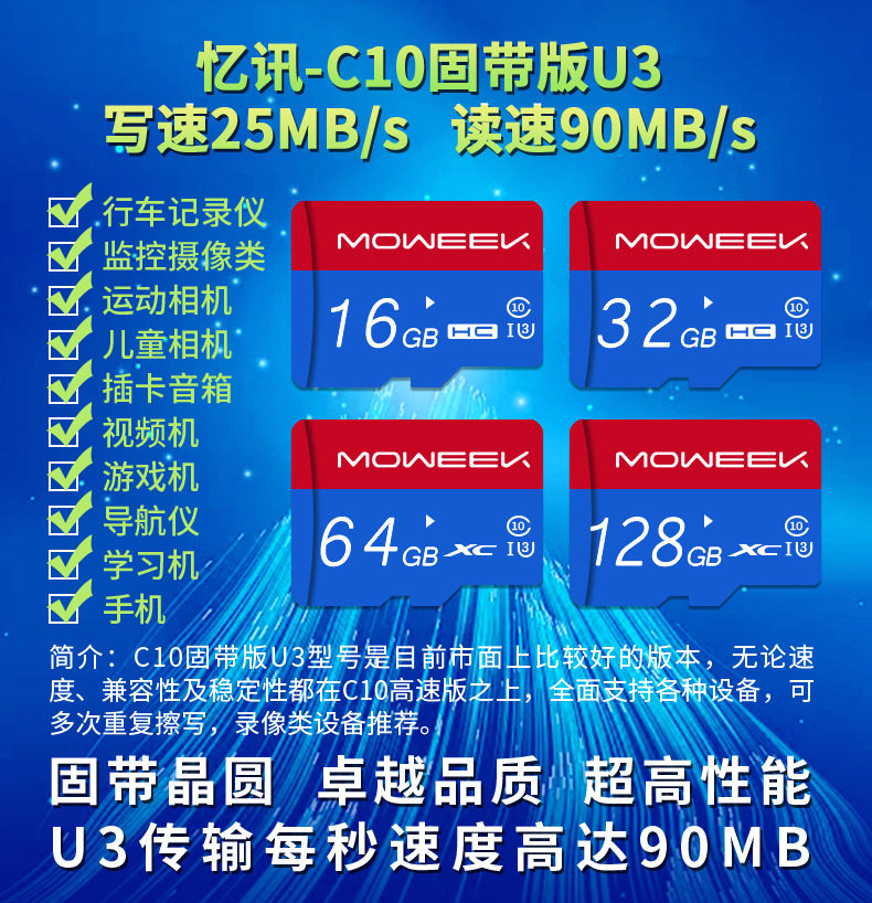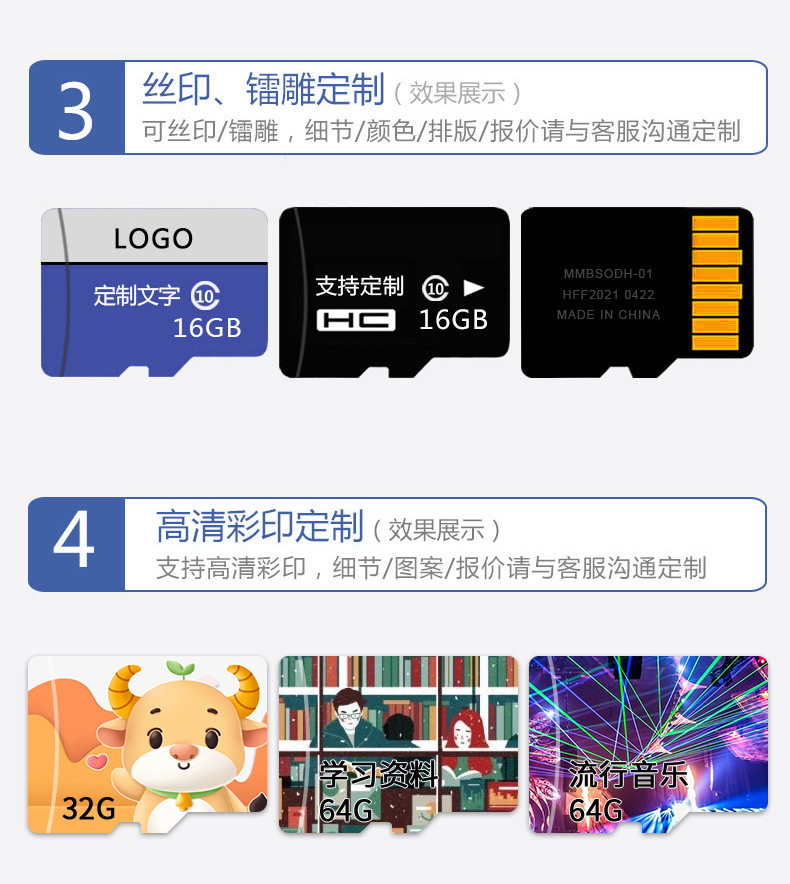 | Capacity | 128MB,256Mb,512MB,16GB-C10-U1,32GB-C10-U1,64GB-C10-U1,16GB-C10-U3,32GB-C10-U3,64GB-C10-U3,128GB-C10-U3,256GB-C10-U3,512GB-C10-U3,4GB-C10 High Speed Edition,8GB-C10 High Speed Edition,16GB-C10 High Speed Edition,32GB-C10 High Speed Edition,4GB-C10 solid belt version,8GB-C10 solid belt version |