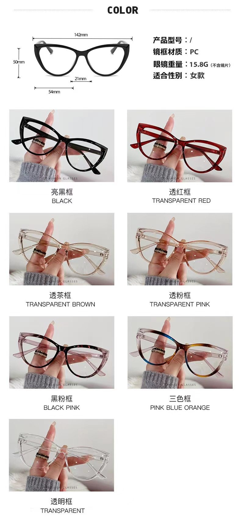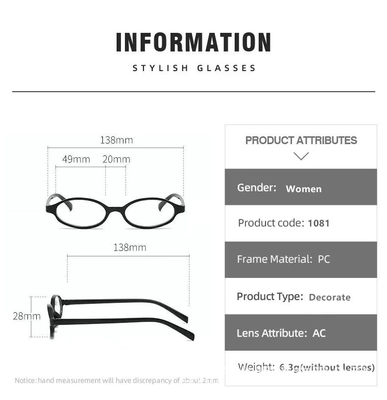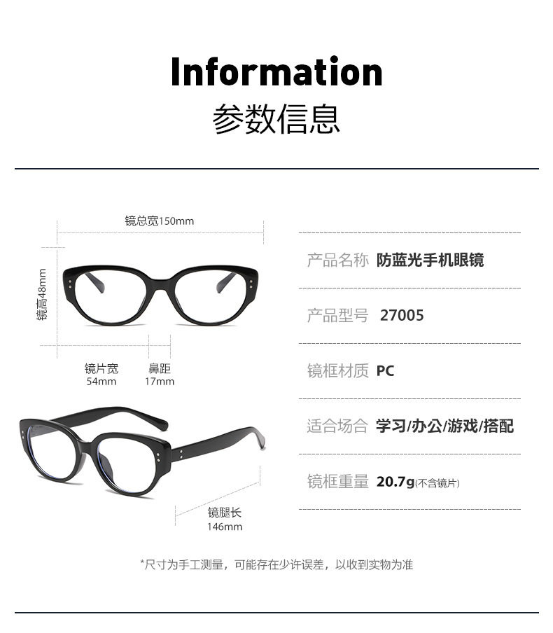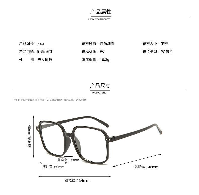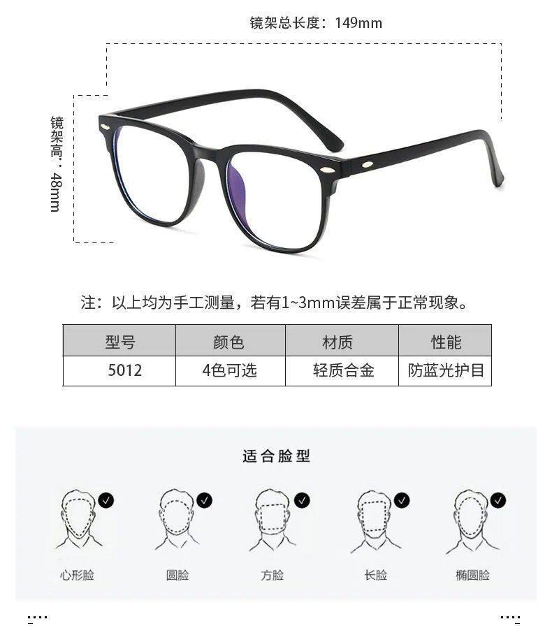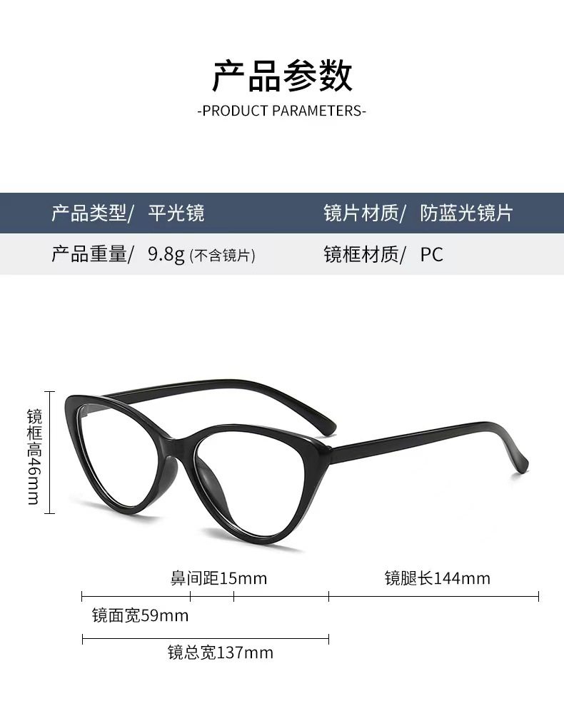 | Frame color | Small oblate + black + anti-blue light,Small oblate + brown + anti-blue light,Small oblate + red + anti-blue light,Small oblate + gradient blue + anti-blue light,Kitten eye style + black frame + anti-blue light,Kitten eye style + brown + anti-blue light,Kitten eye style + transparent white + anti-blue light,Kitten eye style + pink + anti-blue light,Large round style + black + anti-blue light,Large round style + gray + anti-blue light,Large round style + pink + anti-blue light,Large round style + transparent white + anti-blue light,Big cat eye model + black + anti-blue light,Big cat eye style + colorful + anti-blue light,Amazon wings + black + anti-blue light,Amazon wings + purple + anti-blue light,Amazon wings + pink + anti-blue light,Amazon wings + blue + anti-blue light,Amazon wings + transparent white + anti-blue light,Amazon wings + leopard print + anti-blue light,Vertical point style + black + anti-blue light,Triangular rice nail style + black + anti-blue light,Triangular rice nail style + gray + anti-blue light,Triangular rice nail style + transparent white + anti-blue light,Triangular rice nail style + translucent brown + anti-blue light,Horizontal section + black + anti-blue light,Horizontal section + translucent gray + anti-blue light,Horizontal section + transparent white + anti-blue light,Horizontal section + gradient black + anti-blue light,Jiaer cat eye + black + anti-blue light,Jiaer cat eye + white + anti-blue light,Jiaer cat eye + beige + anti-blue light,Jiaer cat eye + translucent gray + anti-blue light,1011 black,1011 sand tea,1011 transparent,1011 transparent gray,1957 bright black,1957 transparent tea,1957 transparent,1957 transparent gray,105 large frame gloss black,105 large frame transparent,105 large frame transparent gray |