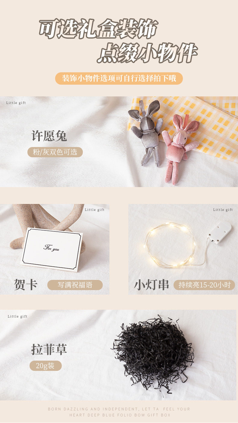 | Specification | Greeting card,String lights,Pink wishing rabbit,Gray wishing rabbit,Gift box 20*18*8cm,Gift box 15*15*7cm,Gift box 20*28*9cm,Gift box 35*25*10.5cm,35*25*10.5 matching gift bag,20*18*8 matching gift bag,15*15*7 matching gift bag,20*28*9 matching gift bag,Black raffia (20g),Large meteor planet (15g),Gift box 33*25*8cm,33*25*8 matching gift bag |