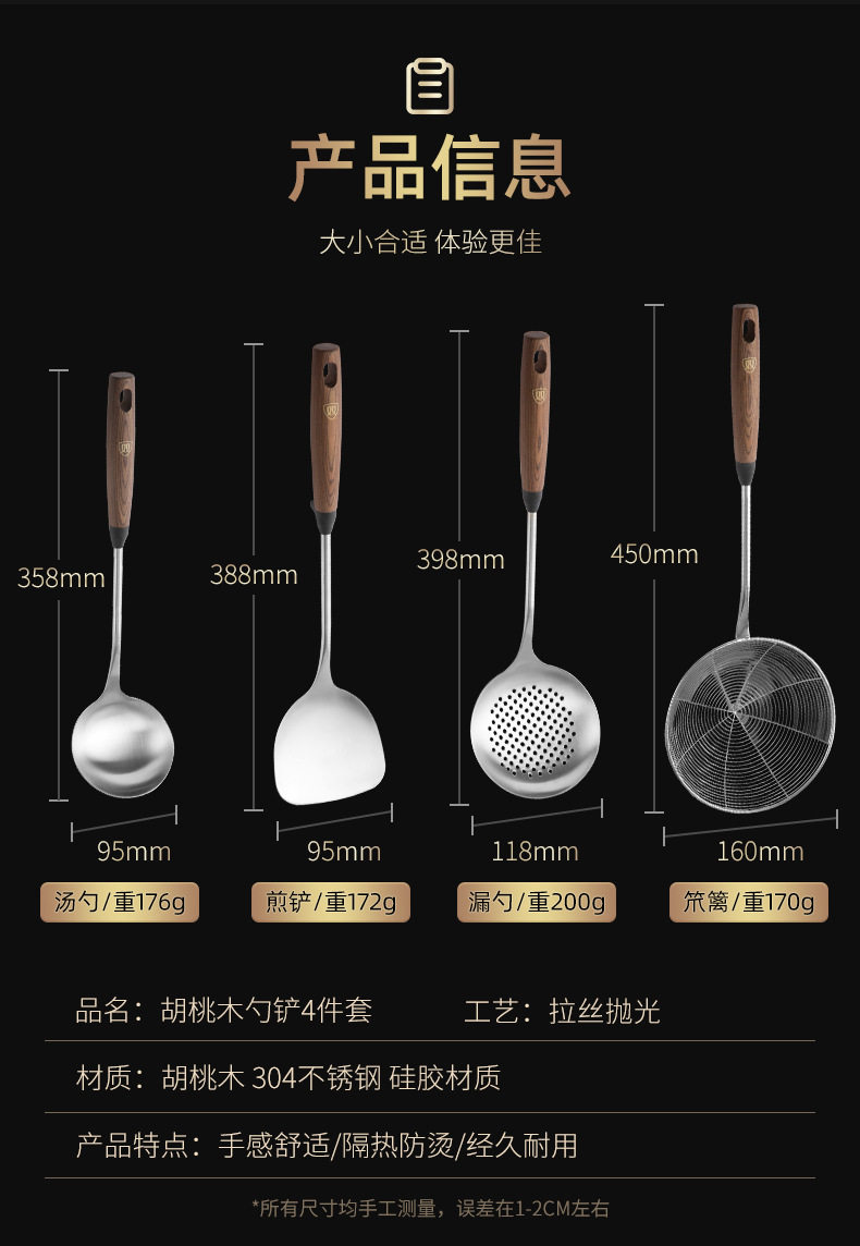 | Dimensions | Walnut handle 304 stainless steel soup spoon 388x 95 QC33700,Walnut handle 304 stainless steel colander 398x 118 QC33901,Walnut handle 304 stainless steel spatula 388x 95 QC33900,Walnut handle 304 stainless steel wire leakage 450x 160 QC34400,Four-piece QC33900-4 |