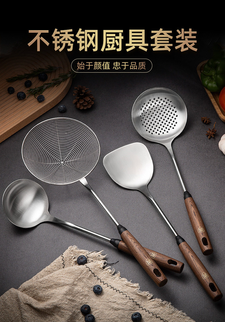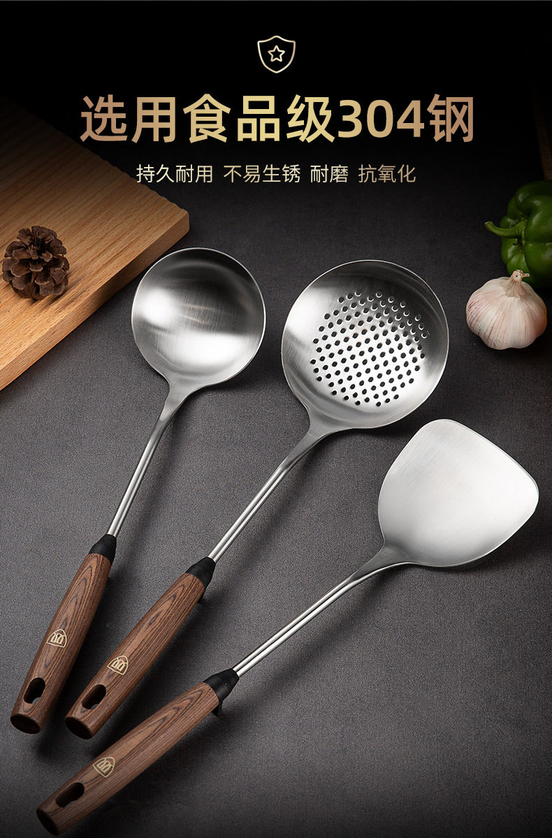 Double gun 304 stainless steel spatula household anti-scalding walnut handle soup spoon Colander wire leakage kitchenware set Wholesale