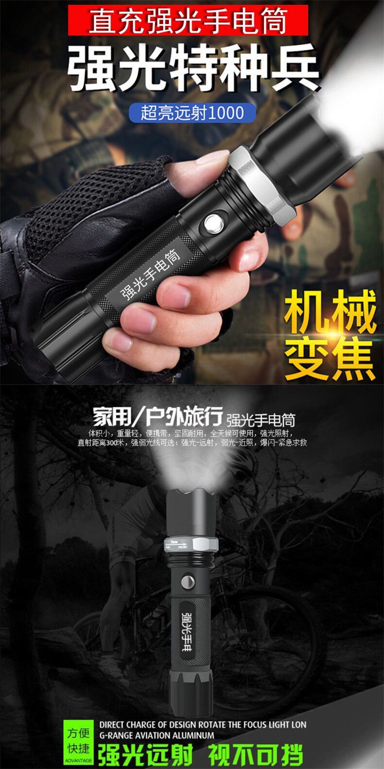 Cross mirror new LED charging zoom aluminum alloy outdoor waterproof strong light multifunctional household portable flashlight