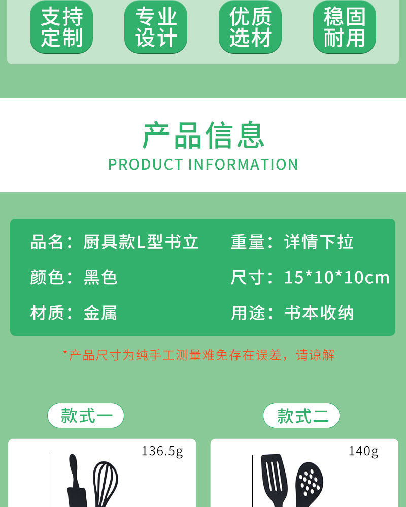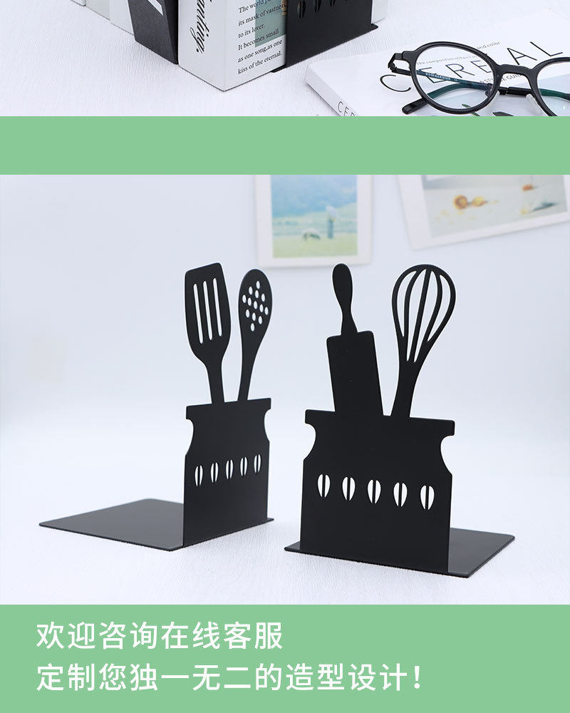 | Color | Black mixer single,Black spatula bookend single,Yellow deer bookends (set of two),Red elephant bookends (set of two),Green dinosaur bookends (set of two),Pure white bookend single,Pair of black kitten bookends |