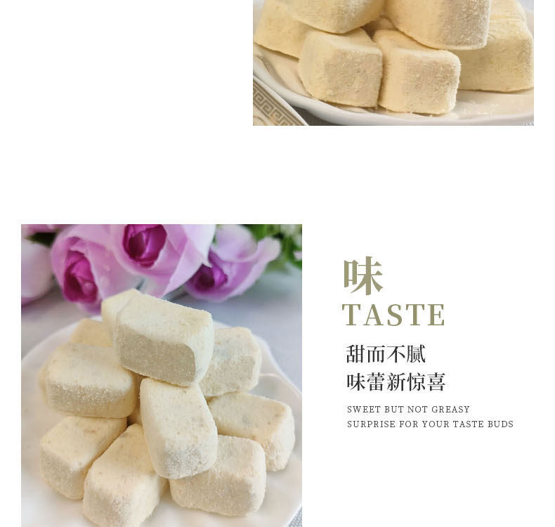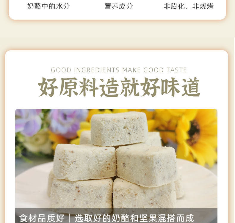 | Packing specification | 28*18*15mm almond flavor (1kg),28*18*15mm pine nut flavor (1kg),Grade B 32*28*15 cashew cheese pieces (1kg) |