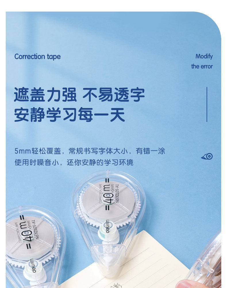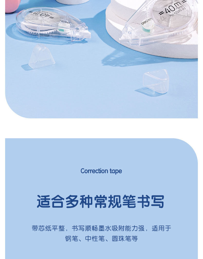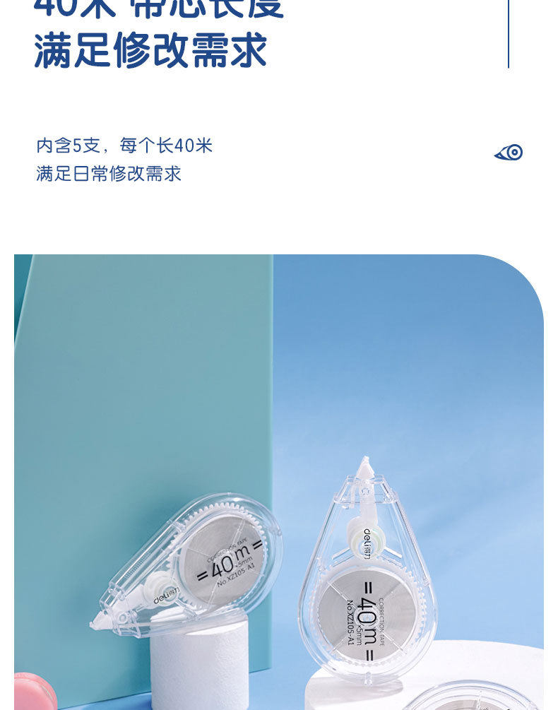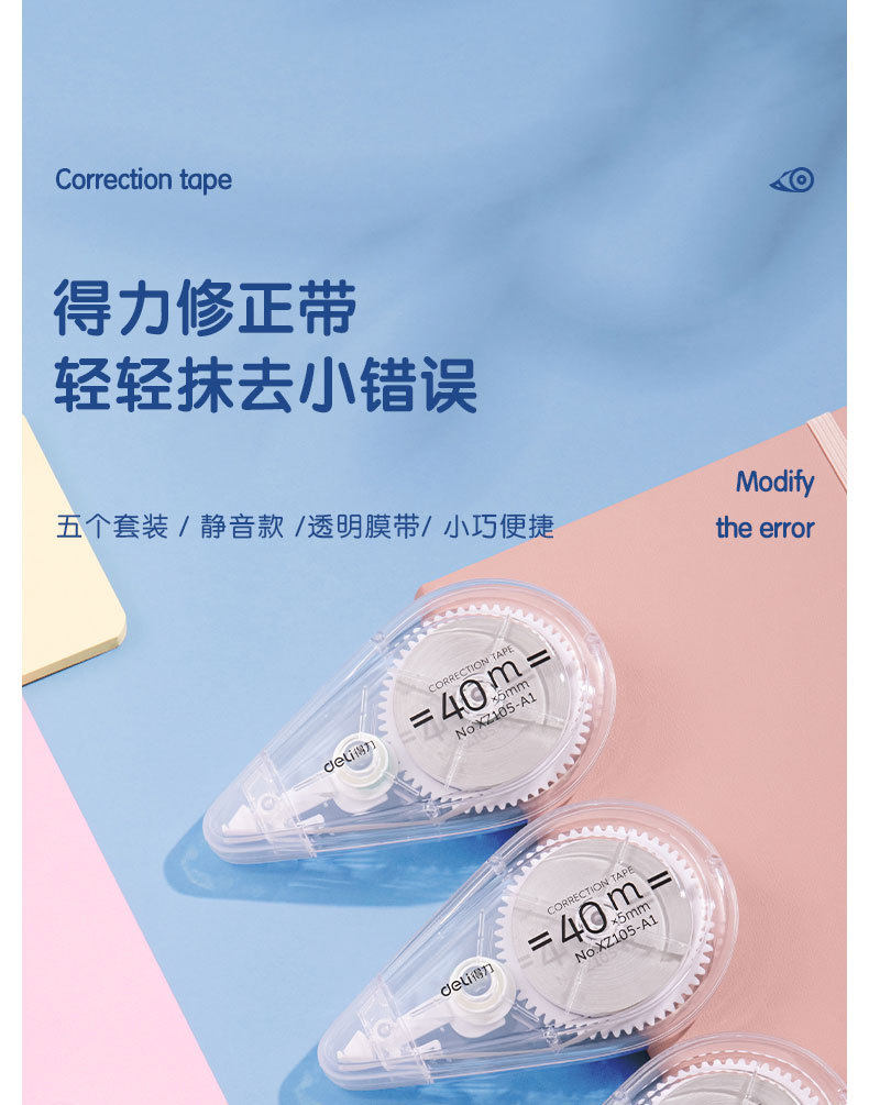 Deli Xz105-A1 Correction Tape 40m Transparent Correction Tape for Students with Large Capacity Light Correction Tape 5 Pack