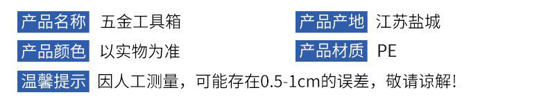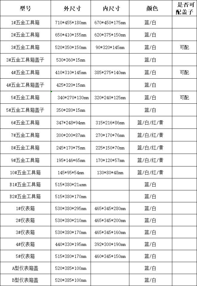 | Specifications | 710 1*455*180,650 2*410*155,No. 3 520*350*150,410 4*310*145,340 5*270*130,380 6*240*100,No. 7 300*200*90,No. 8 250*175*75,No. 9 200*130*60,No. 10 155*100*55,B1# hardware toolbox 780*490*230,B2# hardware toolbox 495*340*170,1# instrument box 515*380*290,2# instrument box 515*380*210,3# instrument box 515*380*170,4# instrument box 435*325*295,Type a meter box cover 520*385*100,Type B meter box cover 520*385*100,No. 3 lid 530*360*15,No. 4 lid 425*320*15,No. 5 lid 350*280*15 |
