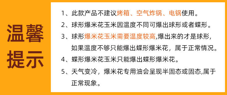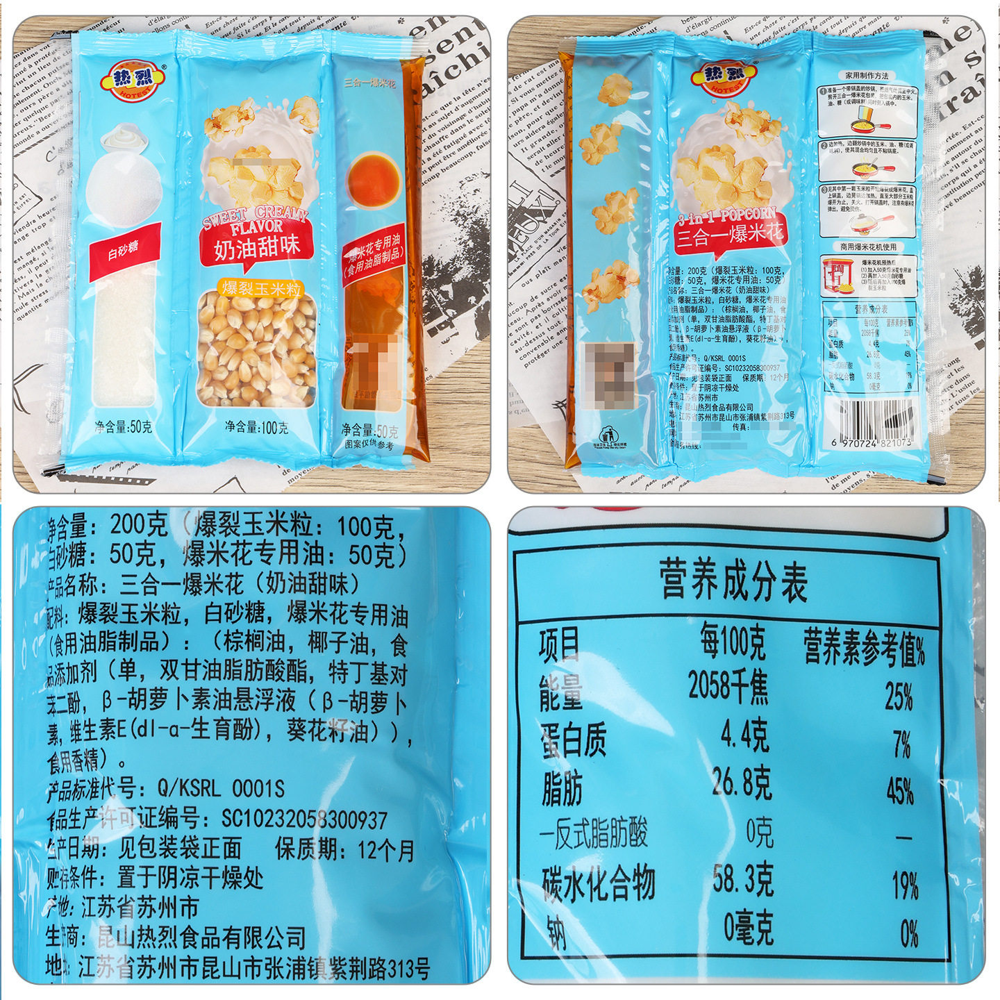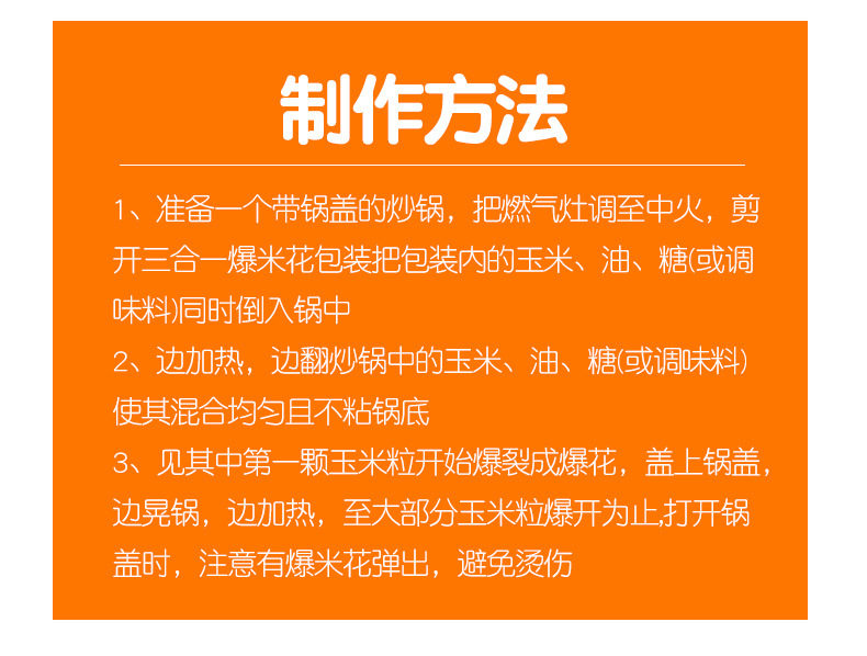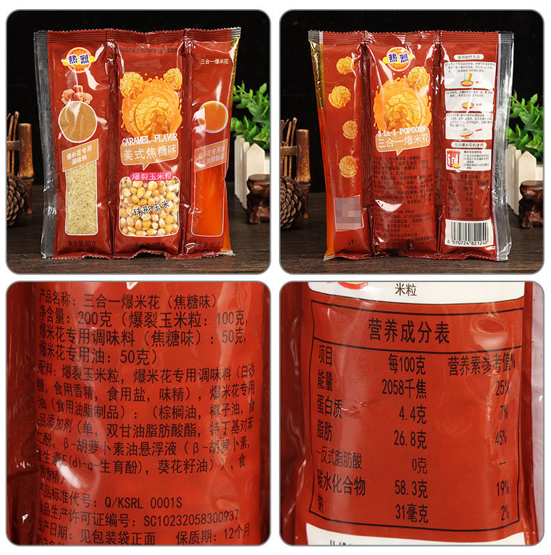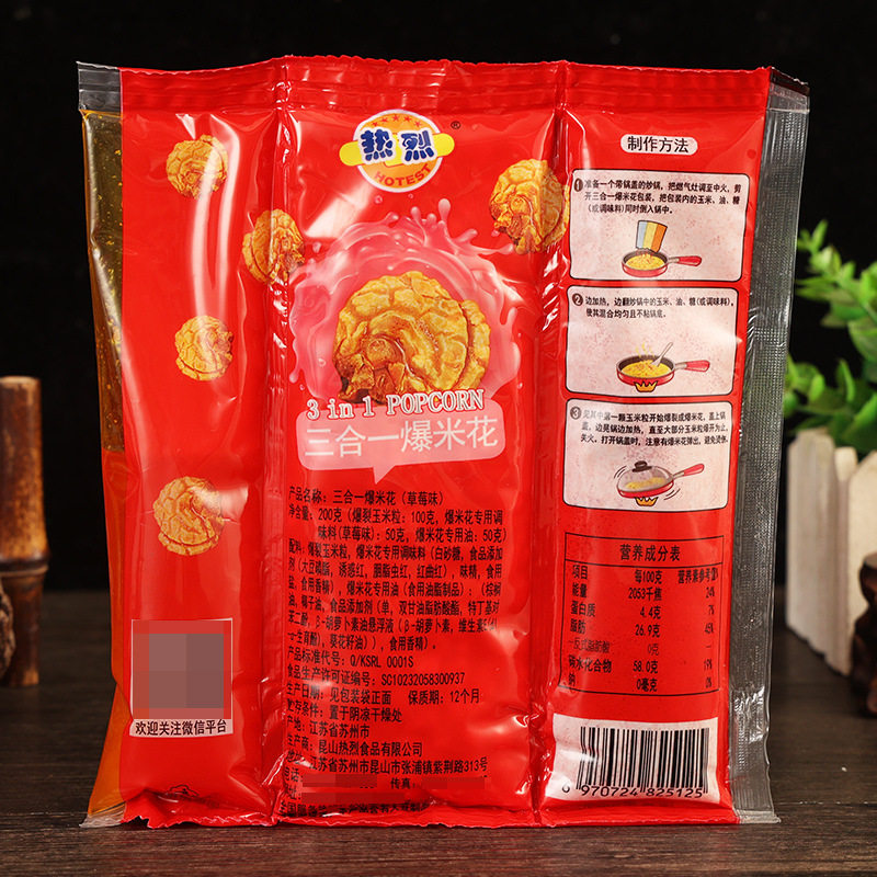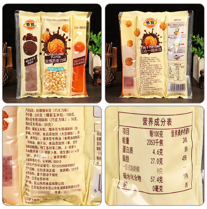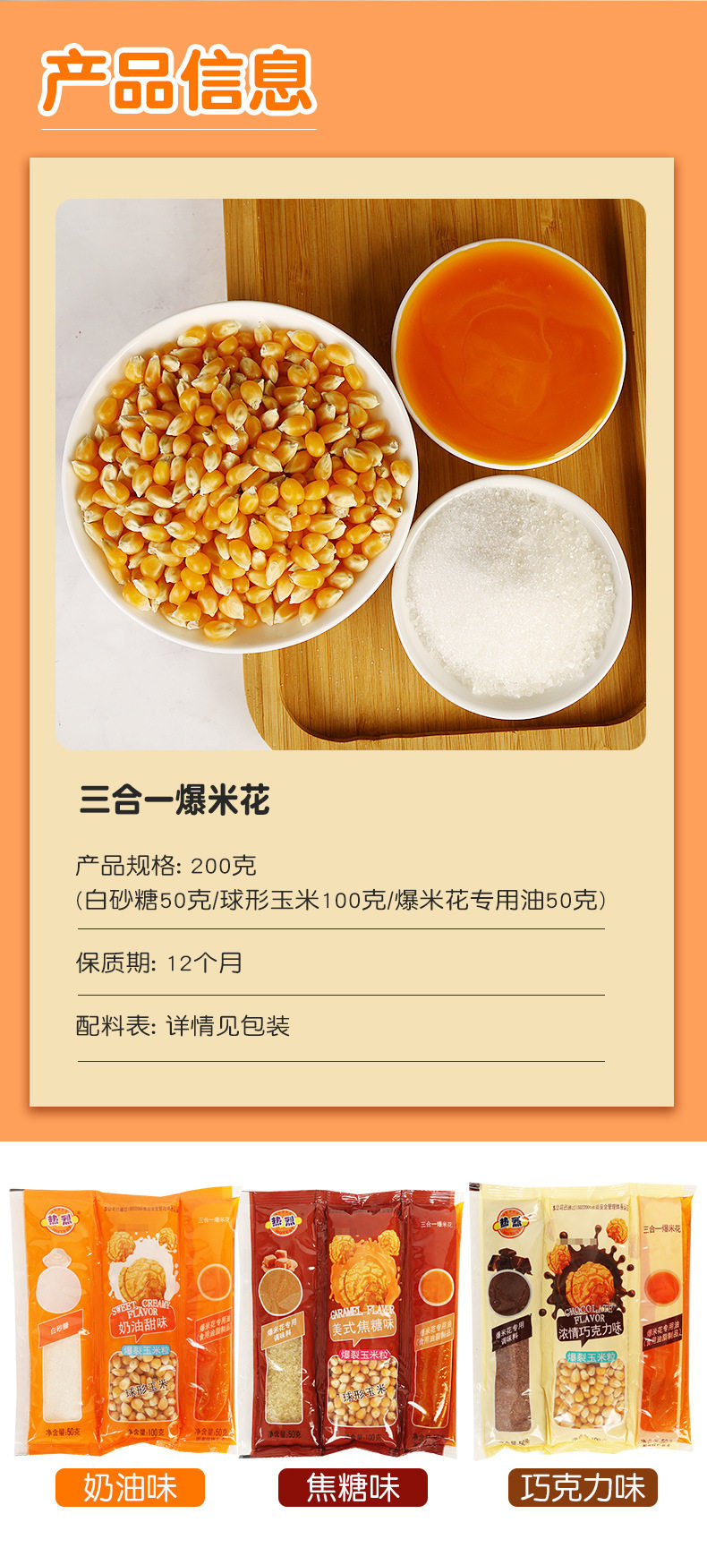 | Raw materials and ingredients | Burst corn kernels, white sugar, Popcorn special oil (Edible oil products); Palm oil, coconut oil, etc., subject to the actual information of the product packaging. |
