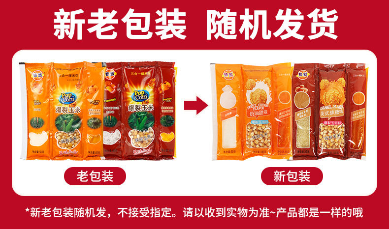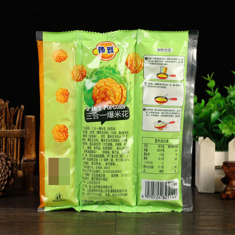 | Packaging specifications | 200g warm three-in-one popcorn [cream sweet] (spherical) * 1 bag,200g warm three-in-one popcorn [caramel flavor] (spherical) * 1 bag,200g warm three-in-one popcorn [sweet strawberry flavor] (burst) * 1 bag,200g warm three-in-one popcorn [chocolate flavor] (spherical) * 1 bag,200g warm three-in-one popcorn [cream sweet] * 1 bag,200g warm three-in-one popcorn [Japanese matcha flavor] (burst) * 1 bag |