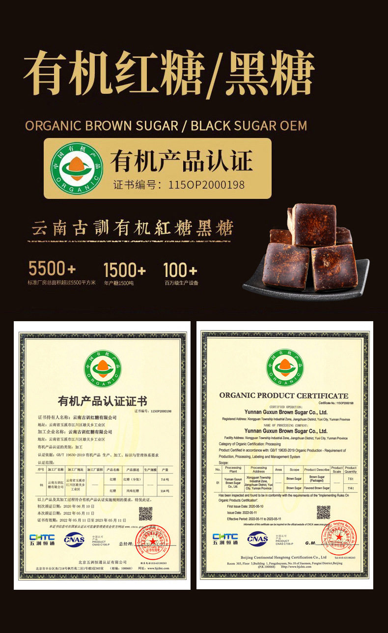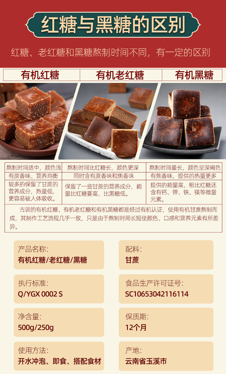 | Packaging specifications | Ancient times organic brown sugar 500g,Ancient times organic brown sugar 500g,Ancient times organic old brown sugar 500g,Ancient times organic brown sugar 250g,Ancient times organic brown sugar 250g,Ancient times organic old brown sugar 250g,Ancient times Xinping raw brown sugar 1kg,Yunnan original juice brown sugar 500g |