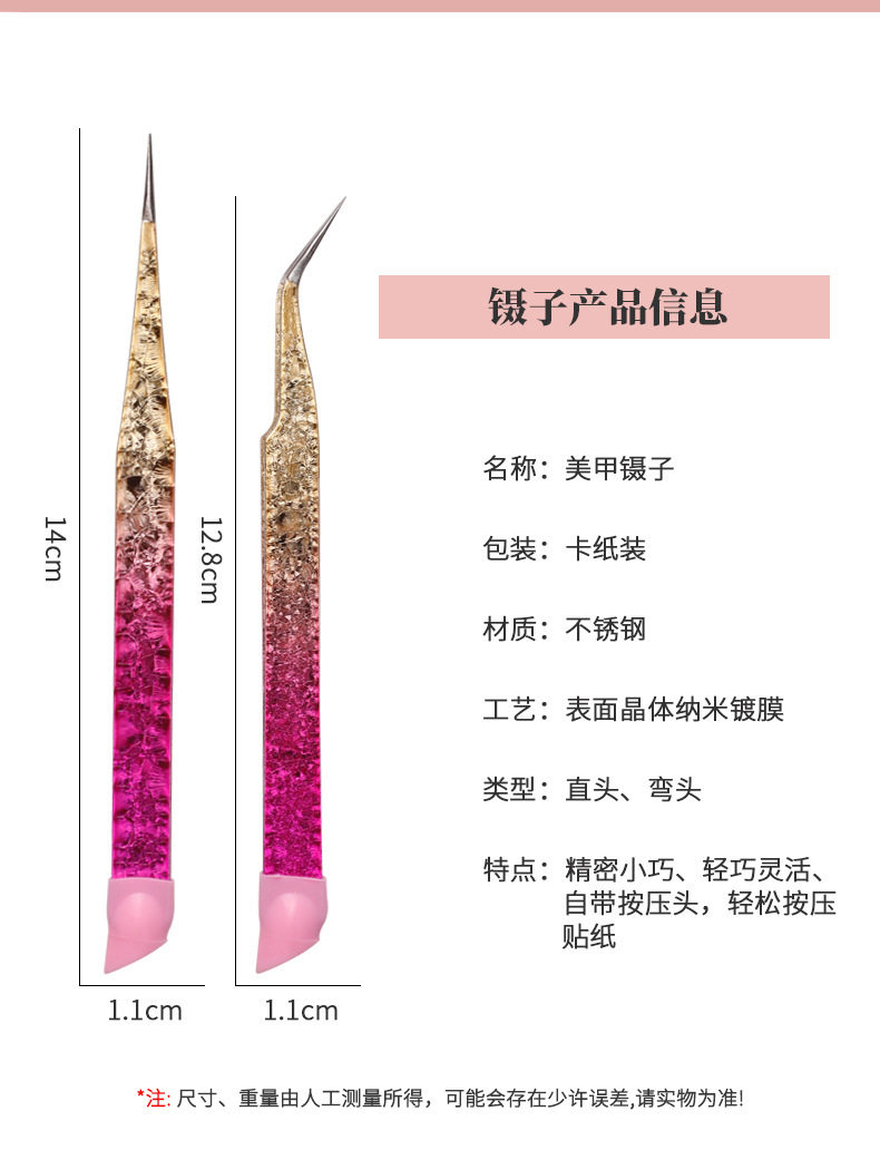 | Color classification | Nano crystal plated double-ended tweezers#Elbow,Nano crystal plated double-ended tweezers#Straight head,Nano-plated crystal double-ended tweezers set of 2 pieces,Ice crystal blue double-ended tweezers#Elbow,Ice crystal blue double-ended tweezers#Straight head,Ice crystal blue double-ended tweezers set of 2 pieces,Pink double-ended tweezers#Elbow,Pink double-ended tweezers#Straight head,Gradient powder double-ended tweezers set of 2 pieces,Nano water pattern double-ended tweezers (butterfly tweezers),Nano water pattern double-ended tweezers (peacock tweezers),Patterned double-ended tweezers#Straight head,Patterned double-ended tweezers#Elbow,Electroplated rose red tweezers#Straight head,Electroplated rose red tweezers#Elbow,Zebra pattern double-ended tweezers set of 2 pieces,Zebra pattern double-ended tweezers#Elbow,Zebra pattern double-ended tweezers#Straight head |