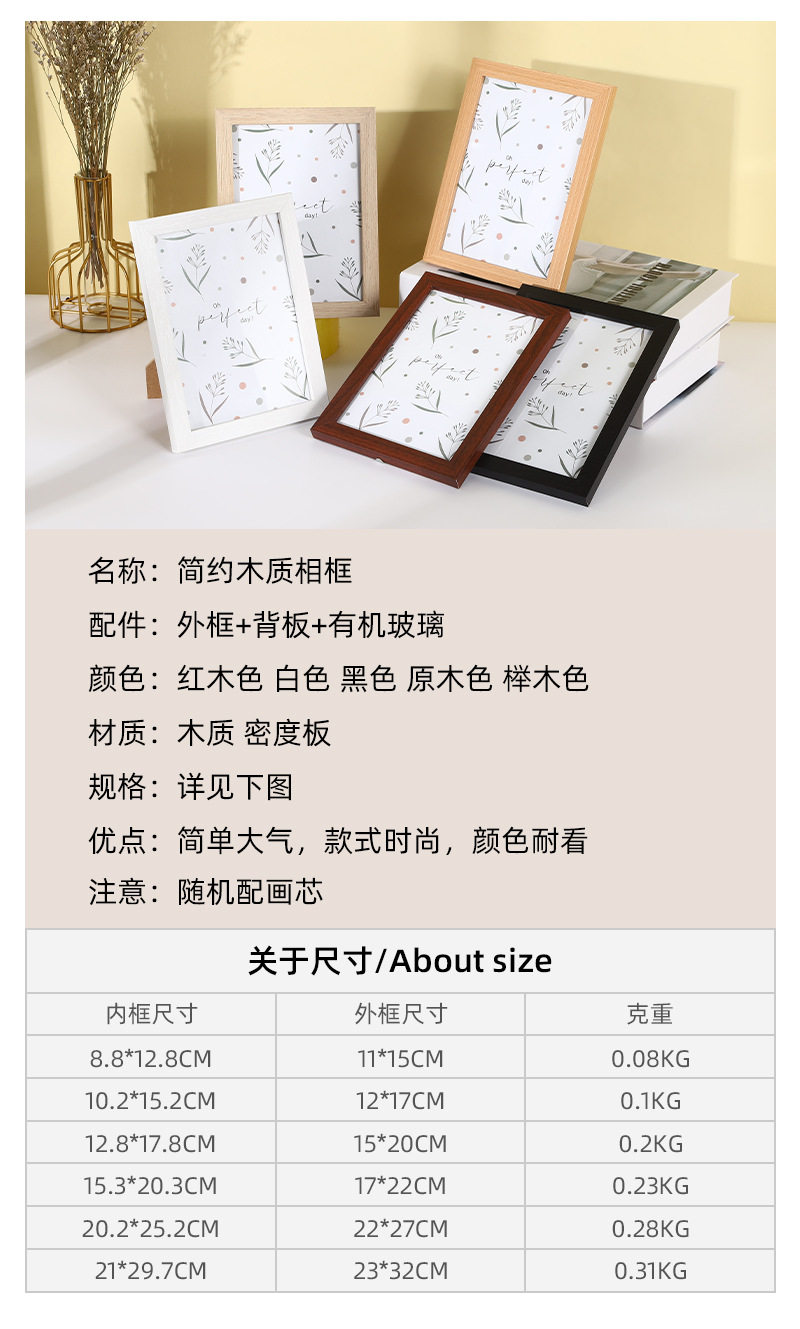 | Frame size | 5inch : inner frame: 8.8*12.8/outer frame: 11*15,6inch inner frame: 10.2*15.2/outer frame: 12*17,7inch : inner frame: 12.8*17.8/outer frame: 15*20,8inch : inner frame: 15.3*20.3/outer frame: 17*22,10inch : inner frame: 20.2*25.2/outer frame: 22*27,A4: inner frame: 21*29.7/outer frame: 23*32 |