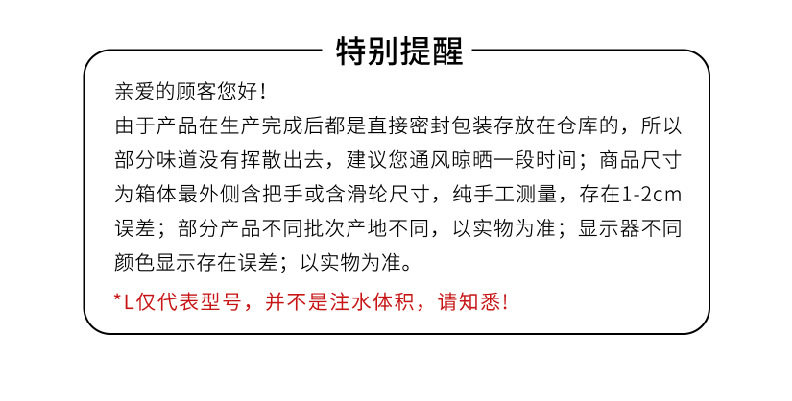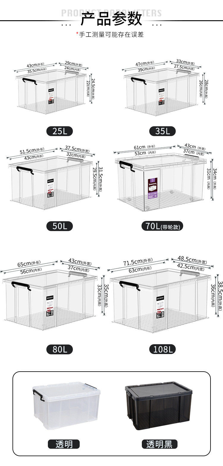 | Size | 4l 23*16*12cm [solid transparent color ~ exquisite small box],14l 32.5*23.5*19cm (right-angle box with handle, real transparent color~),25l without wheels: 44*29.2*24cm,35l without wheels: 46.5*33*28cm,50l without wheels: 51*37.5*31.5cm,65l flat long style without wheels: 65.5*43*24cmcm,70l pulley: 61*43*33.2cm,80l without wheels: 65*43*34.7cm,110l without wheels: 70.5*48*38cm |