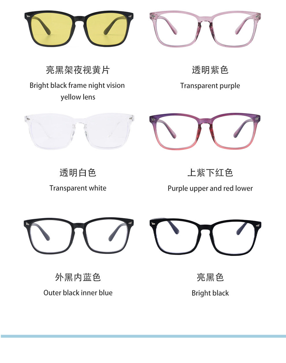 | Frame color | Tea bean color,Bright black frame night vision yellow film,Glossy black,Sand black,Purple on top and red on bottom,Transparent white,Transparent pink,Transparent purple,Tea outside and yellow inside,Black outside and purple inside,Contact customer service for customization,2197c transparent blue,2285c transparent green |