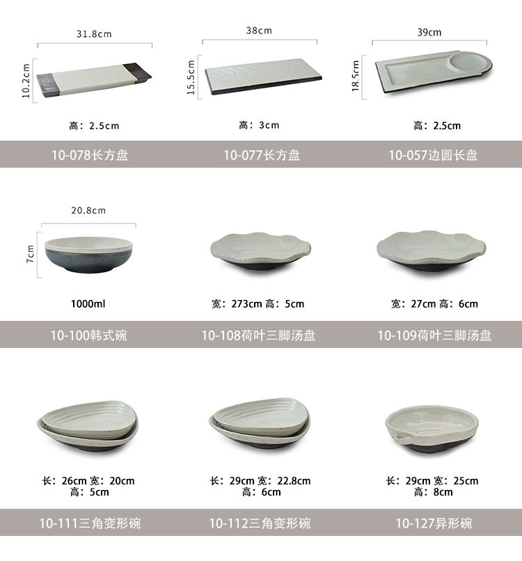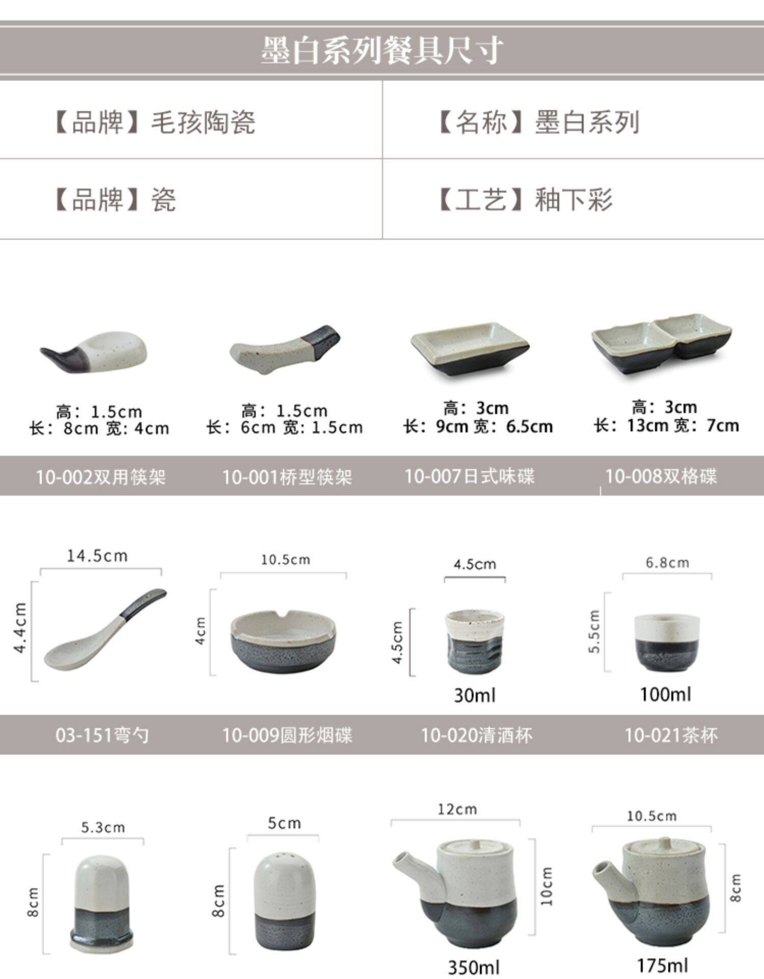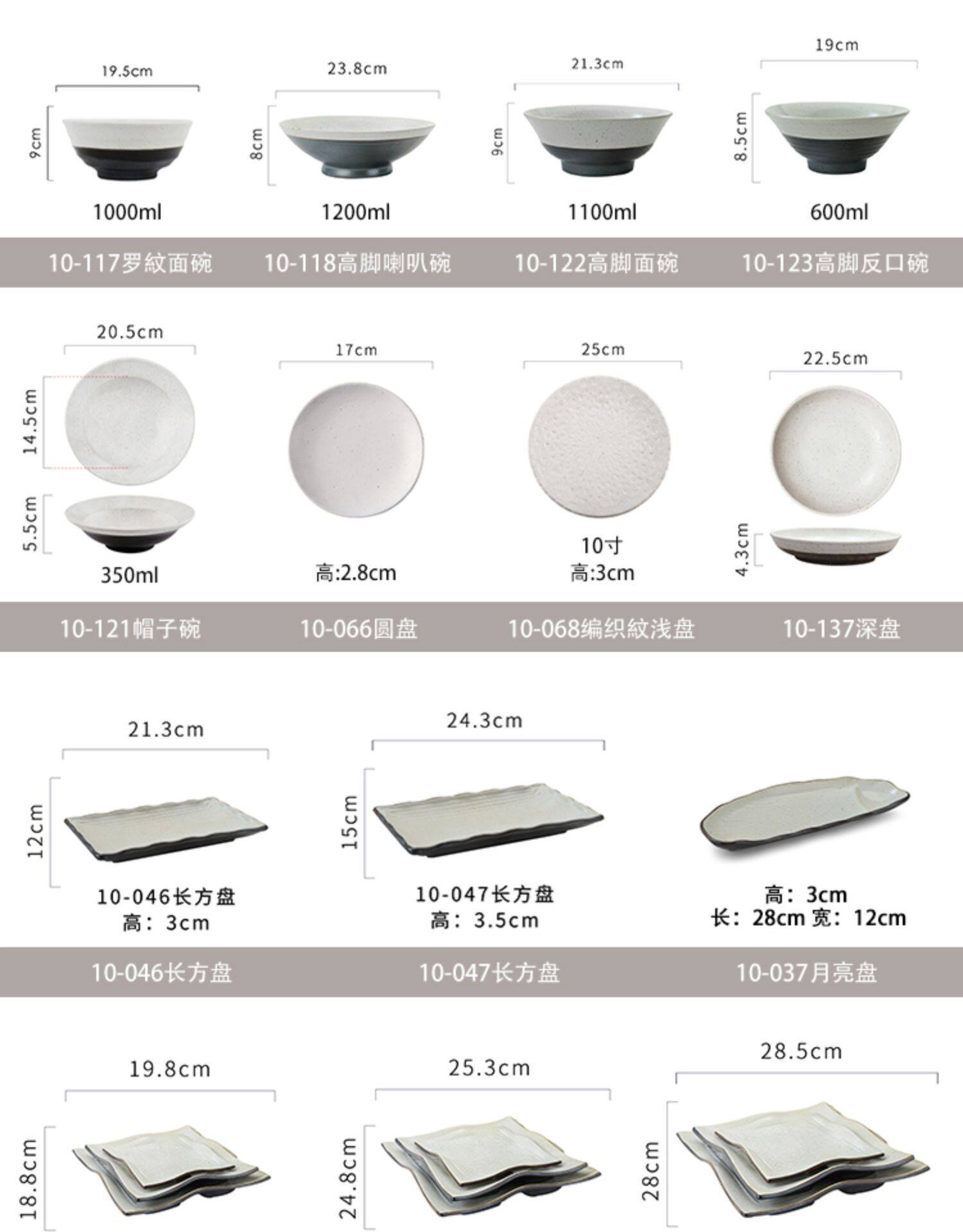 | Color | 10-002-Double Use Chopsticks Rack,10-001-Bridge-Shaped Chopsticks Rack,10-007-Japanese Flavor Dish,10-008-Double Disc,10-151-Curved Spoon,10-009-Round Cigarette Dish,10-013-Peach Mountain Pepper Bottle,10-015-Peach Mountain Flavor Pot,MH10-016-Peach Mountain Flavor Pot,10-018-toothpick holder with lid,10-021-Teacup,10-022-Straight Cup,10-023-Vintage Cup,10-203-Water Glass,10-020-sake glass,10-030-Wine flask,10-032-Small Teapot,10-149-Large Teapot,10-025-Egg Stew,10-027-Stew Pot,10-082-Rice Bowl,MH10-083-Wingbowl,10-084-Straight Bowl,10-085-Japanese Bowl,10-094 Horn Bowl,10-089-Square Bowl,10-095-Juice Bowl,10-101-Korean Bowl,10-100 Korean bowls,MH10-117-ribbed noodle bowl,10-118-Tapper Bowl,10-123-High-Foot Backmouth Bowl,10-127 Alien Bowl,10-122-High-Foot Noodle Bowl,10-035-Dish,10-037-Moon Disc,10-046 rectangular plate,10-047-rectangular dish,10-057-Edge Round Long Plate,10-108-Lotus Leaf Triangle Soup Plate,10-109 Lotus Leaf Triangle Soup Plate,10-072-rectangular water pattern plate (small),10-073-Rectangle Water Pattern Plate,10-074-Rectangular Water Pattern Plate,10-111 triangle deformation Bowl,10-112-Triangle Deformation Bowl,10-077-rectangular plate,10-078-rectangular dish,10-068 Weaving Plate,10-066-Shallow tray,10-181-Disc,10-182-Disc,10-183-Disc,10-137-Deep Plate |