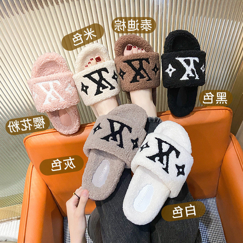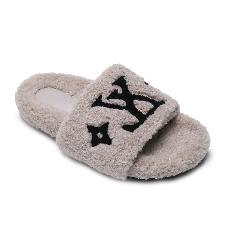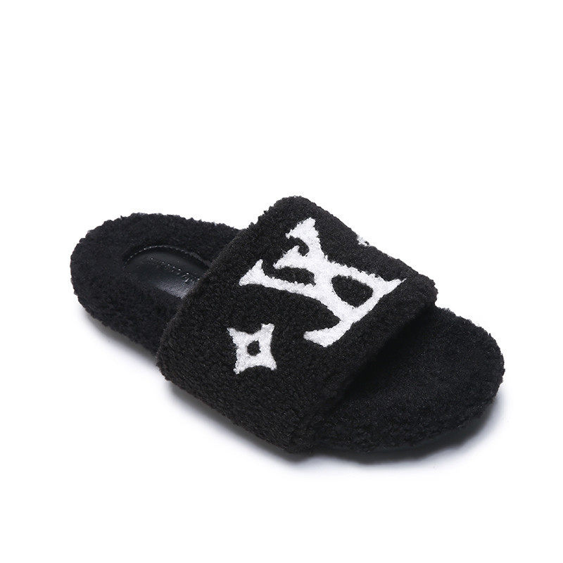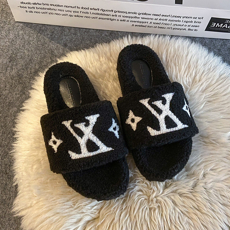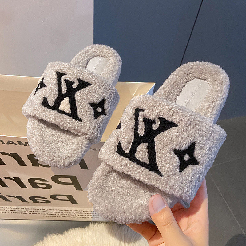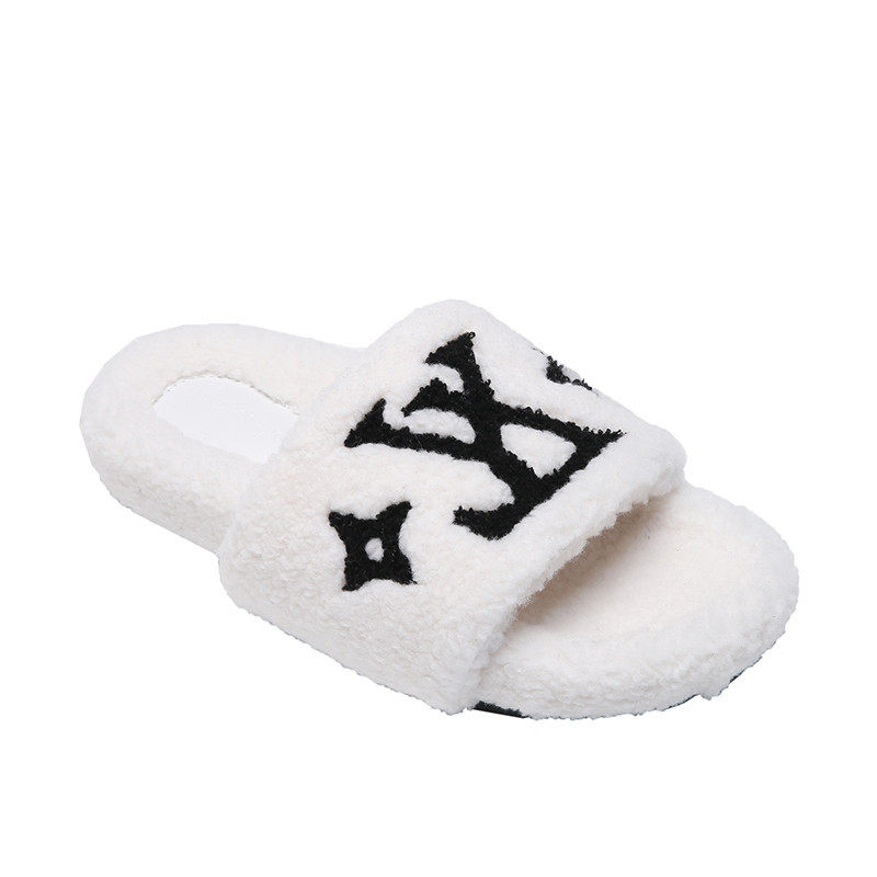 Influencer Picks Furry Slippers for Women 2025 New Autumn and Winter Towel Embroidered Letters Warm Flats Furry Shoes for Outer Wear