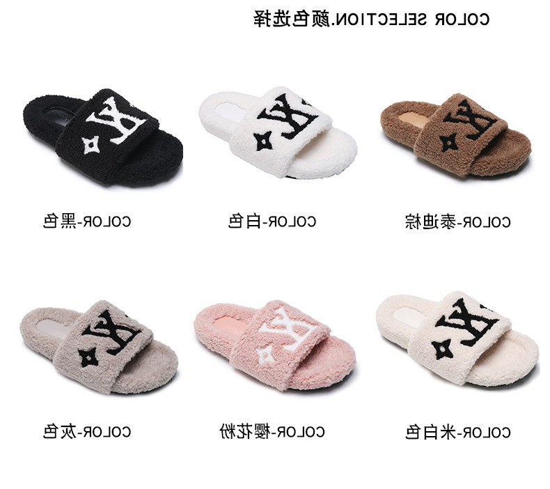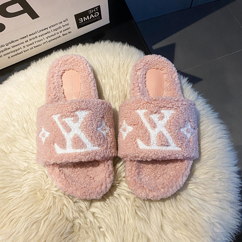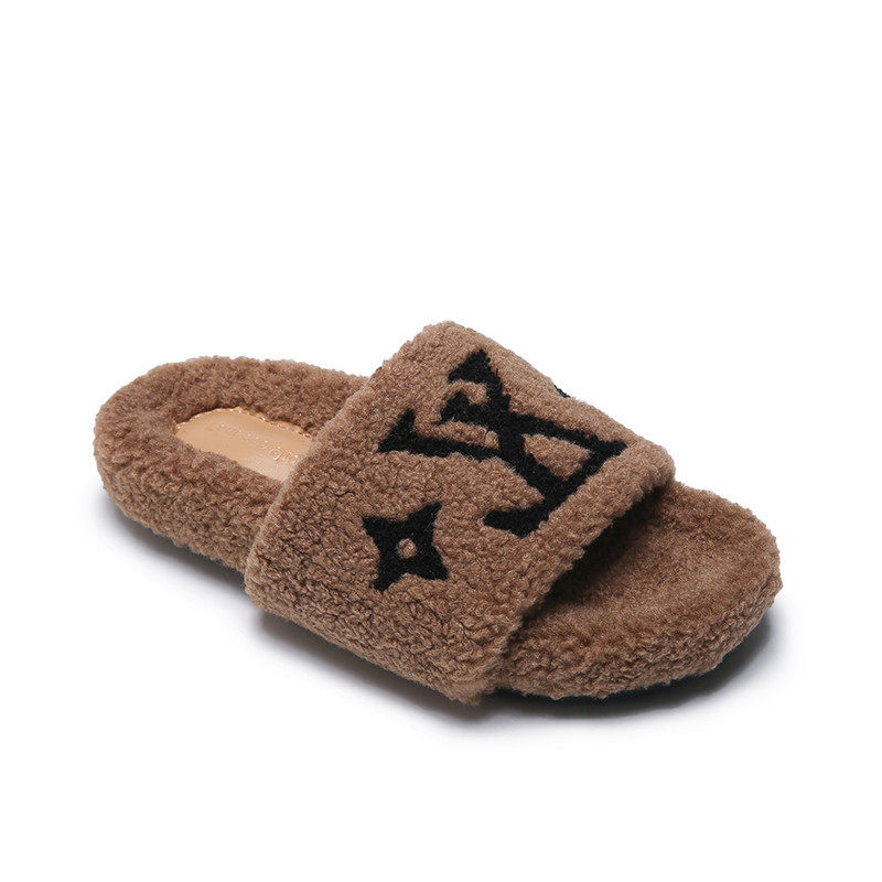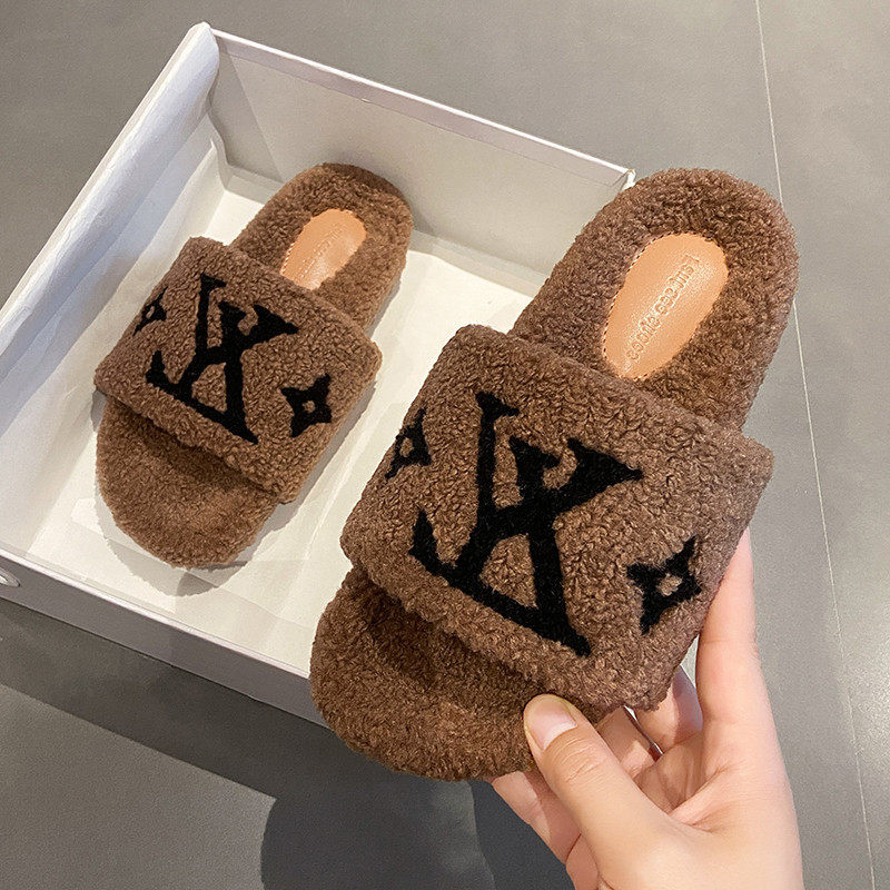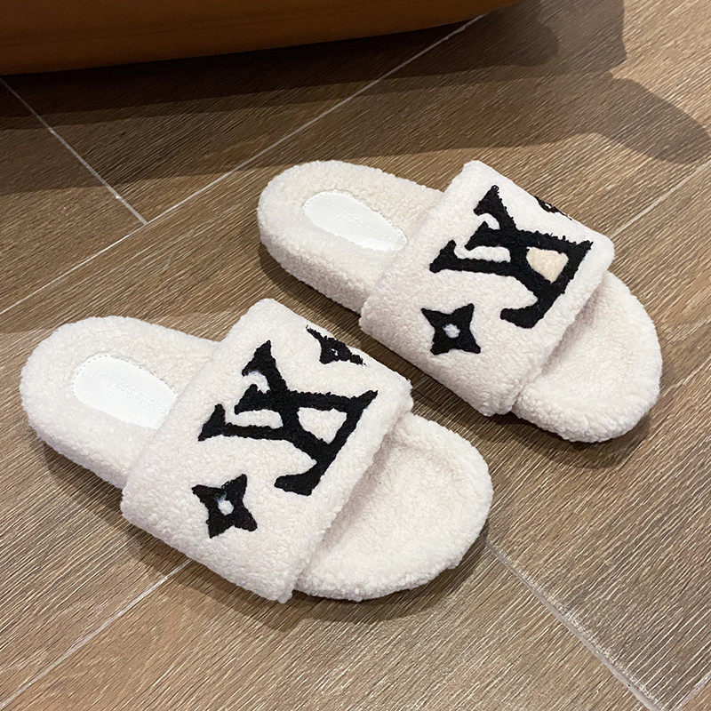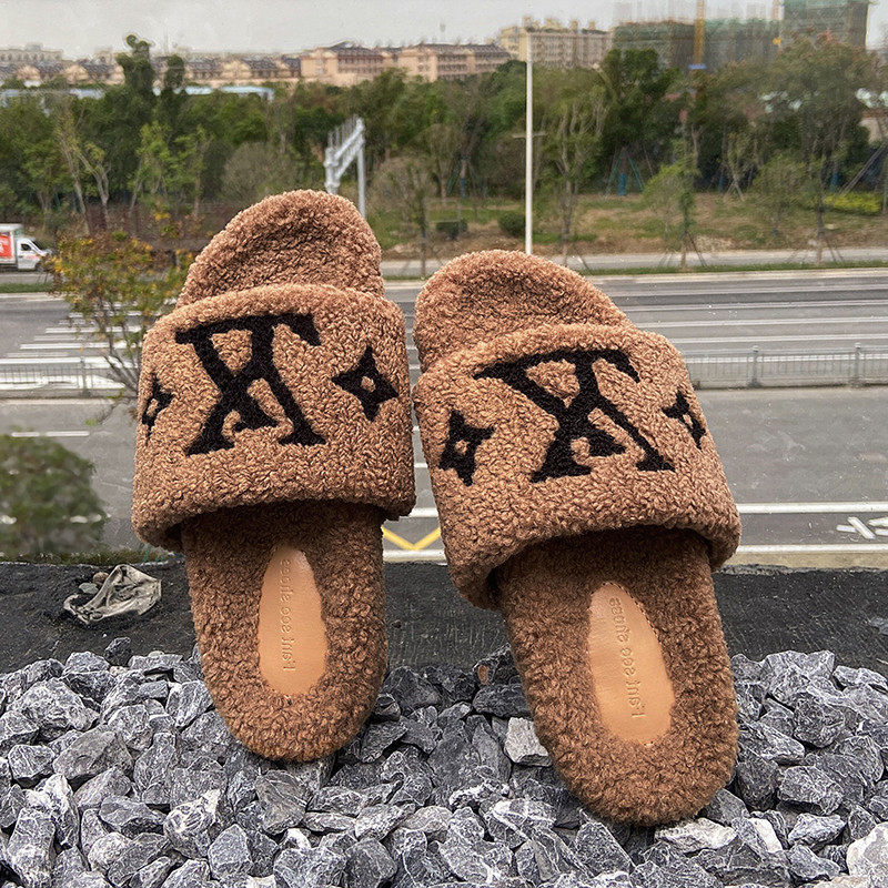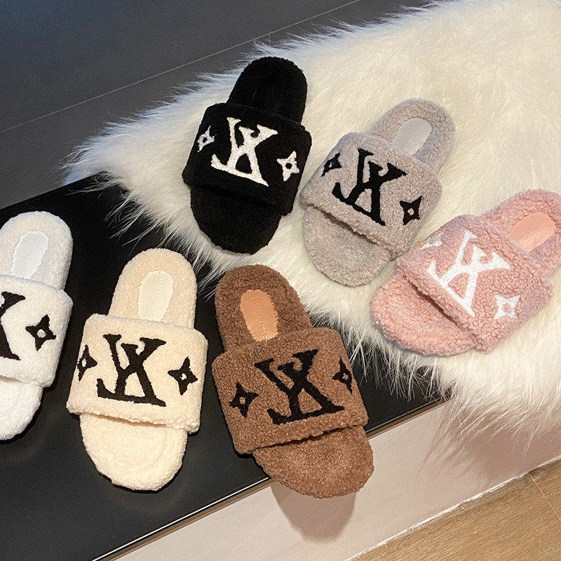 Influencer Picks Furry Slippers for Women 2025 New Autumn and Winter Towel Embroidered Letters Warm Flats Furry Shoes for Outer Wear
