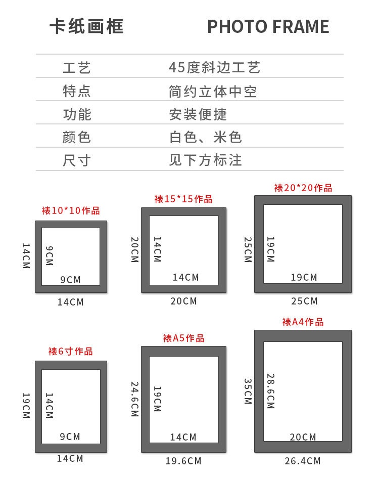 | Inner frame size | Mounted 10*10cm work with bracket,Mounted 6-inch work with stand,Mounted A5 work with stand,Mounted 15*15cm work with bracket,Mounted 20*20cm work with bracket,Mounting A4 work with stand,Customized other specifications |