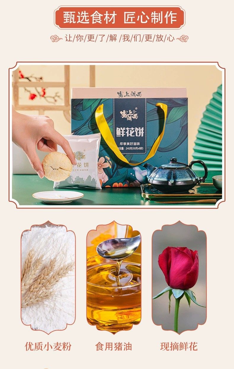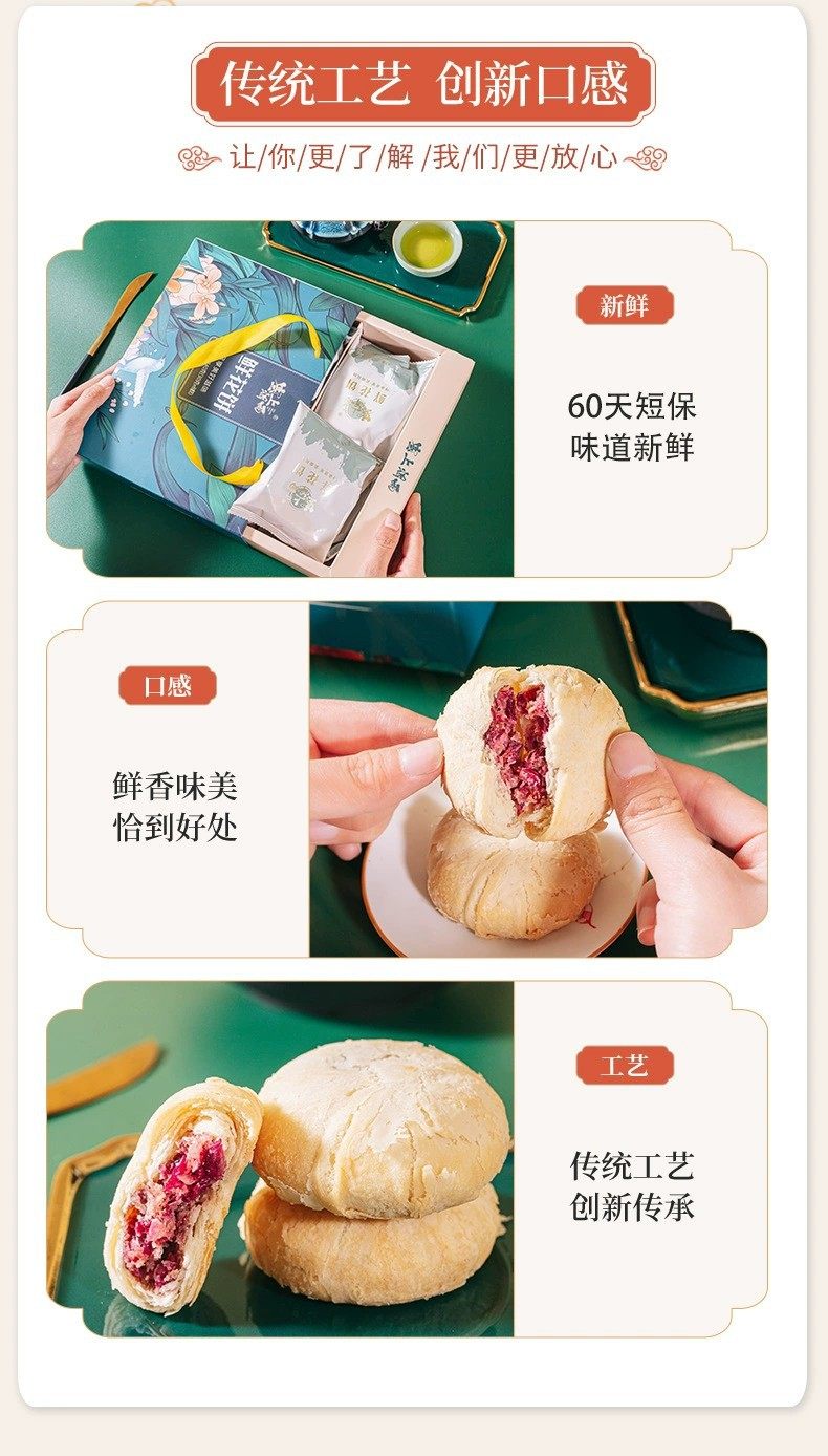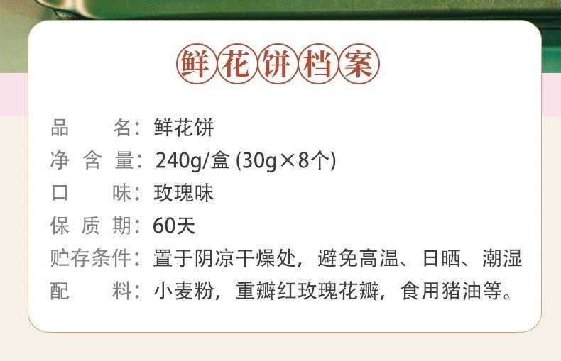 | Raw materials and ingredients | Wheat flour, double red rose petals, white sugar, malt syrup, edible lard, etc. |