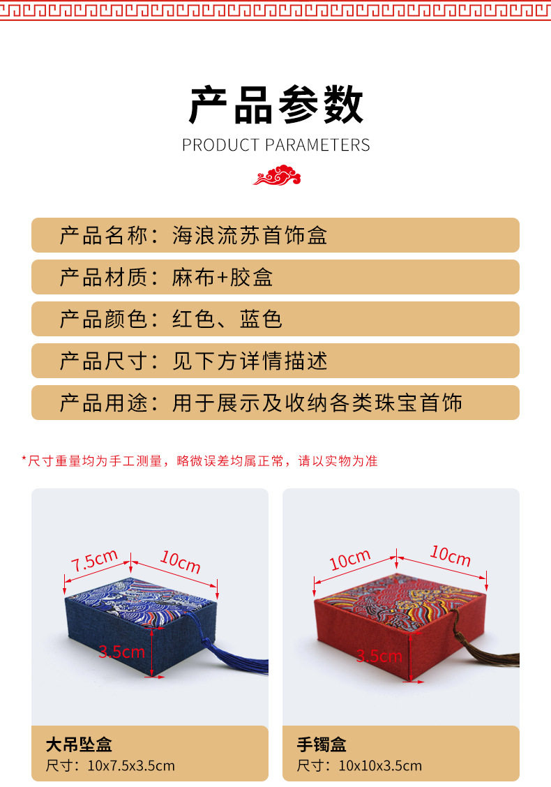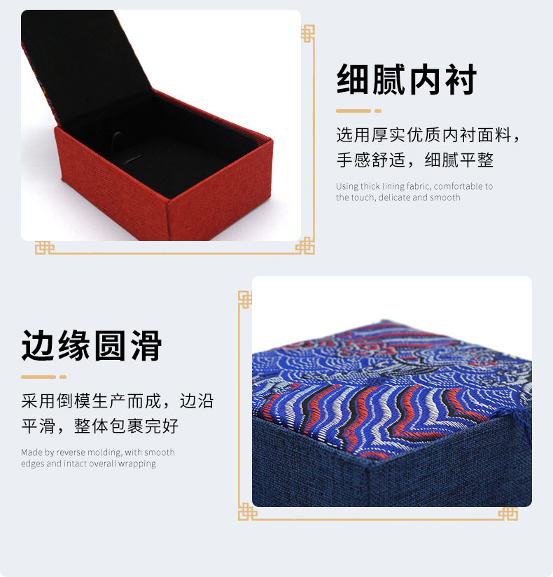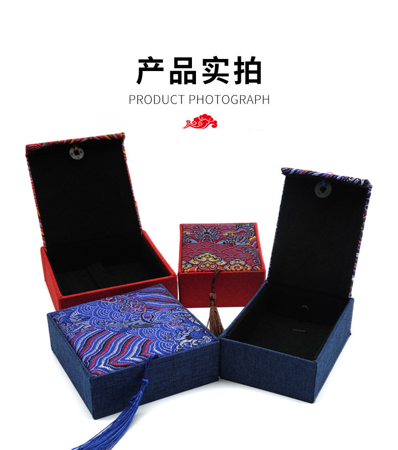 | Specifications and models | Red; yellow cloth bracelet box 10*10cm,Red; small pendant box 7x8x3cm,Red; large pendant box 7.5x10x3.5cm,Red; bracelet box 10x10x3.5cm,Blue; yellow cloth bracelet box 10*10cm,Blue; ring box 5x6x3.7cm,Blue; small pendant box 7x8x3cm,Blue; large pendant box 7.5x10x3.5cm,Blue; bracelet box 10x10x3.5cm,Sky blue; ring box 5x6x3.7cm,Sky blue; small pendant box 7x8x3cm,Sky blue; large pendant box 7.5x10x3.5cm,Sky blue; bracelet box 10x10x3.5cm,Gold; ring box 5x6x3.7cm,Gold; small pendant box 7x8x3cm,Gold; large pendant box 7.5x10x3.5cm,Gold; bracelet box 10x10x3.5cm,Red wave pattern surface + shaped pattern box; large pendant box 7.5x10x3.5cm,Red wave pattern surface + shaped pattern box; bracelet box 10x10x3.5cm |