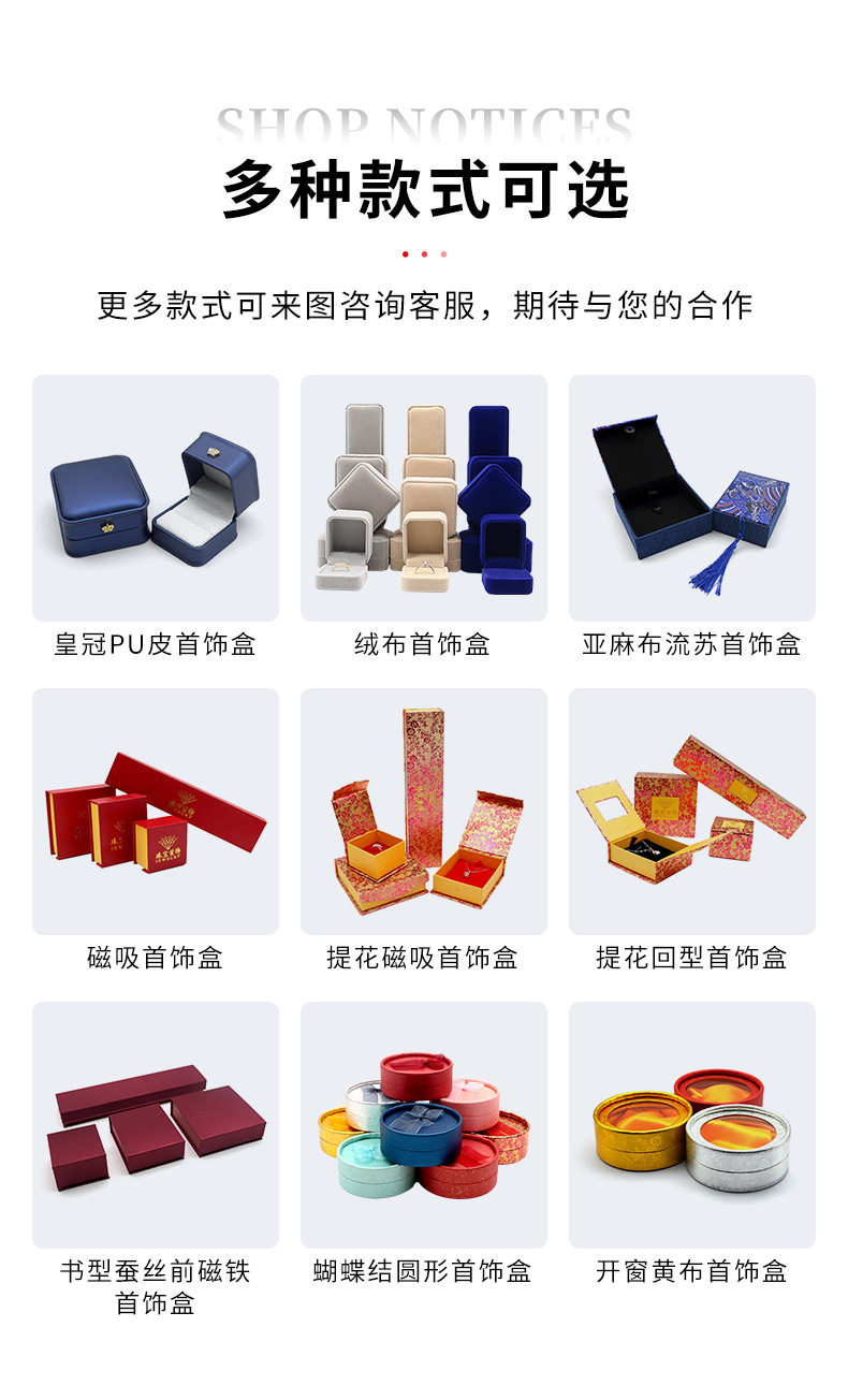 | Specification | Ring box 5x6x3.7cm,Small pendant box 7x8x3cm,Yellow cloth bracelet box 10*10cm,Bracelet box 10x10x3.5cm,Large pendant box 7.5x10x3.5cm |