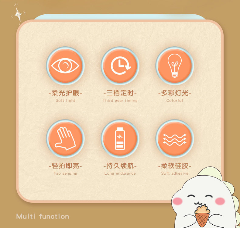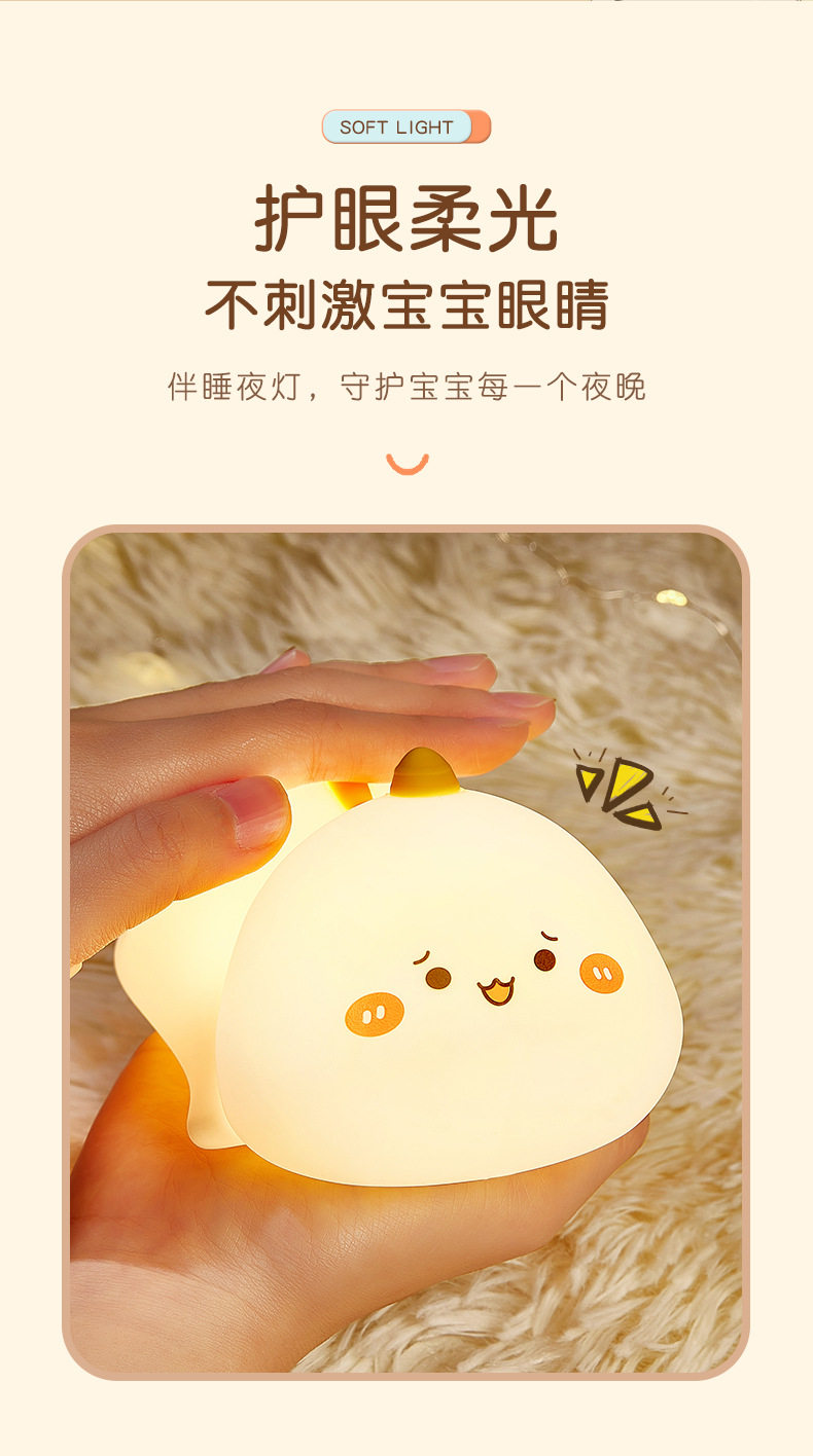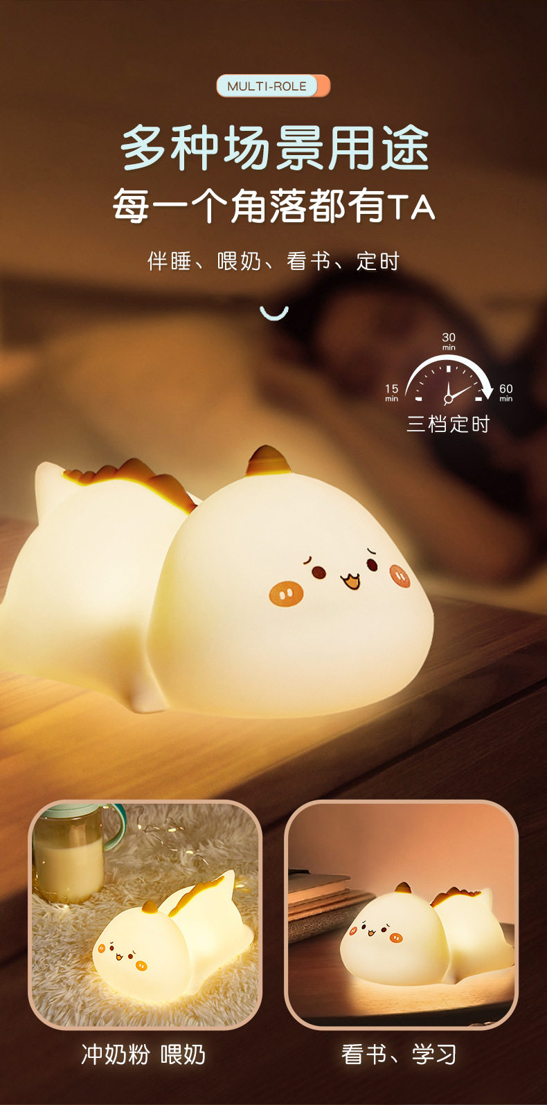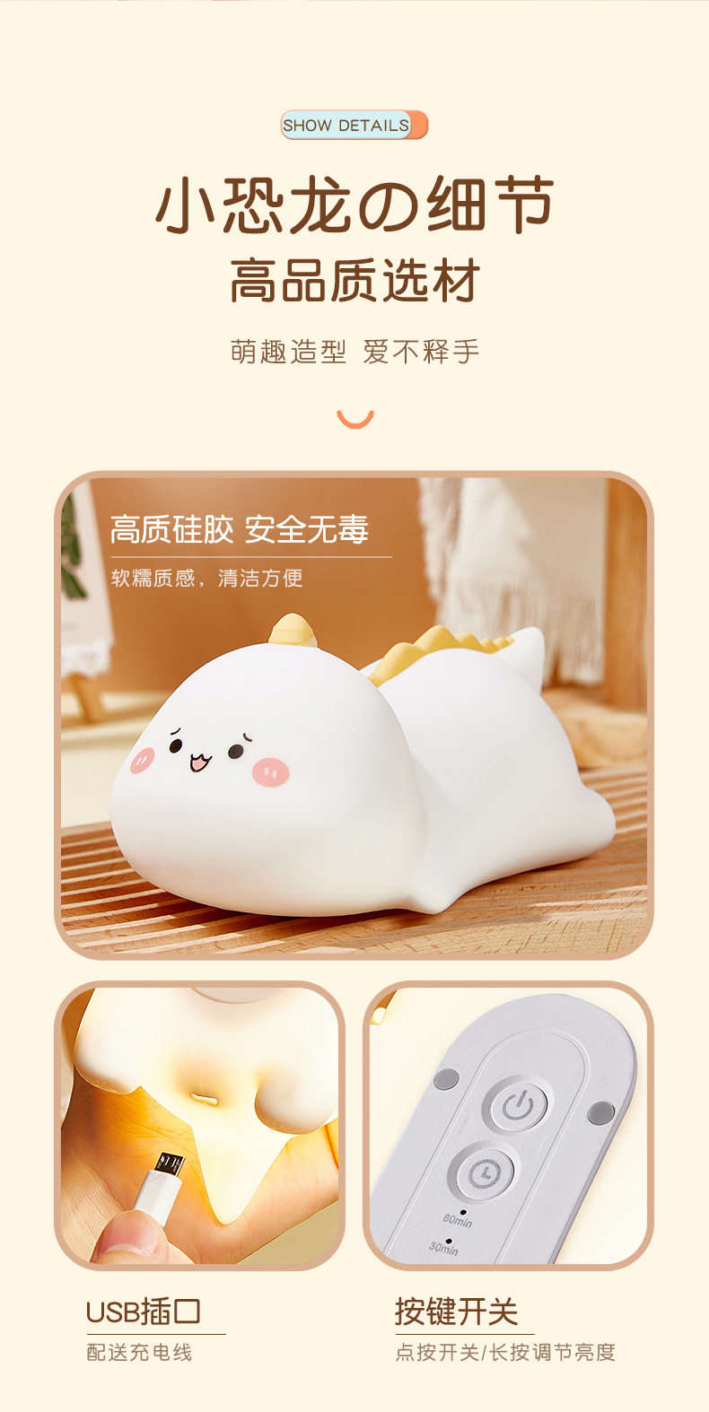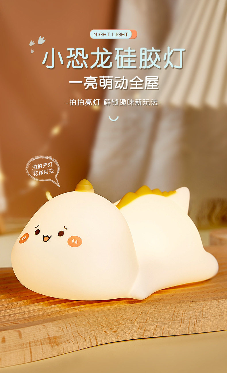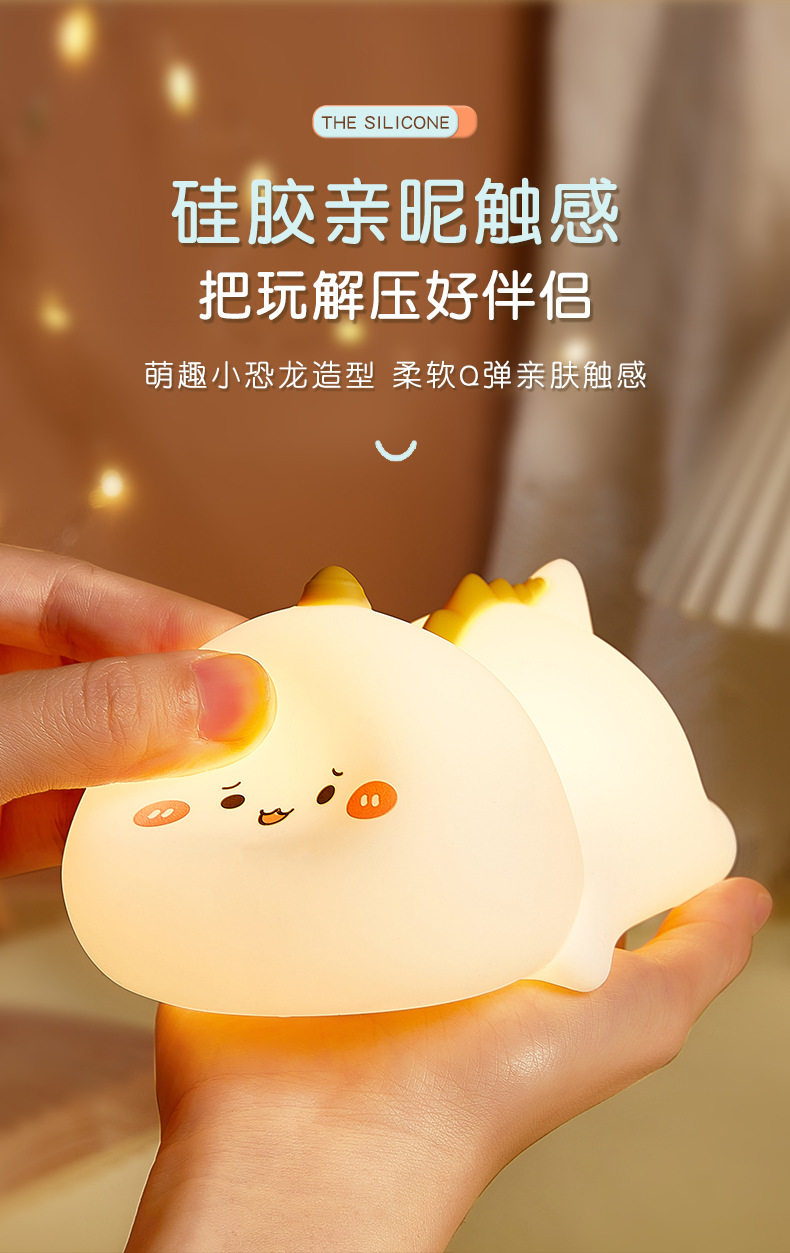 Little Dinosaur Silicone Tap Light with Three-Level Timer, USB Rechargeable Silicone Night Light, Seven-Color Gradient Tap Light Factory